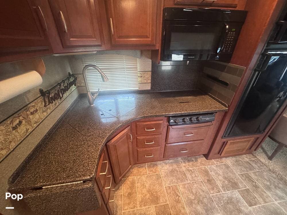 The kitchen is thoughtfully laid out with ample counter space, cabinetry, and residential-style functionality, making meal prep easy whether you're on the road or parked for the season.