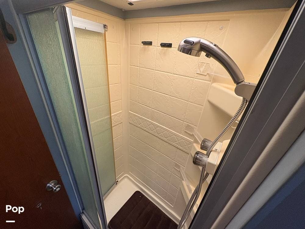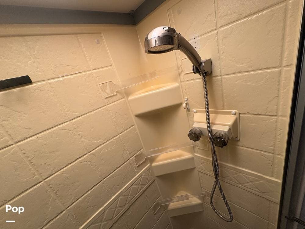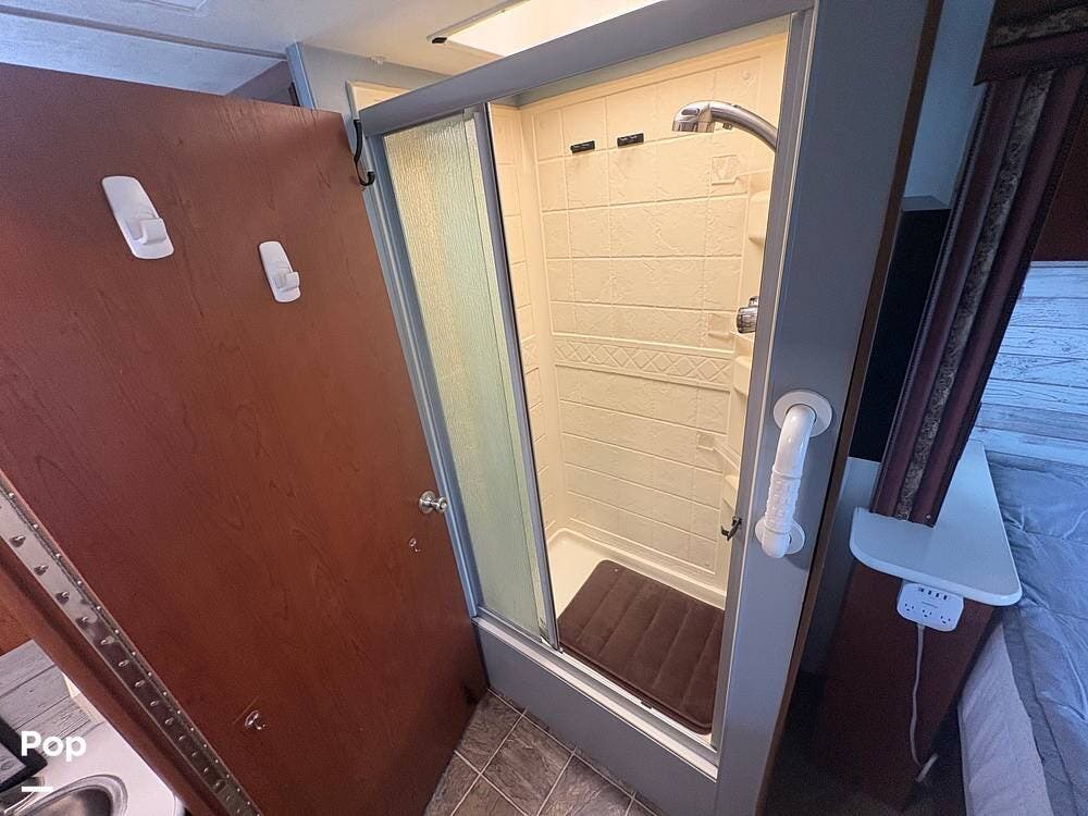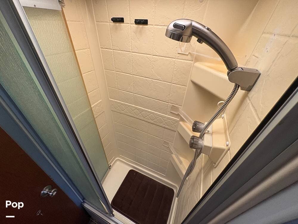 The mid coach bathroom features a shower with a skylight, which is separate from the sink and toilet, allowing you to use the bathroom while the shower is in use.