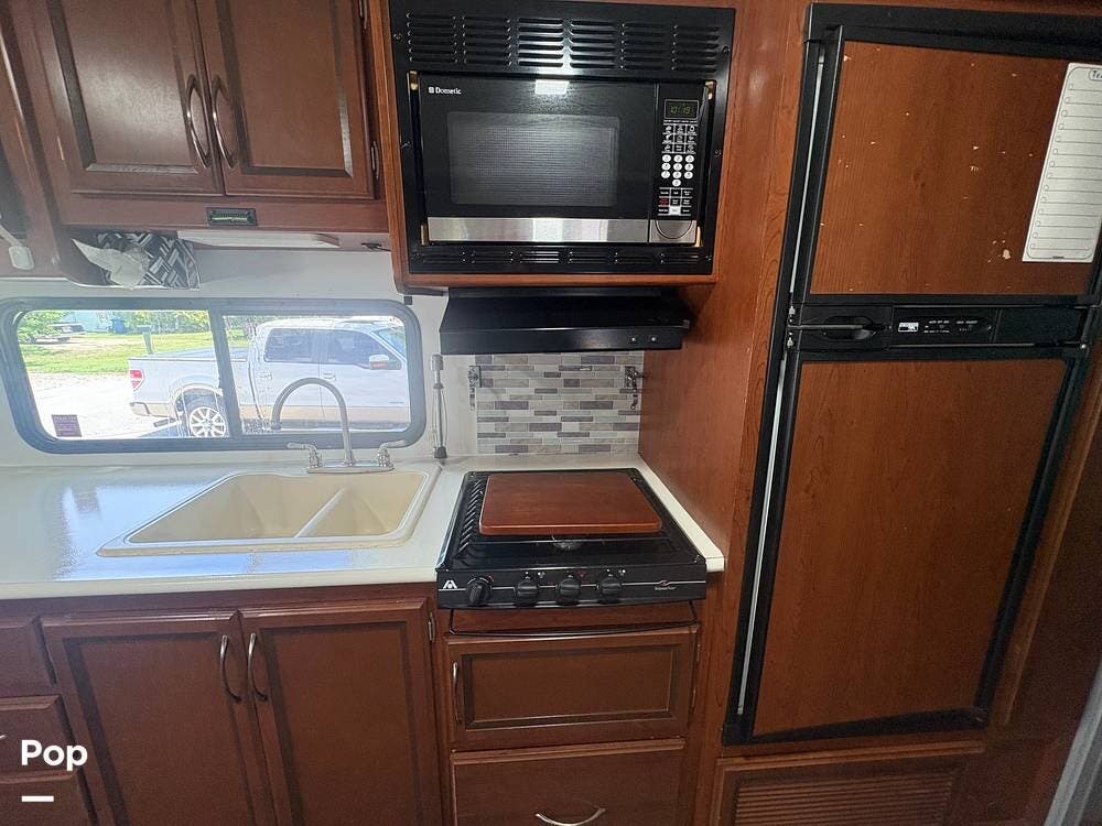 The kitchen is fully equipped with a three-burner range, oven, microwave, double sink, and large refrigerator, making it easy to prepare meals on the go.