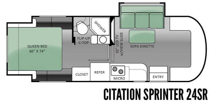 Sitting atop a Mercedes Sprinter 3500 chassis with a 188 hp diesel Mercedes-Benz 3.0L V-6 best-in-class MPG-rated engine this 2013 Citation 24SR Compact Class C by Thor Motor Coach has lots of space for your family, friends, and all your camping gear.