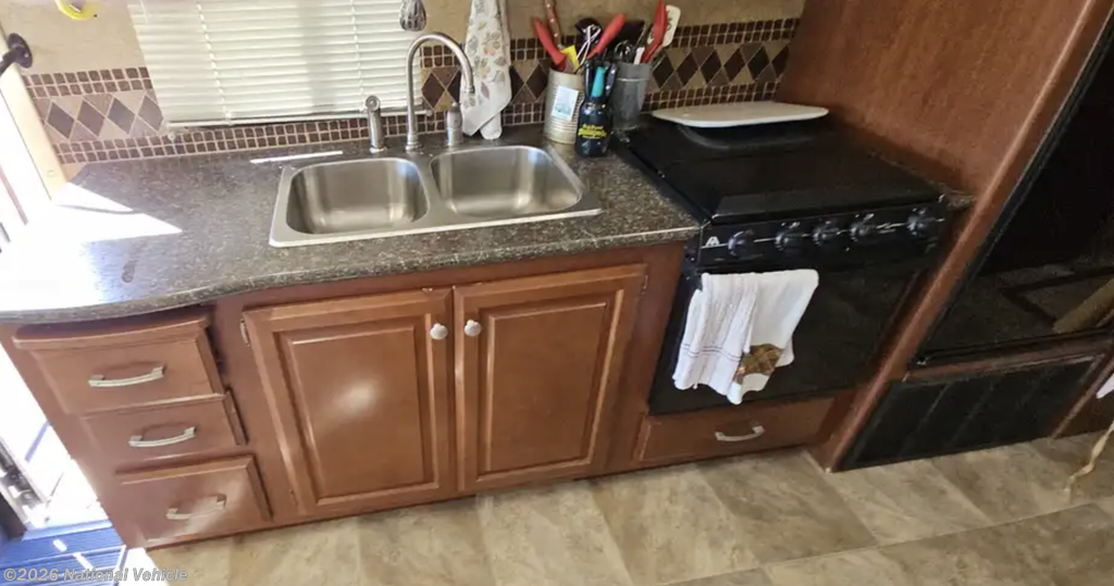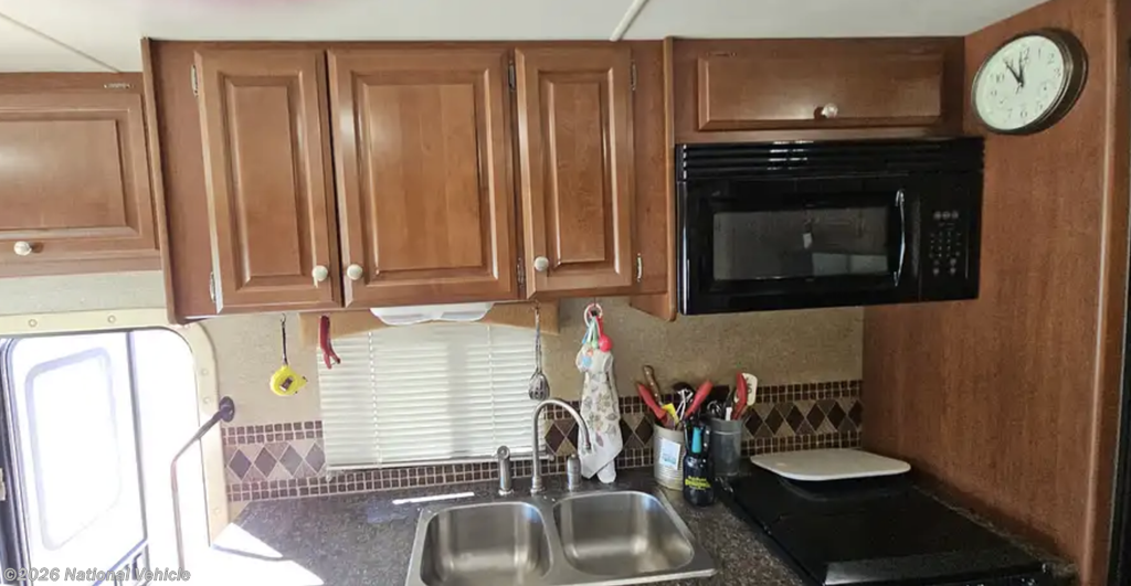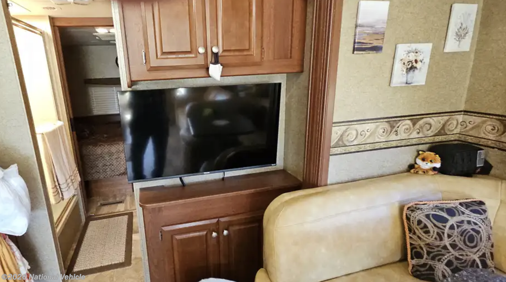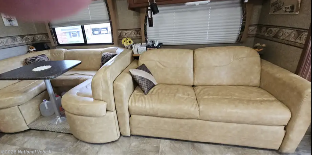 The main living space features a comfortable sofa, convertible dinette, large windows, and two TVs for entertainment whether you're relaxing in the living area or unwinding in the bedroom. The kitchen includes solid surface countertops, a three-burner cooktop, microwave, and a refrigerator that was replaced about two years ago, along with plenty of cabinet storage.