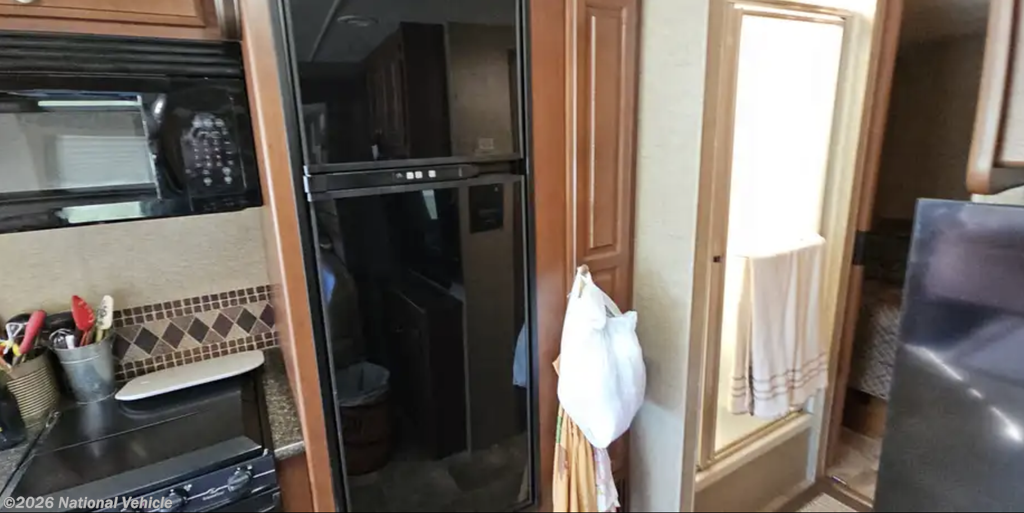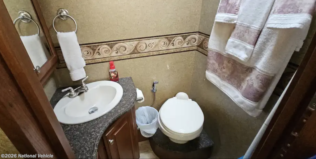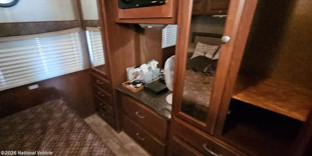 Toward the rear, the private bedroom features a walk-around queen bed, wardrobe storage, overhead cabinets, and a privacy door. The full bathroom includes a spacious shower, vanity, and storage for linens and toiletries.