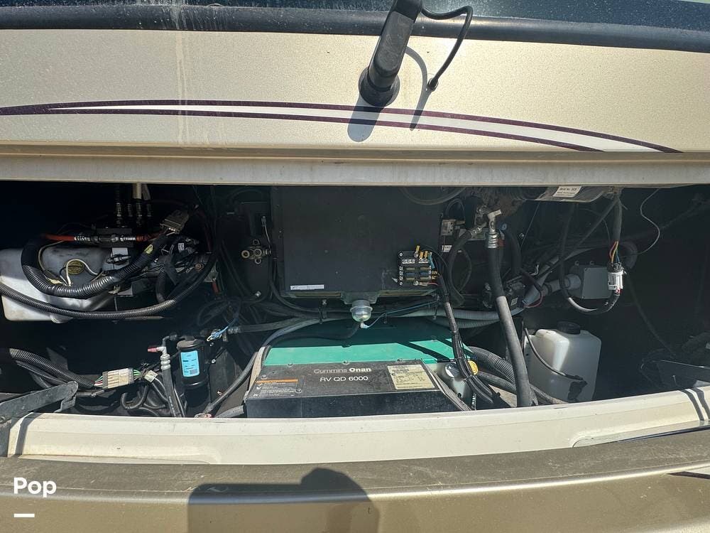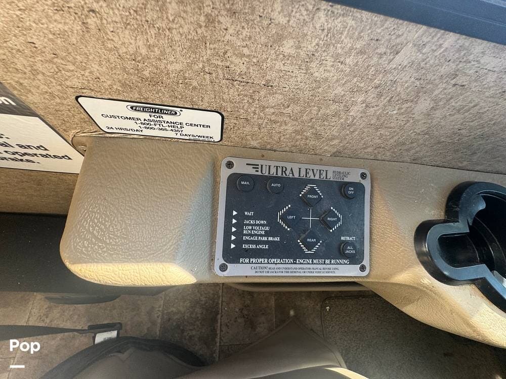 This RV boasts a sleek exterior with modern graphics and a strong, aerodynamic profile that enhances its visual appeal and driving performance. It is built on a Freightliner chassis, providing solid, reliable performance on the road. It is powered by a Cummins ISB 6.7L with 300 HP, delivering ample horsepower for long-distance travel.