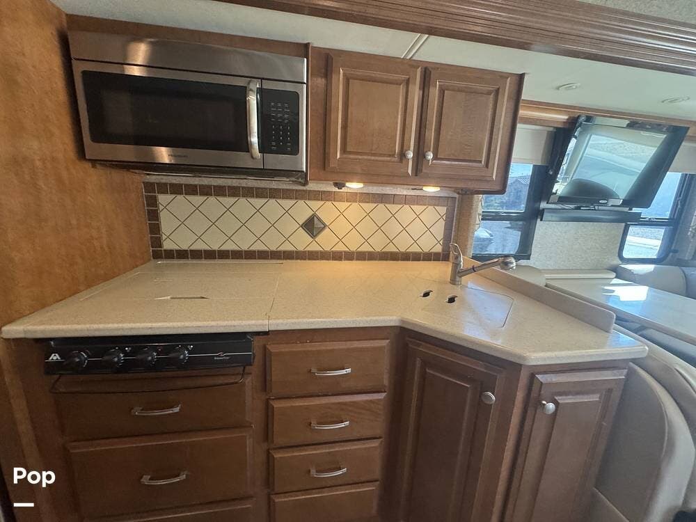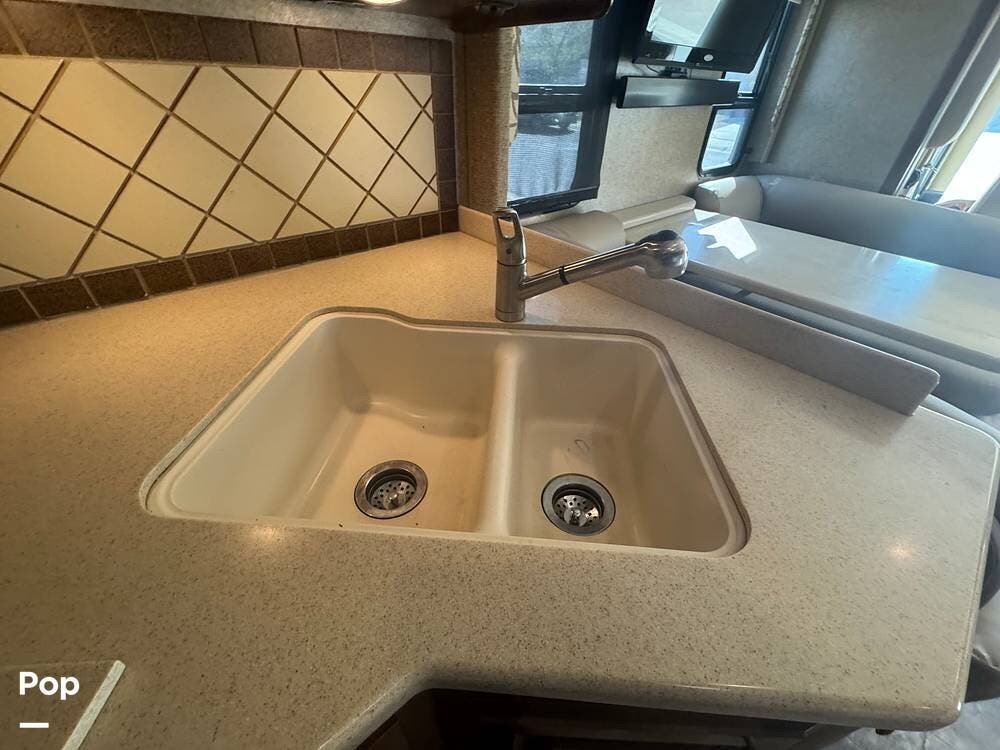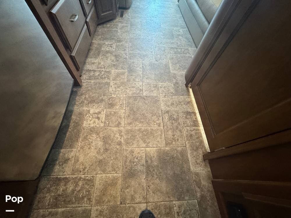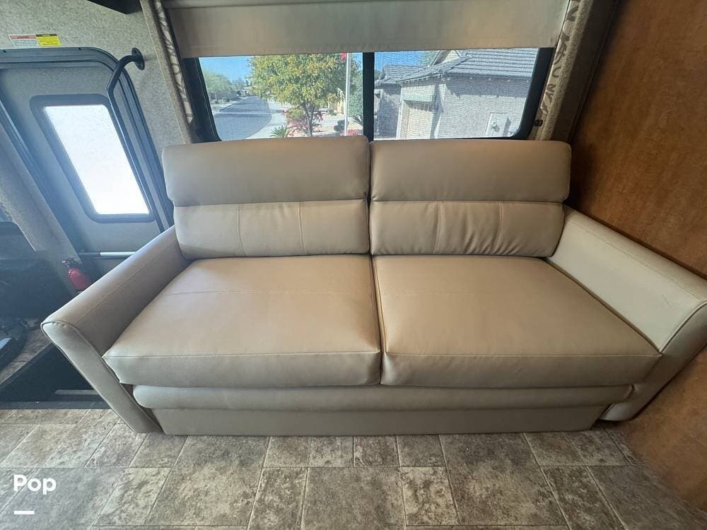 Inside, the 33.2 model is designed for comfort and convenience. It features a spacious and well-appointed living area with a large slide-out to expand the space and create a more open floor plan. The living area includes plush seating, often configured as a sofa and lounge chairs, and a large flat-screen TV for entertainment. The kitchen has high-end appliances, such as a convection microwave, refrigerator, stove, and ample counter space for preparing meals.