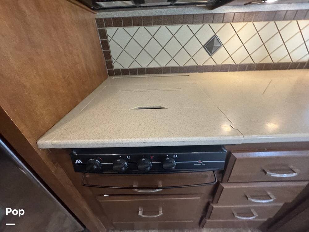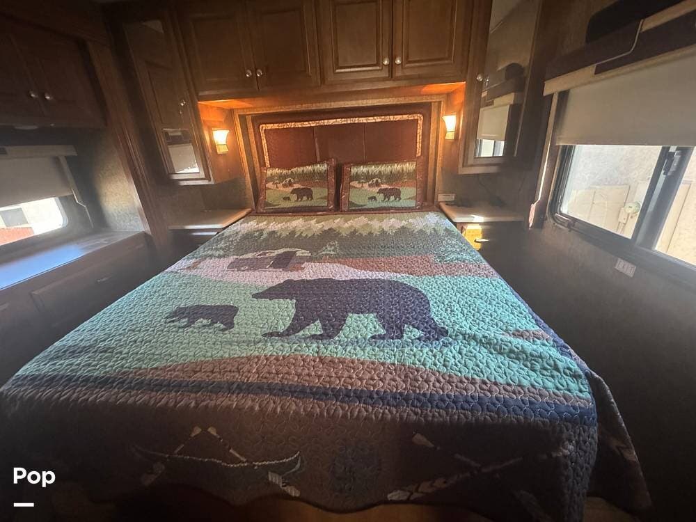 The 2013 Palazzo 33.2 emphasizes luxury and ease of use with high-quality materials like solid wood cabinetry, Corian countertops, and leather upholstery. In addition to its residential feel, it includes practical features like a generator, air conditioning, and a power awning, making it an ideal option for extended road trips or weekend getaways.