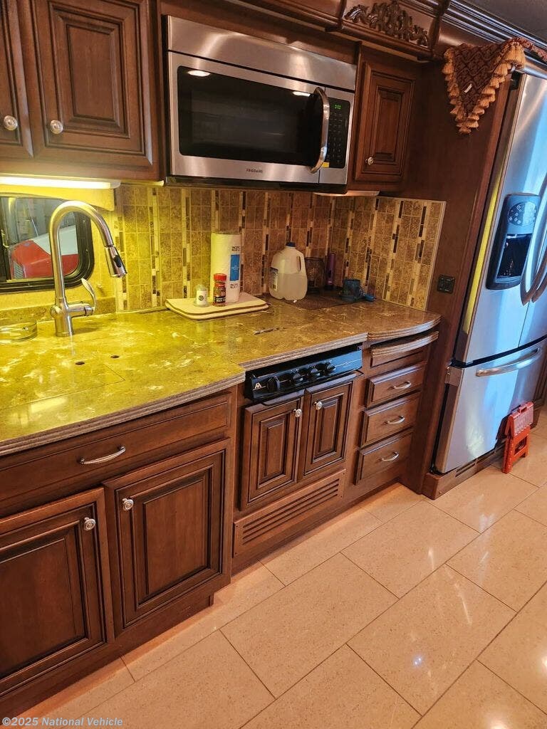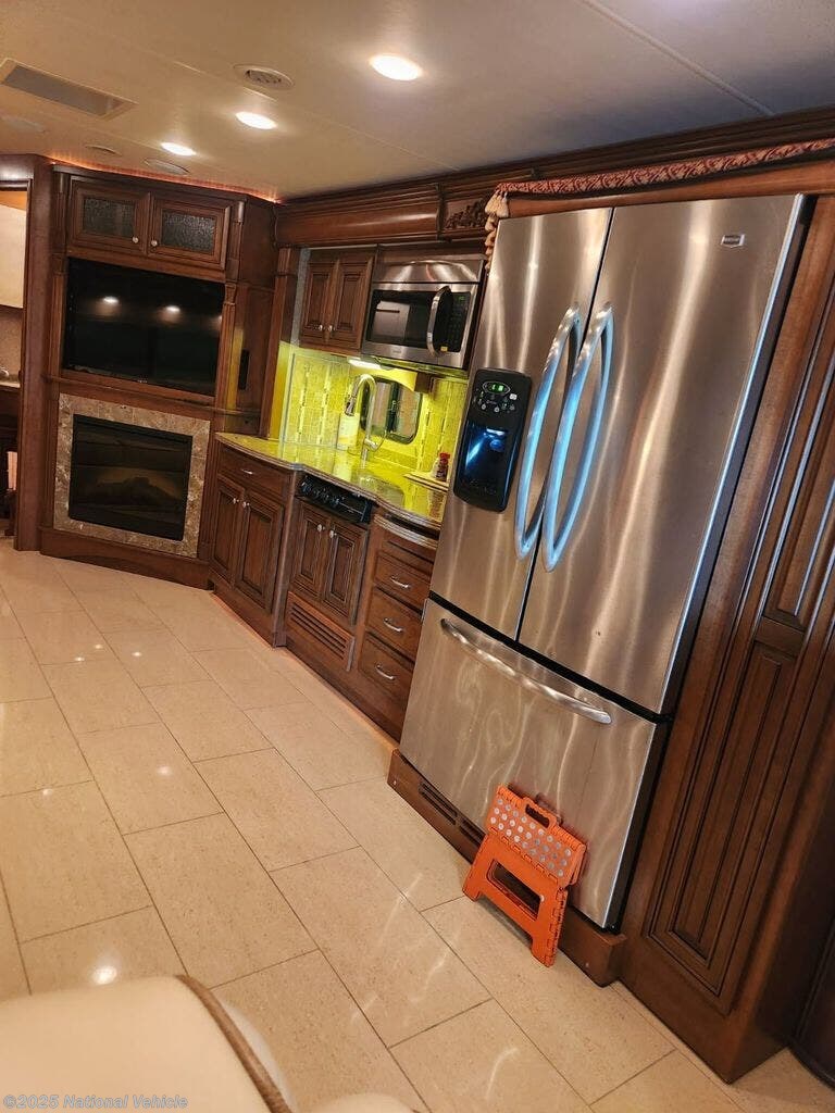 Inside, the 40FX offers a spacious, residential-style layout with four slide-outs, tile flooring, and high-end finishes throughout. The living area features an L-shaped leather couch that makes into a double bed, an electric fireplace, and a large flat-screen TV for relaxing in comfort. The gourmet kitchen comes fully equipped with solid-surface countertops, a residential French-door refrigerator, convection microwave, induction cooktop, and a pull-out pantry?perfect for cooking on the go.