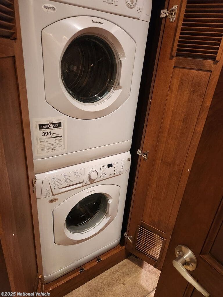 The rear master suite includes a king-size bed, large wardrobe, and a full en-suite bathroom with dual vanities, a glass shower, and a stackable washer and dryer. A convenient half bath mid-ship provides added comfort for guests. Outside, enjoy full-body paint, power awnings, basement pass-through storage, and an exterior entertainment center.