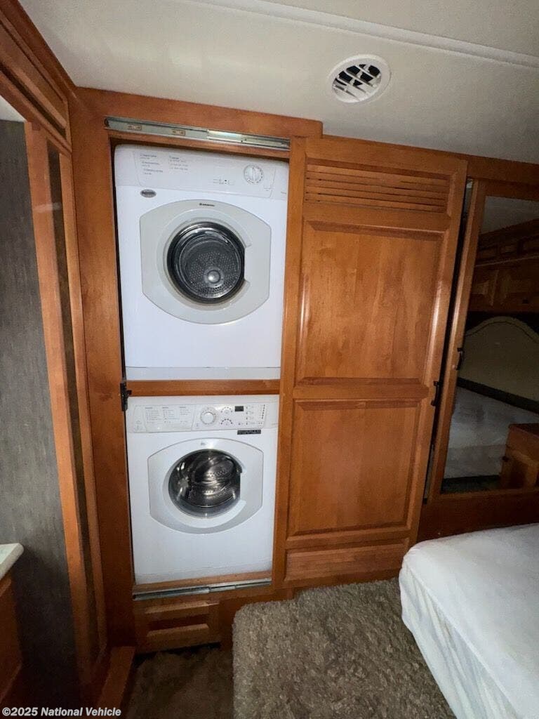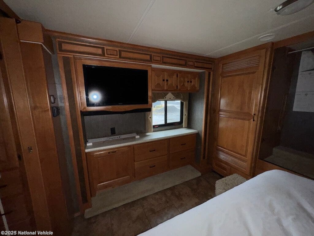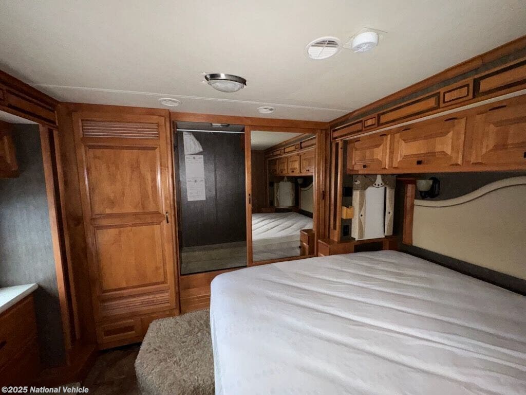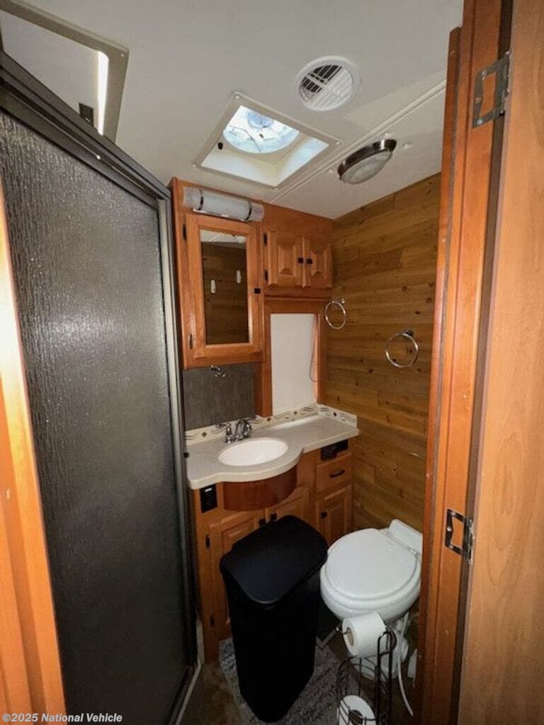 Toward the rear, the private bedroom provides a peaceful retreat with a walk-around king bed, wardrobe storage, overhead cabinets, and a dresser for extended travel needs. The split bathroom design features a spacious shower on one side and a private toilet and vanity area on the other?maximizing both space and convenience.