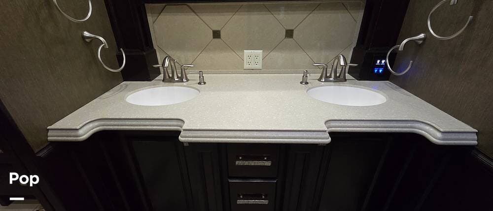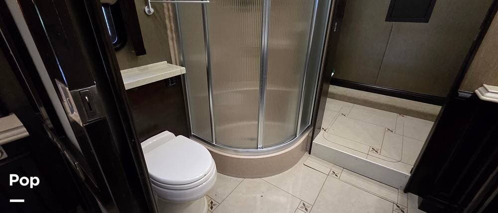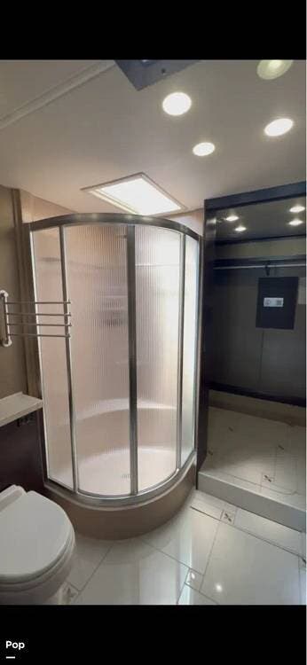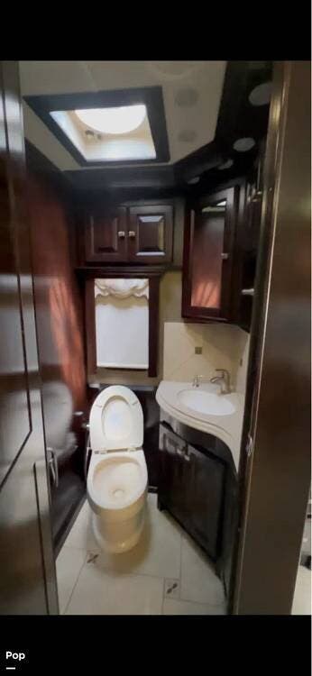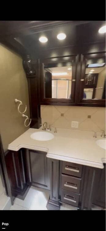 The master bathroom is in the rear of the coach and has a double sink, toilet, and a huge shower. The half bathroom has a sink and toilet.