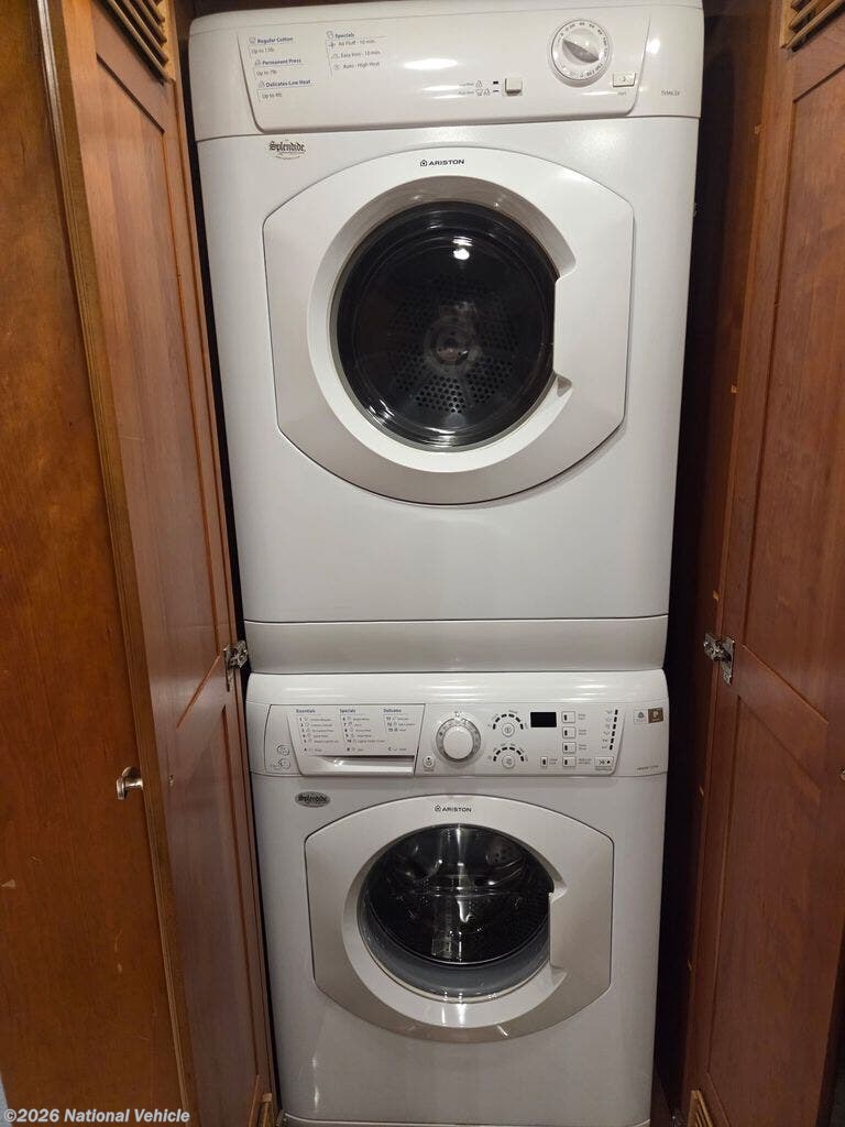 The master suite offers a private retreat with a king bed, large wardrobe, washer and dryer, and plenty of cabinet space, making it ideal for extended travel or full-time living. With multiple sleeping areas, this coach can comfortably accommodate guests while maintaining privacy and comfort.