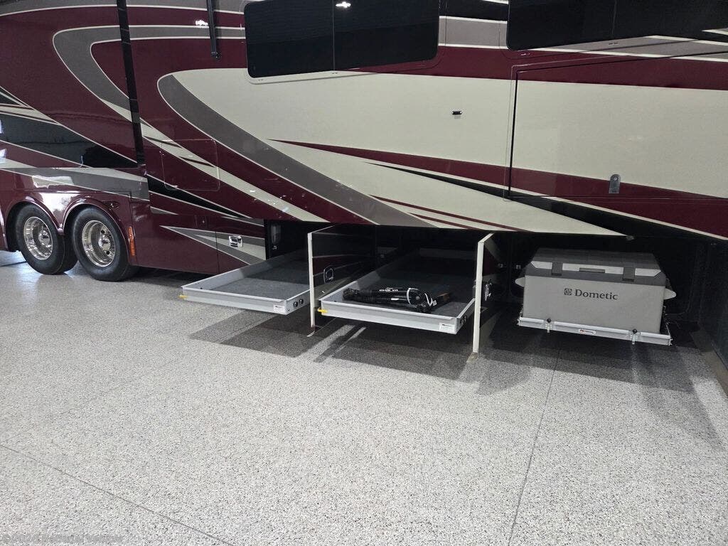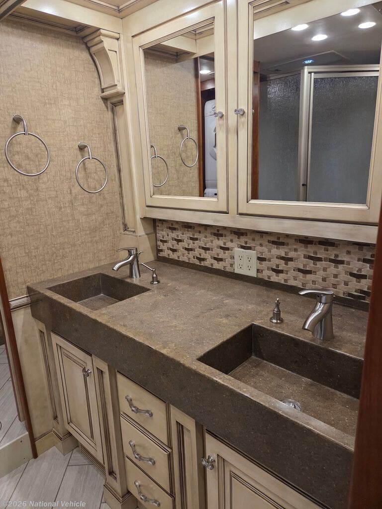 One of the standout features of the 45LP is its bath-and-a-half layout, providing convenience for both owners and guests. The mid-coach half bath is easily accessible, while the spacious rear master bathroom features a large glass-enclosed shower, dual sinks, premium fixtures, and exceptional storage.