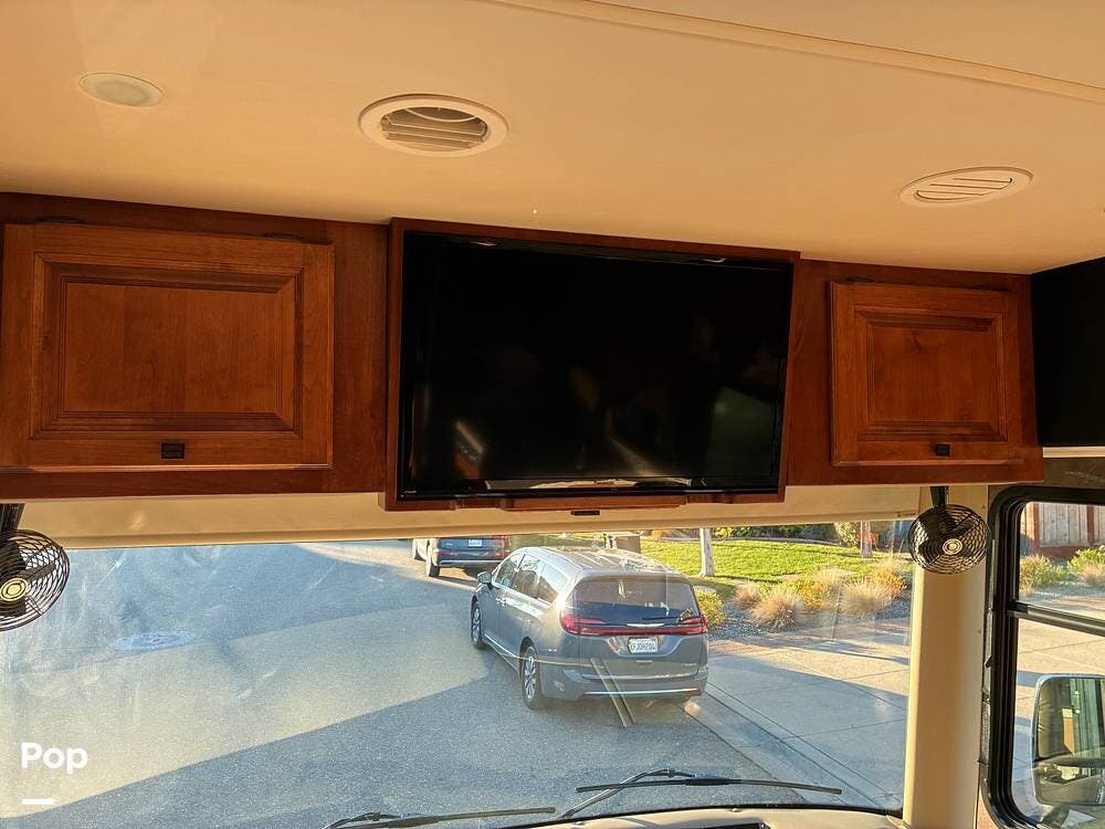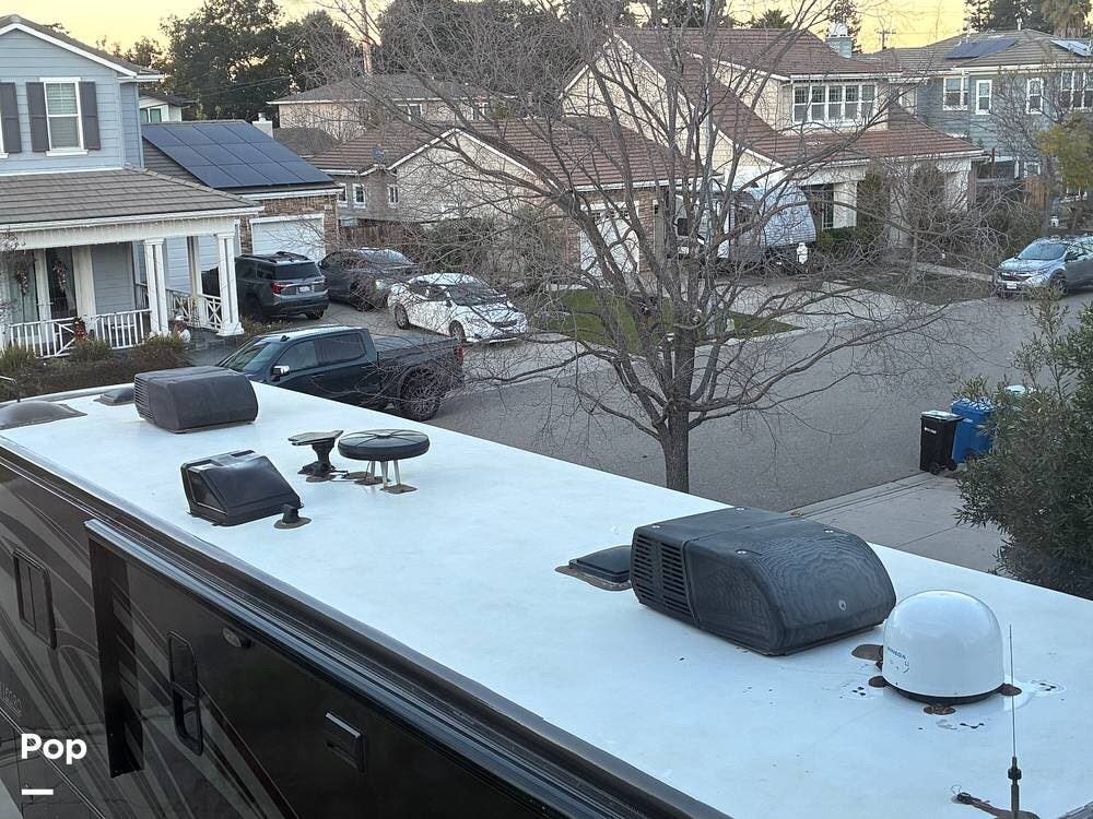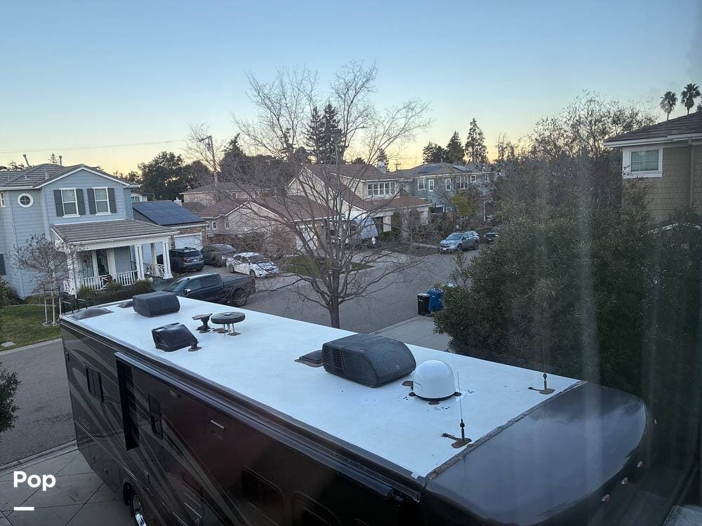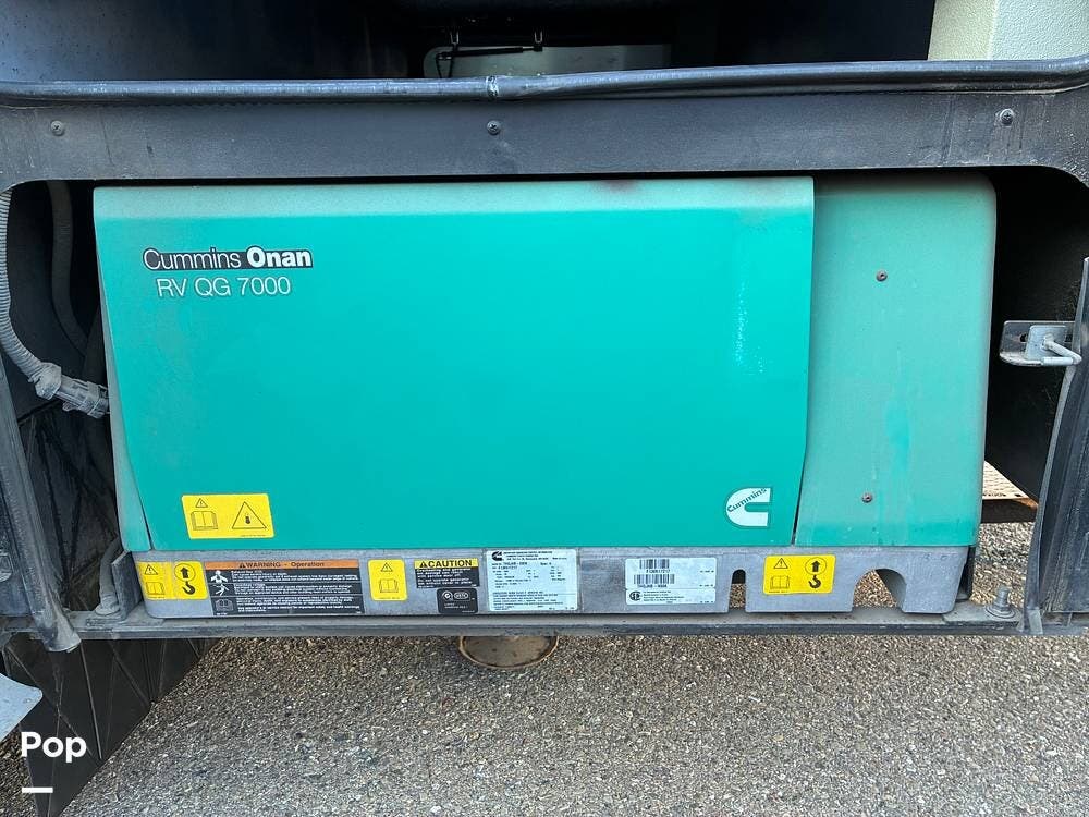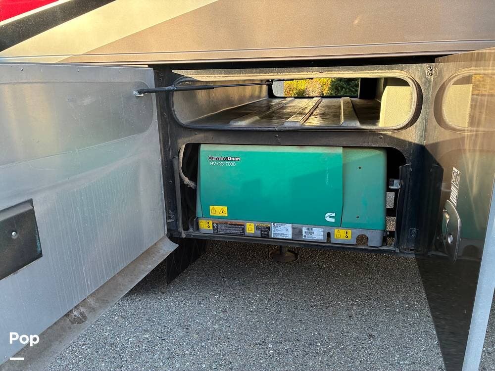 Exterior features include an outdoor TV for outdoor entertaining, ample basement storage for gear and travel essentials, and tires replaced in 2020. An Onan 5,500-watt generator provides reliable off-grid power, while a newly installed satellite dish enhances entertainment options whether parked or on the road.