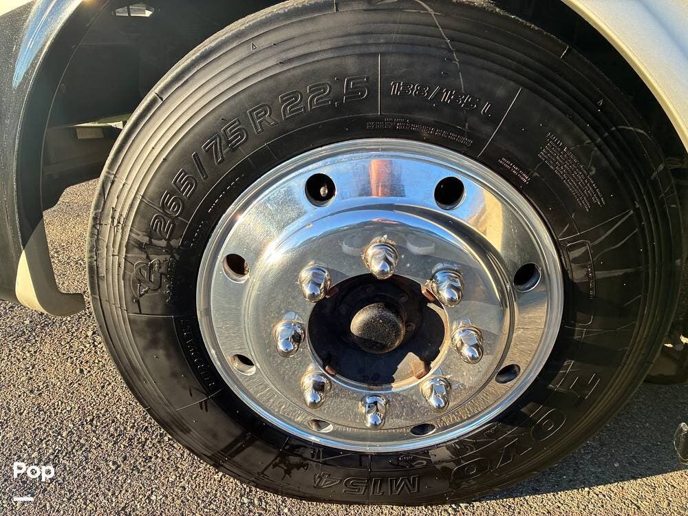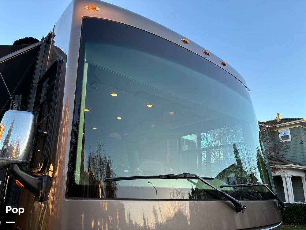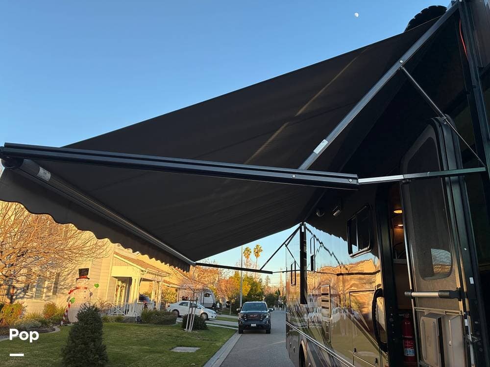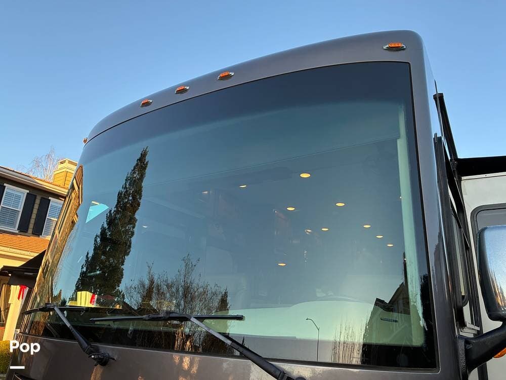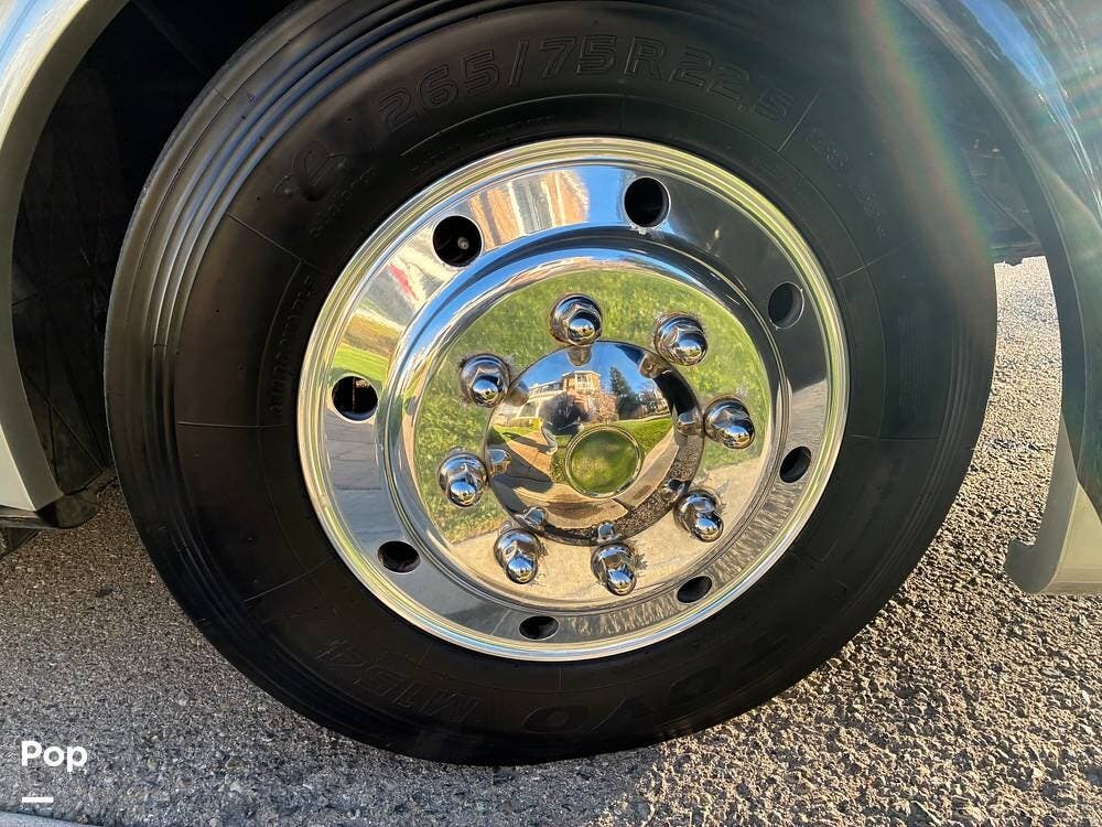 Exterior features include an outdoor TV for outdoor entertaining, ample basement storage for gear and travel essentials, and tires replaced in 2020. An Onan 5,500-watt generator provides reliable off-grid power, while a newly installed satellite dish enhances entertainment options whether parked or on the road.