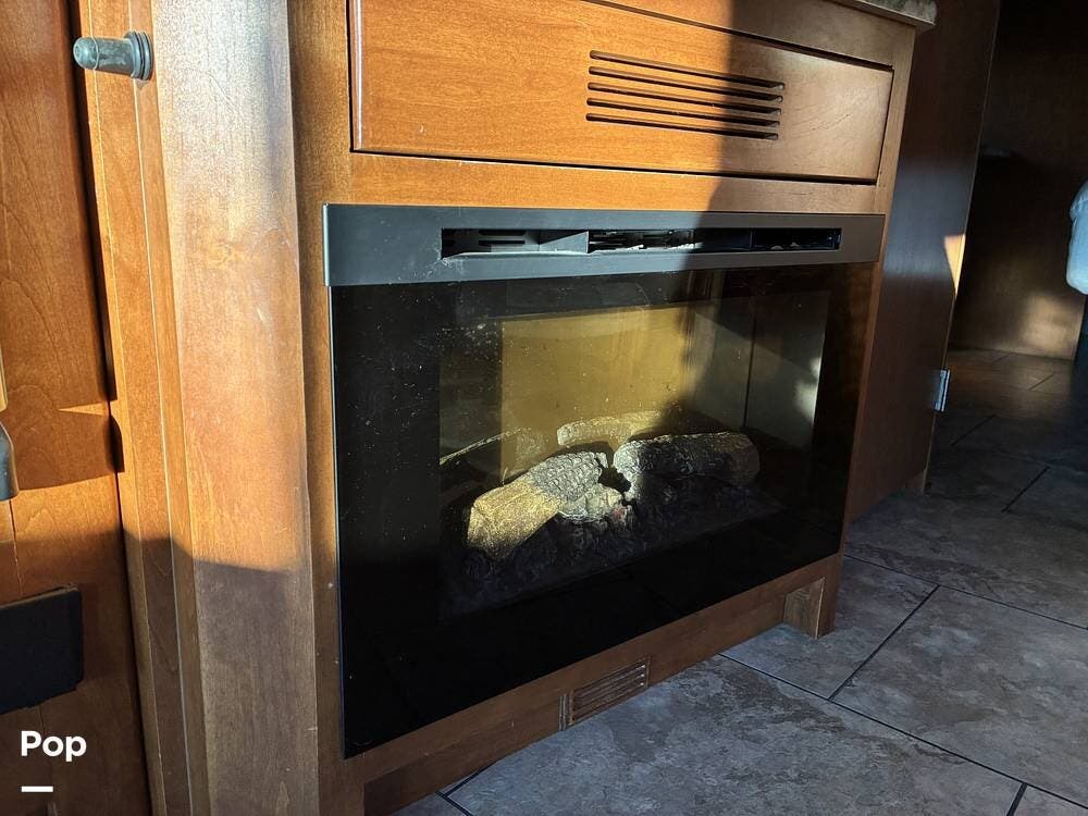 The living area, the sofa, and the dinette have been reupholstered, giving the interior a refreshed, updated feel. A front-mounted TV provides excellent viewing from the main seating area, while the fireplace option adds both ambiance and supplemental heat, making the space comfortable in cooler weather. This area easily converts to additional sleeping space when needed, complementing the overall sleeping capacity up to 6.