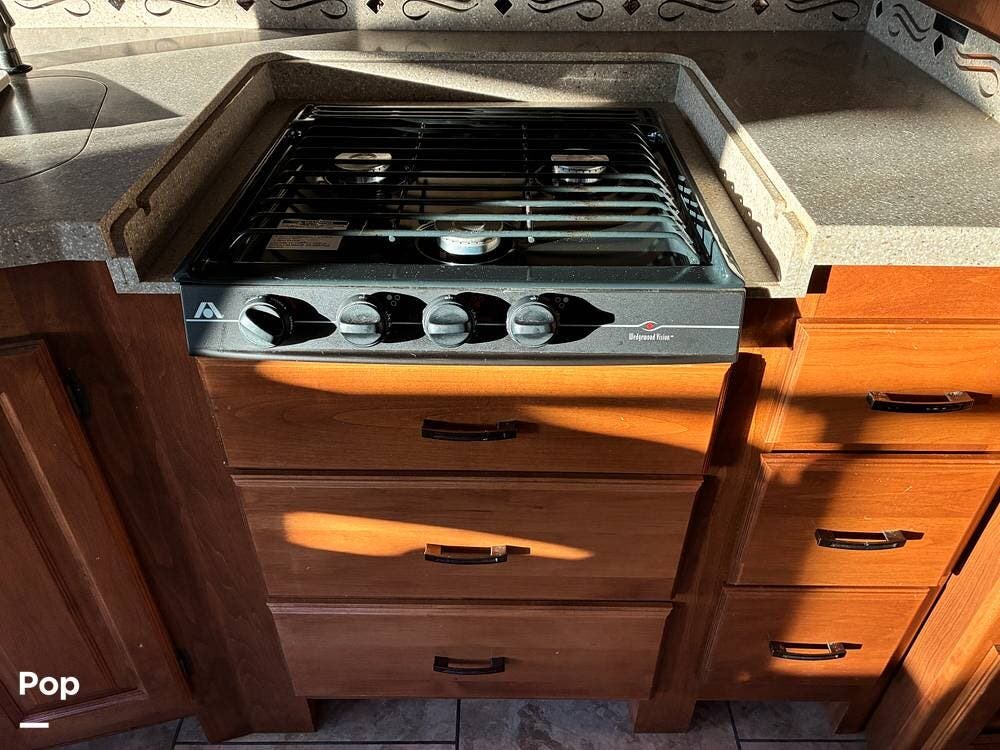 The kitchen features solid-surface countertops, ample cabinetry, and generous counter space for meal prep. A residential-style layout offers a microwave, 3-burner stove with oven, and an 8 Cubic Foot Refrigerator/Freezer. The dining area is conveniently positioned adjacent to the kitchen, making it ideal for everyday meals or hosting guests.
