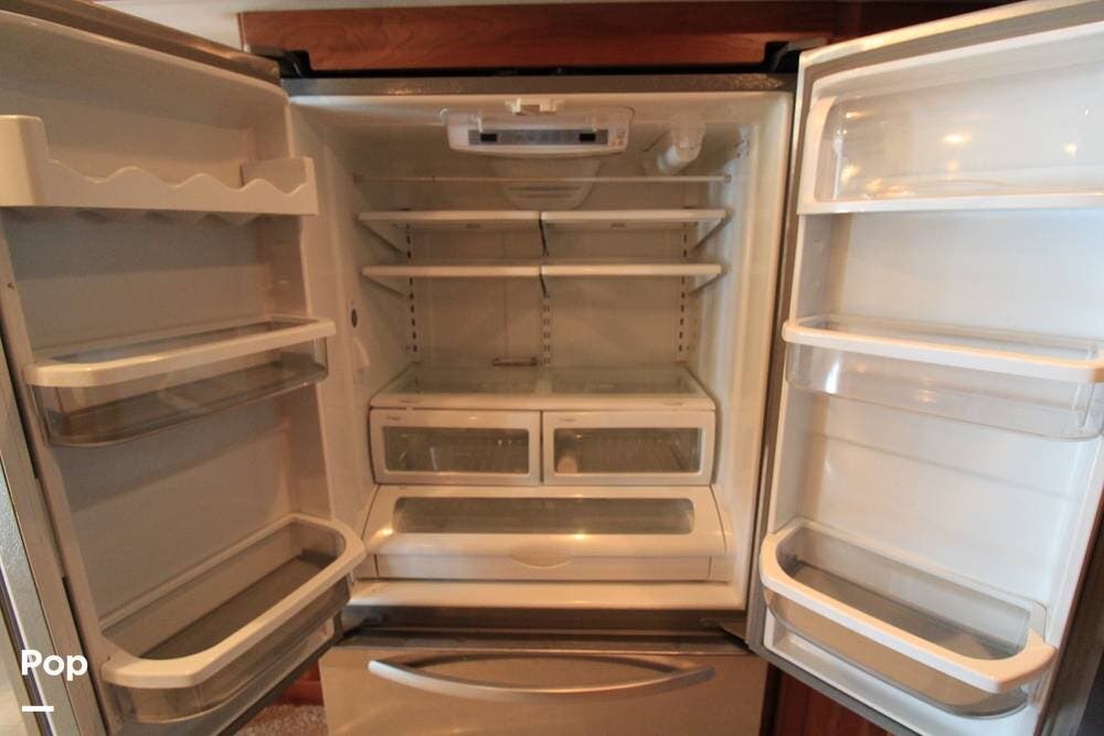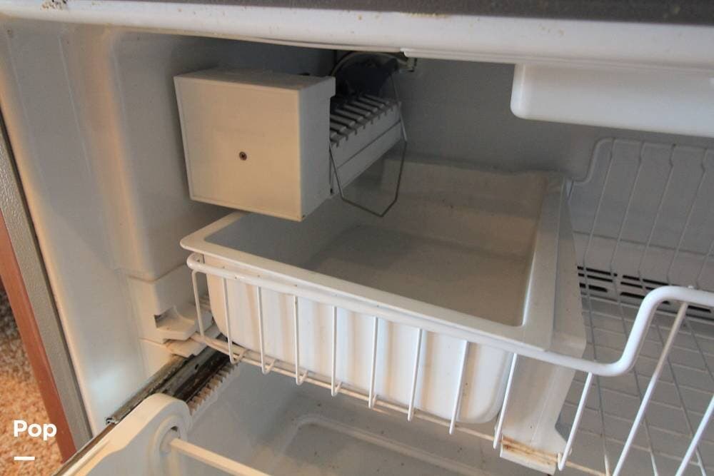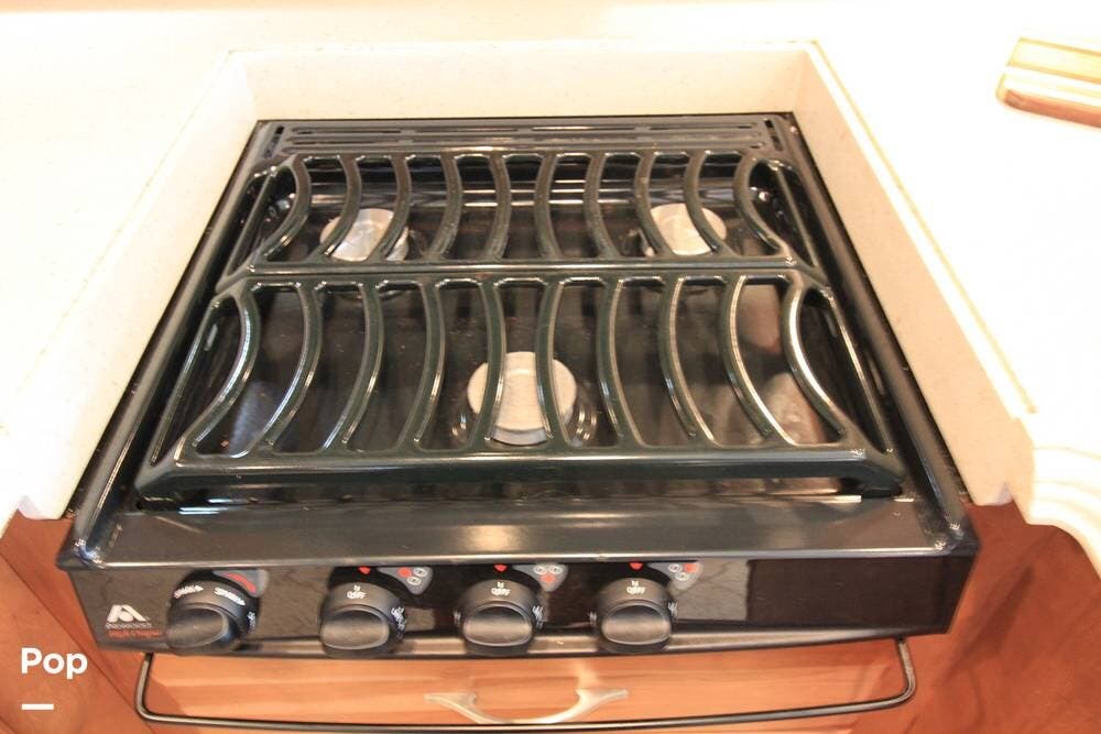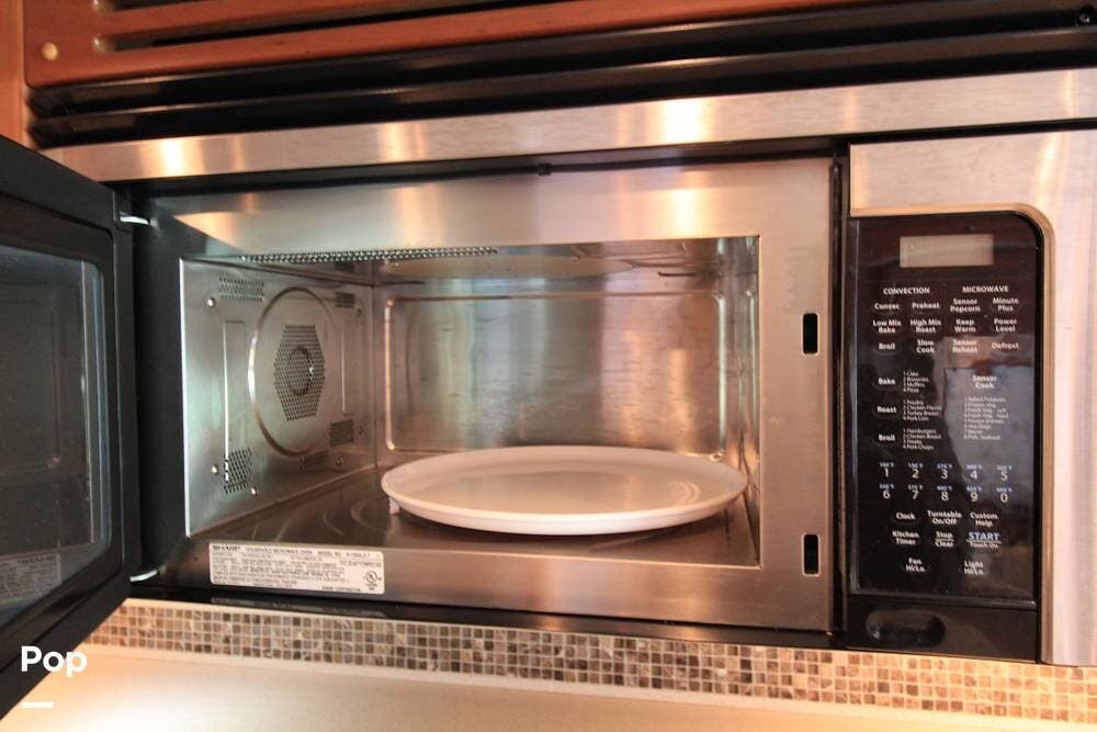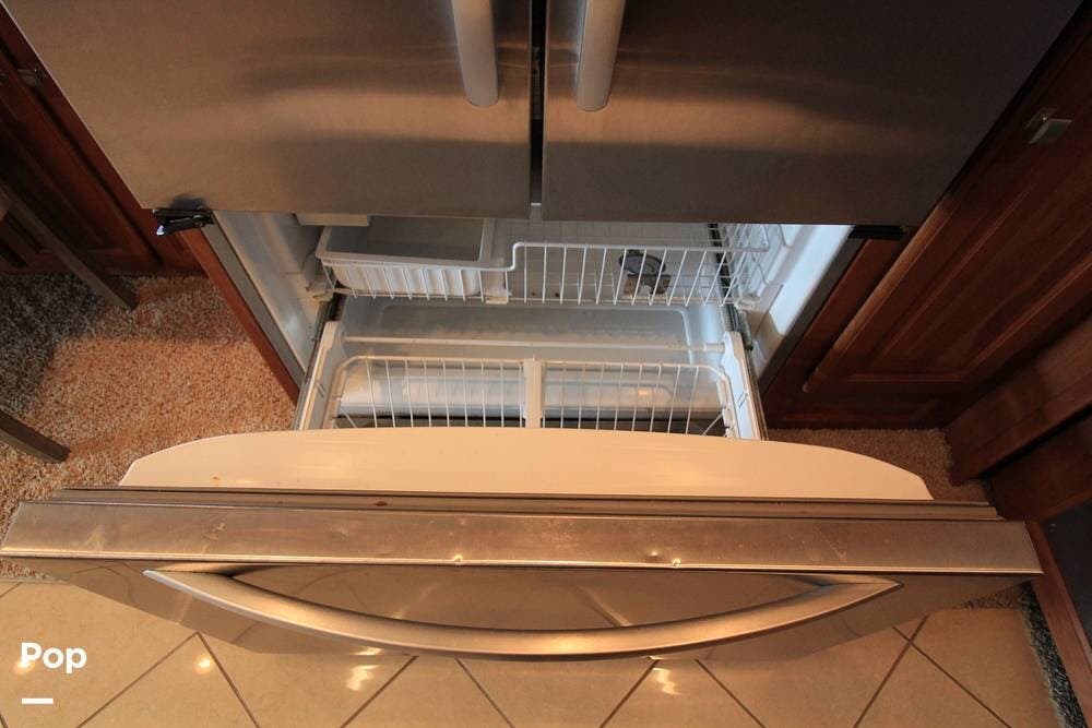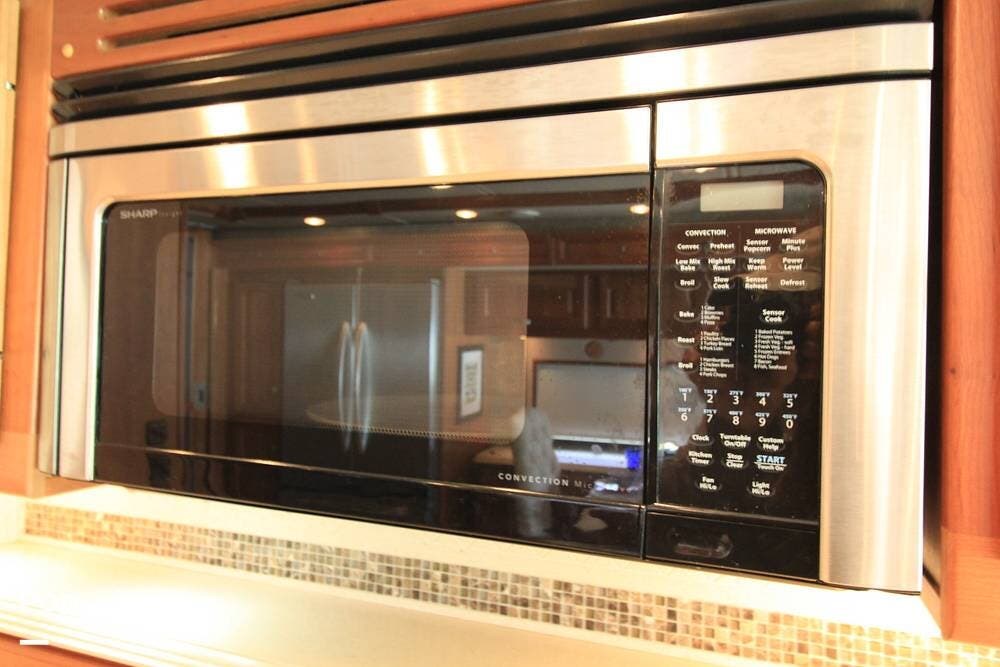 A walk inside highlights the open living front floor plan, featuring a full-size kitchen on the right side of the coach. The space will make even the most demanding camp chef happy, featuring a full-size residential-style refrigerator with an ice maker, a convection microwave, and a 3-burner propane stove.