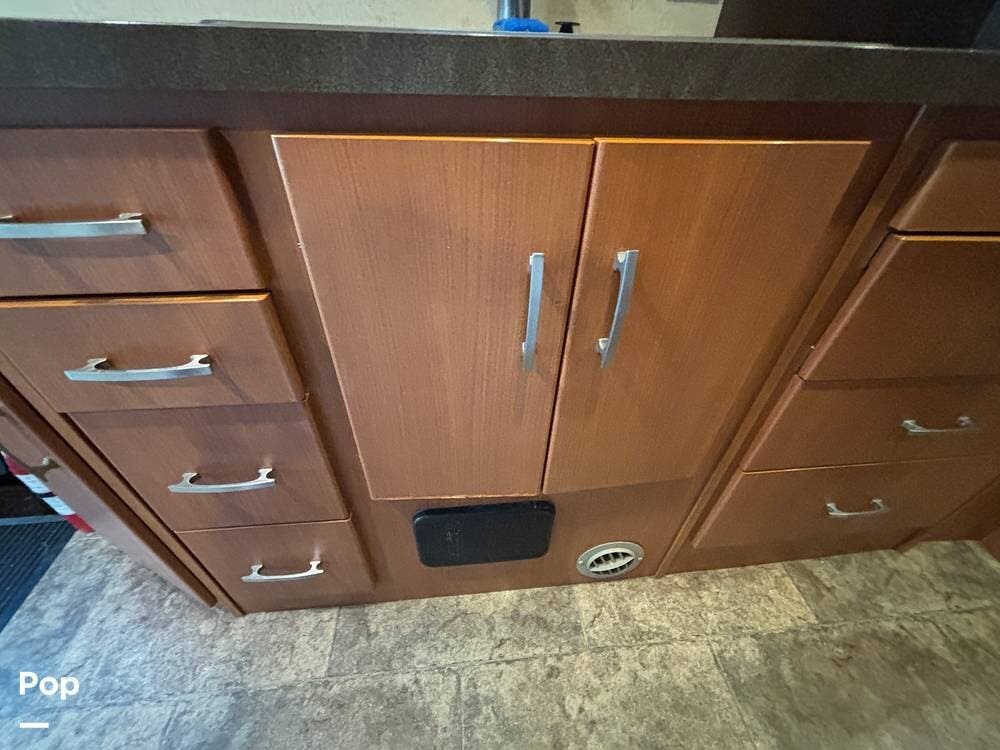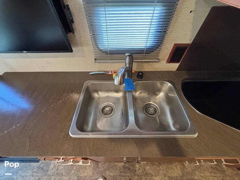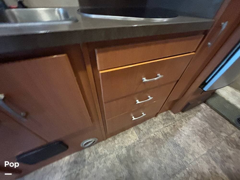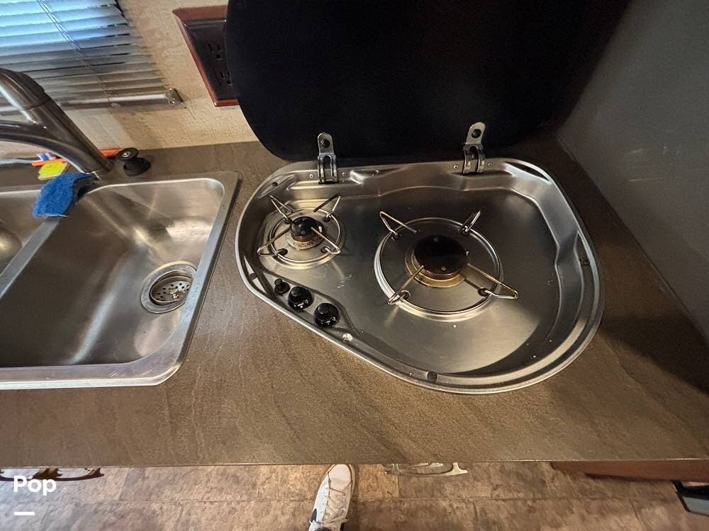 The kitchen is well-equipped for life on the road, featuring a solid-surface countertop, stainless steel sink, two-burner range, convection microwave, and a refrigerator/freezer. Ample cabinetry above and below provides convenient storage for cookware and groceries. The efficient layout ensures that everything you need for meal prep is within easy reach, while still allowing open space to move comfortably through the coach.