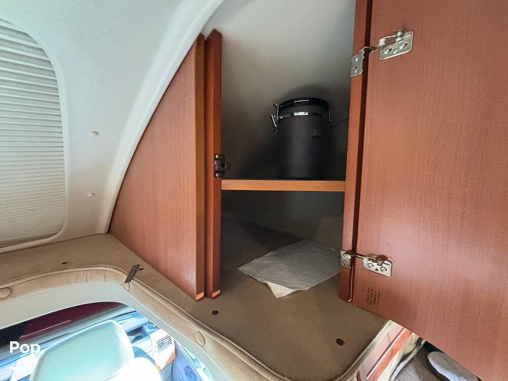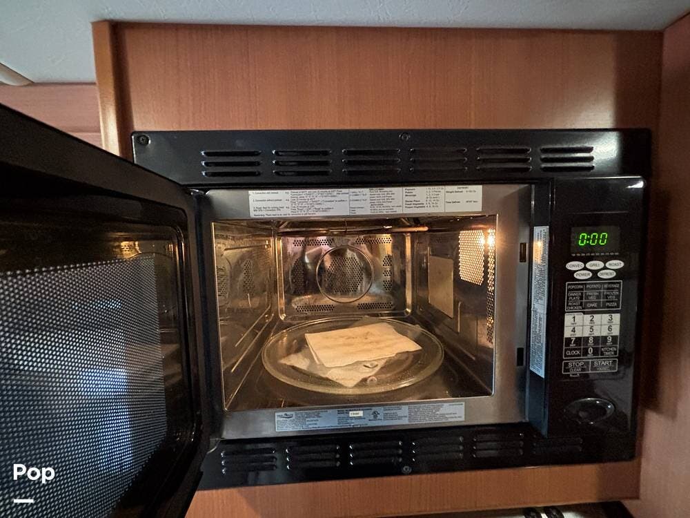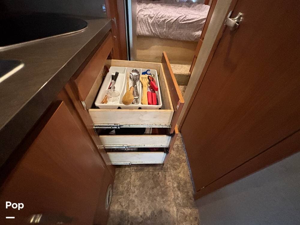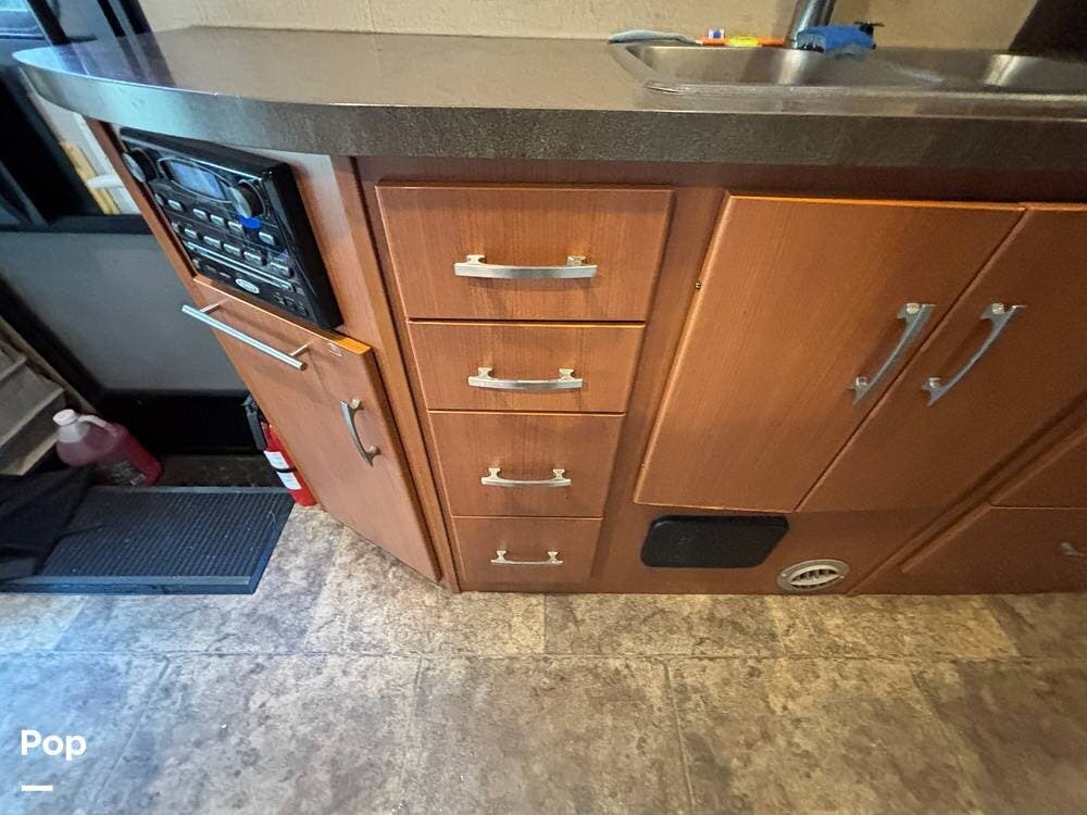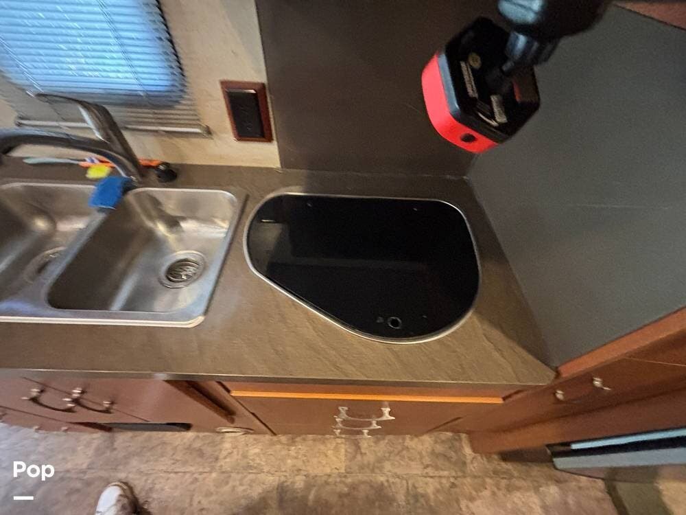 The kitchen is well-equipped for life on the road, featuring a solid-surface countertop, stainless steel sink, two-burner range, convection microwave, and a refrigerator/freezer. Ample cabinetry above and below provides convenient storage for cookware and groceries. The efficient layout ensures that everything you need for meal prep is within easy reach, while still allowing open space to move comfortably through the coach.