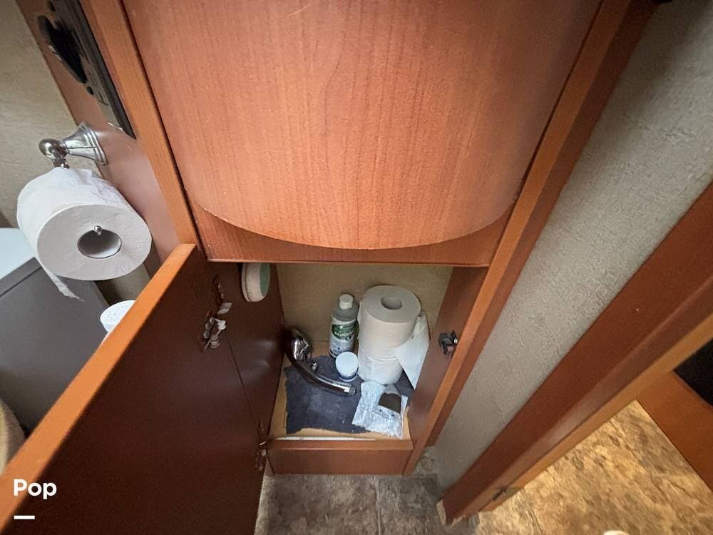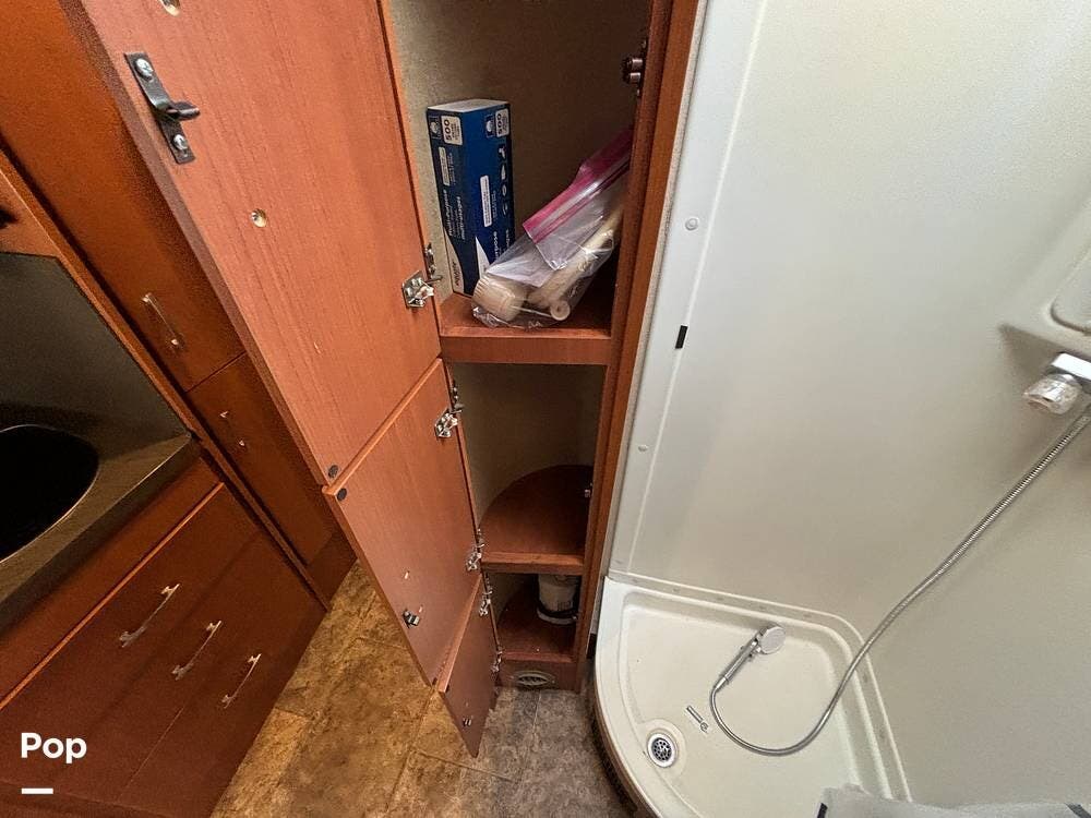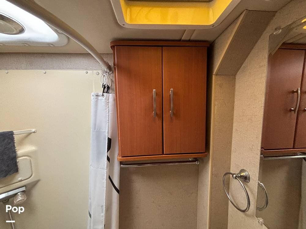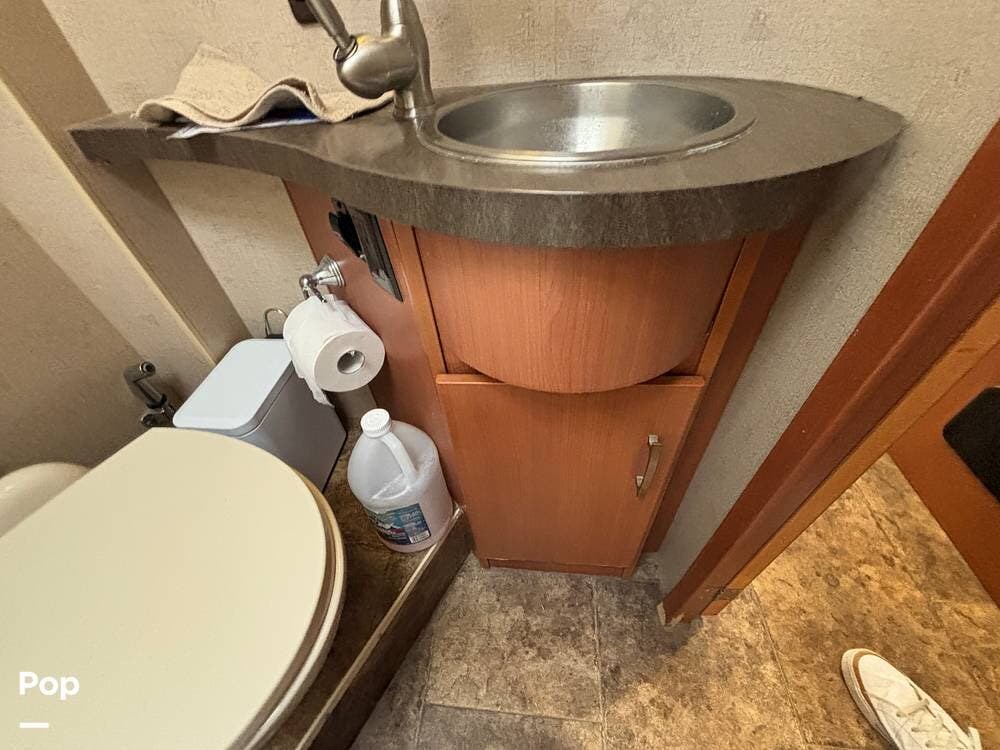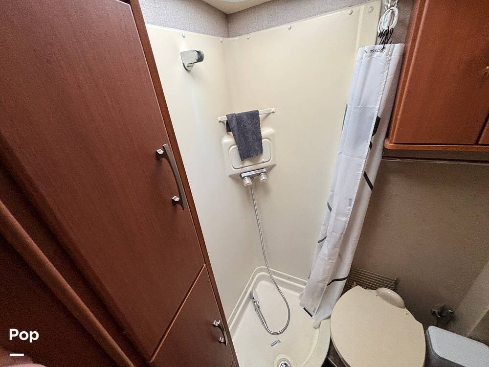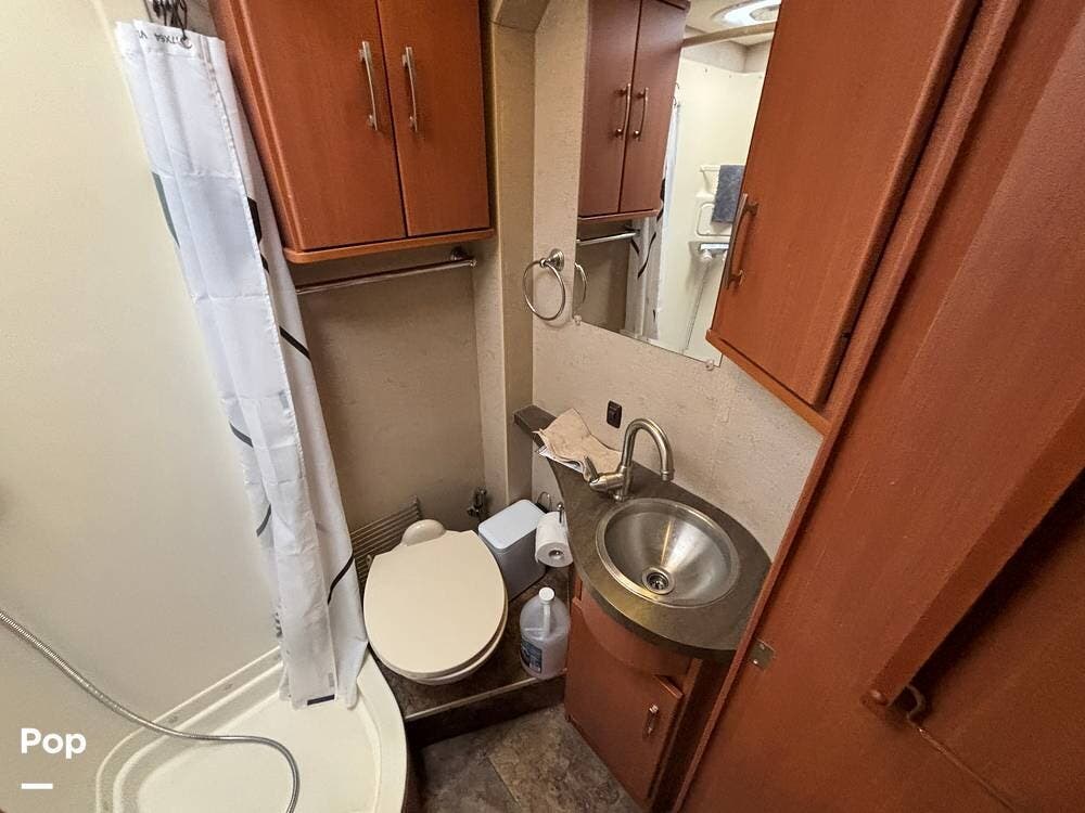 The bathroom is located mid-coach for easy access and features a corner shower, a porcelain toilet, a vanity with sink, and a mirrored medicine cabinet. The design is bright and efficient, giving you all the essentials of home in a compact, easy-to-clean space.