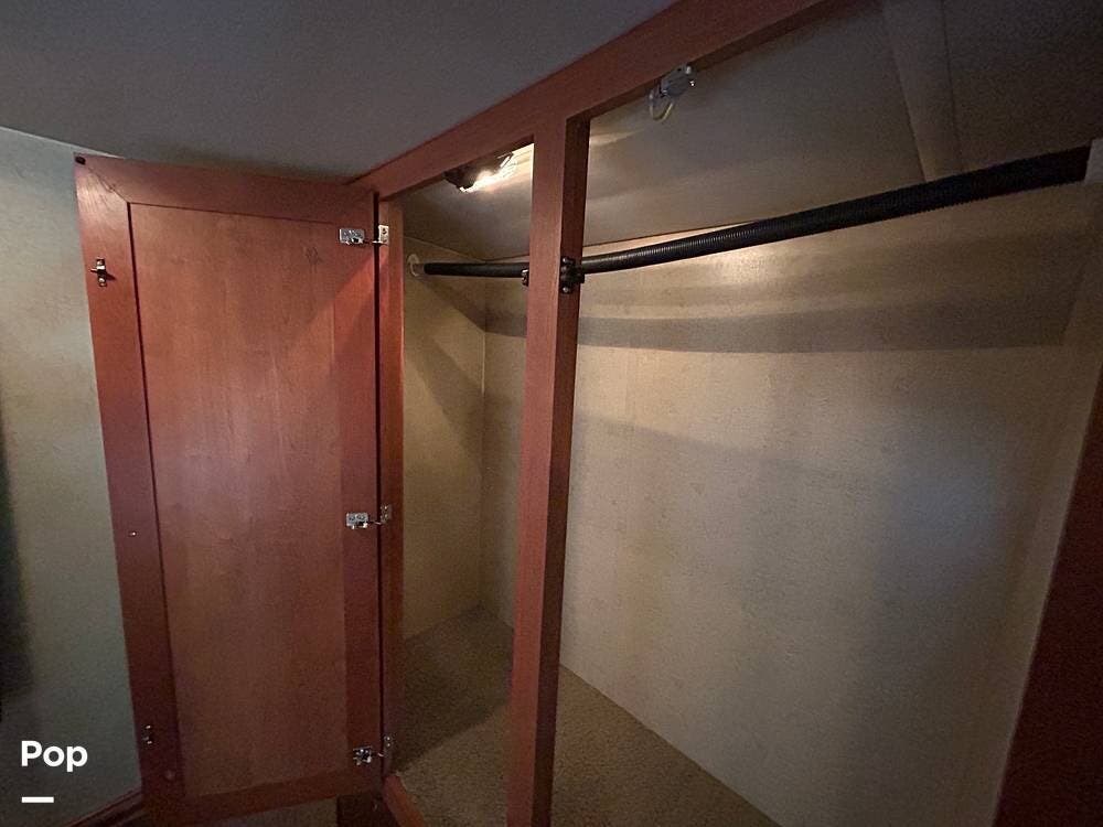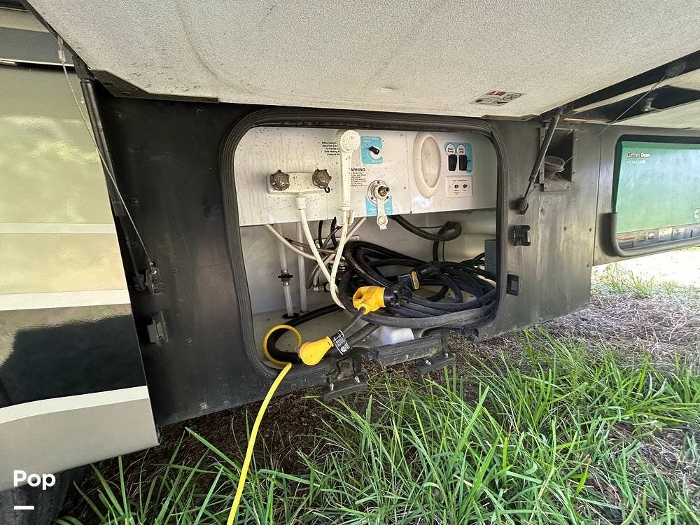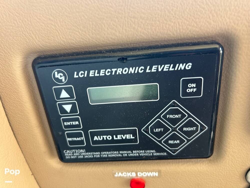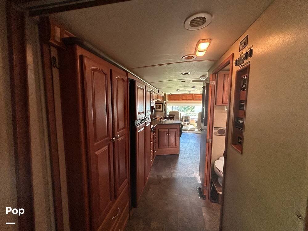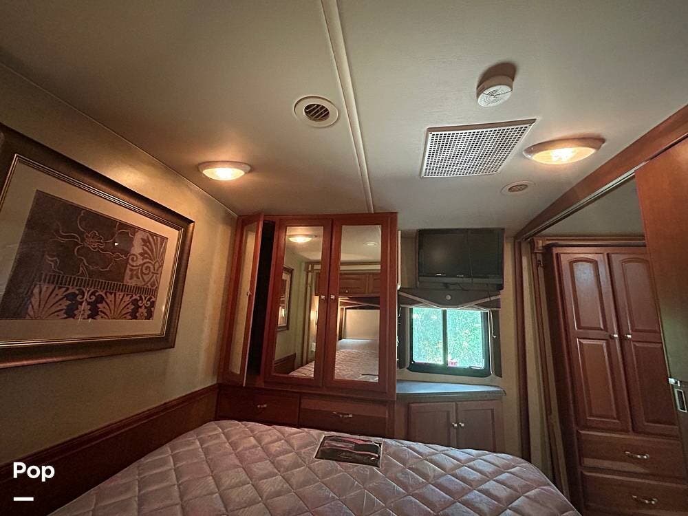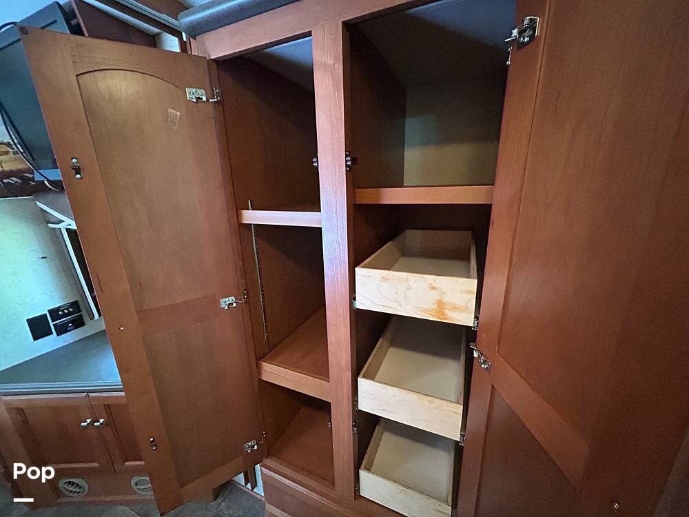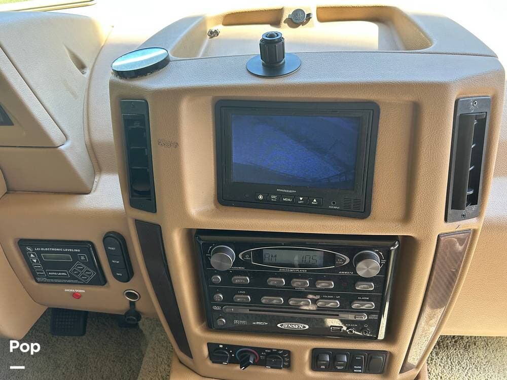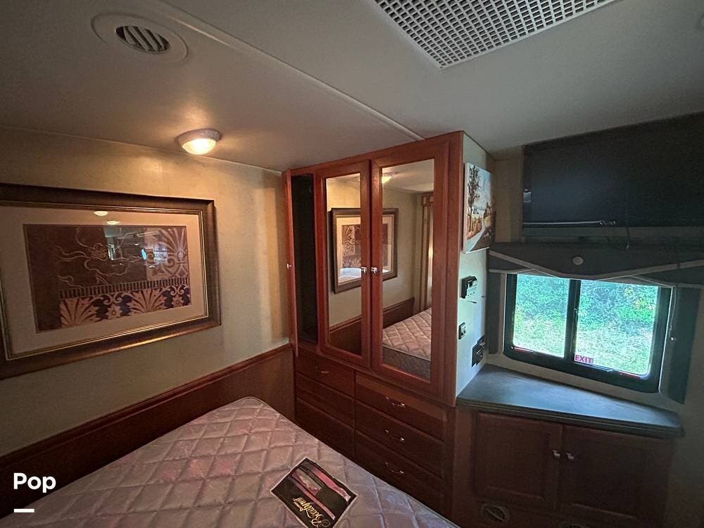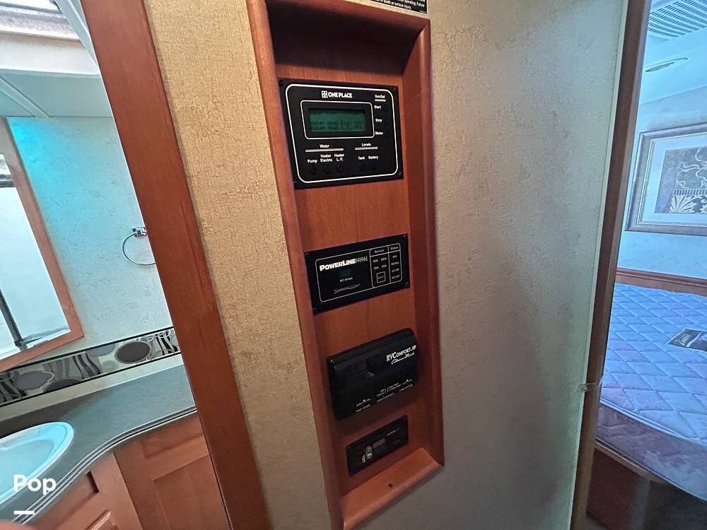 This unit has ample storage inside and outside, and equipped with a 5,500-watt Cummins Onan generator, dual 13,500 BTU air conditioners, a 40,000 BTU furnace, and a 6-gallon water heater.