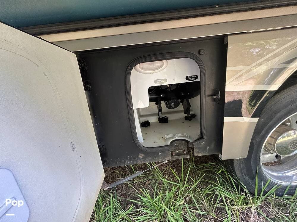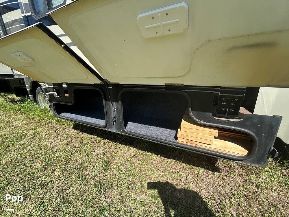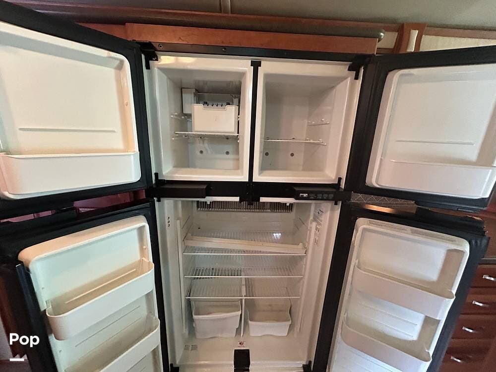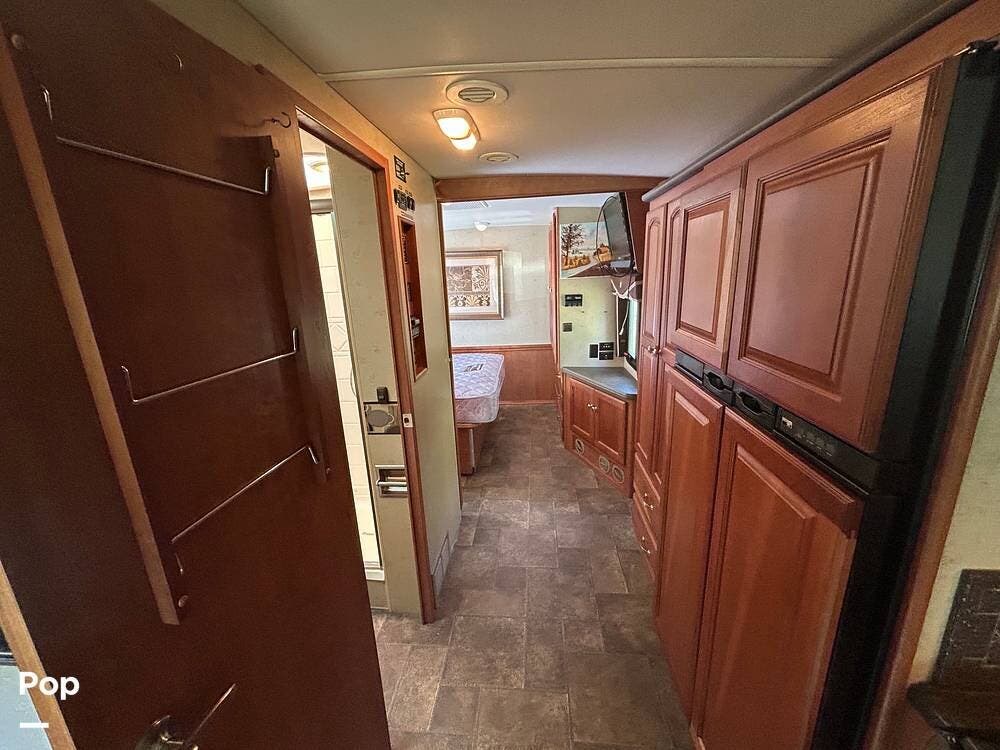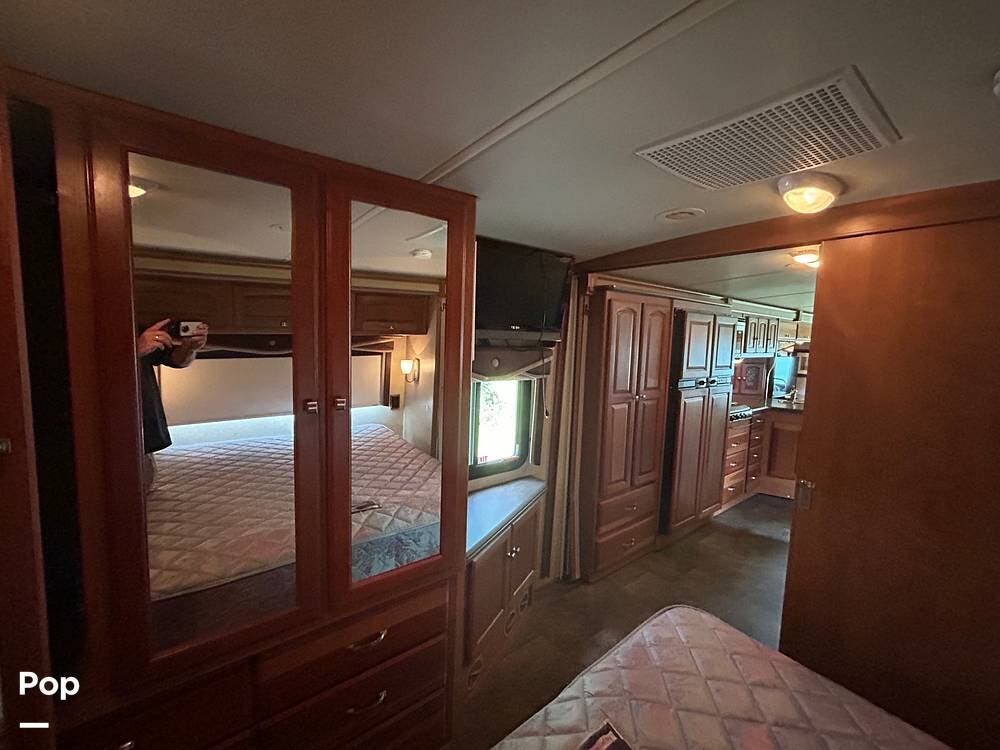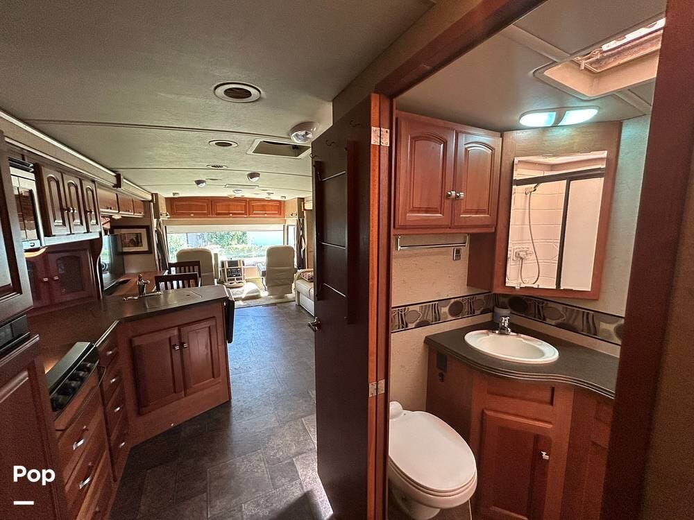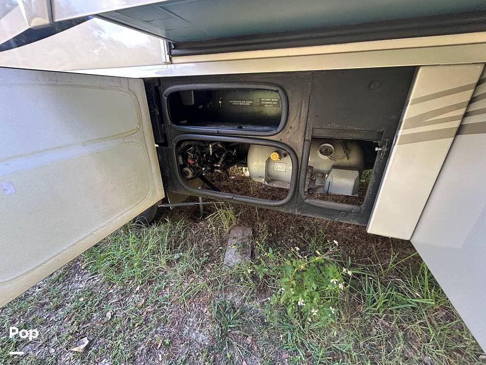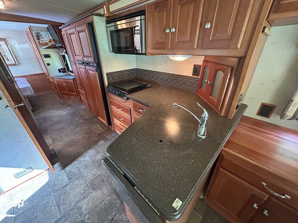 This unit has ample storage inside and outside, and equipped with a 5,500-watt Cummins Onan generator, dual 13,500 BTU air conditioners, a 40,000 BTU furnace, and a 6-gallon water heater.