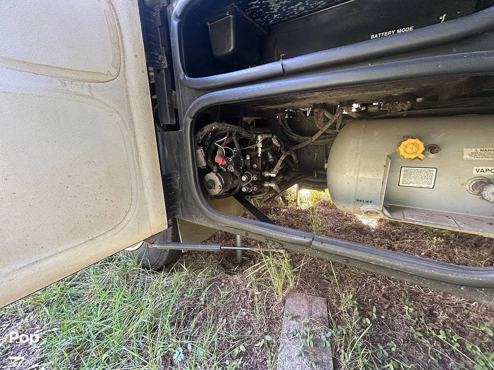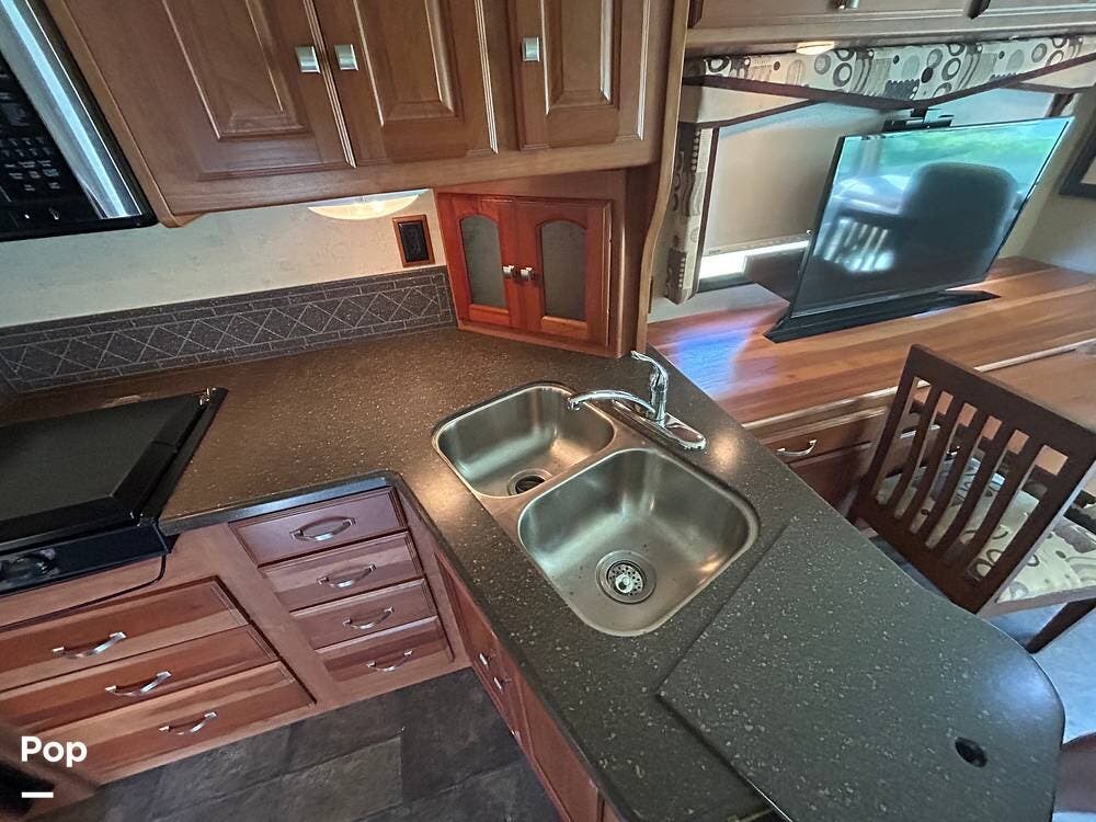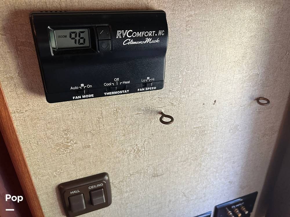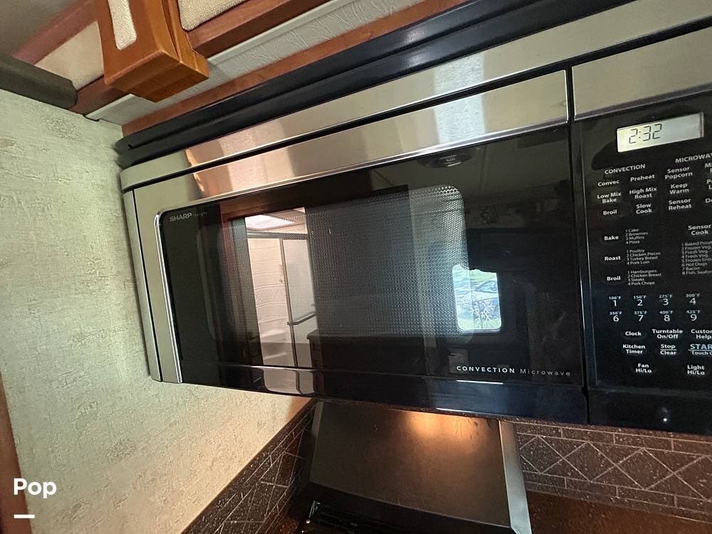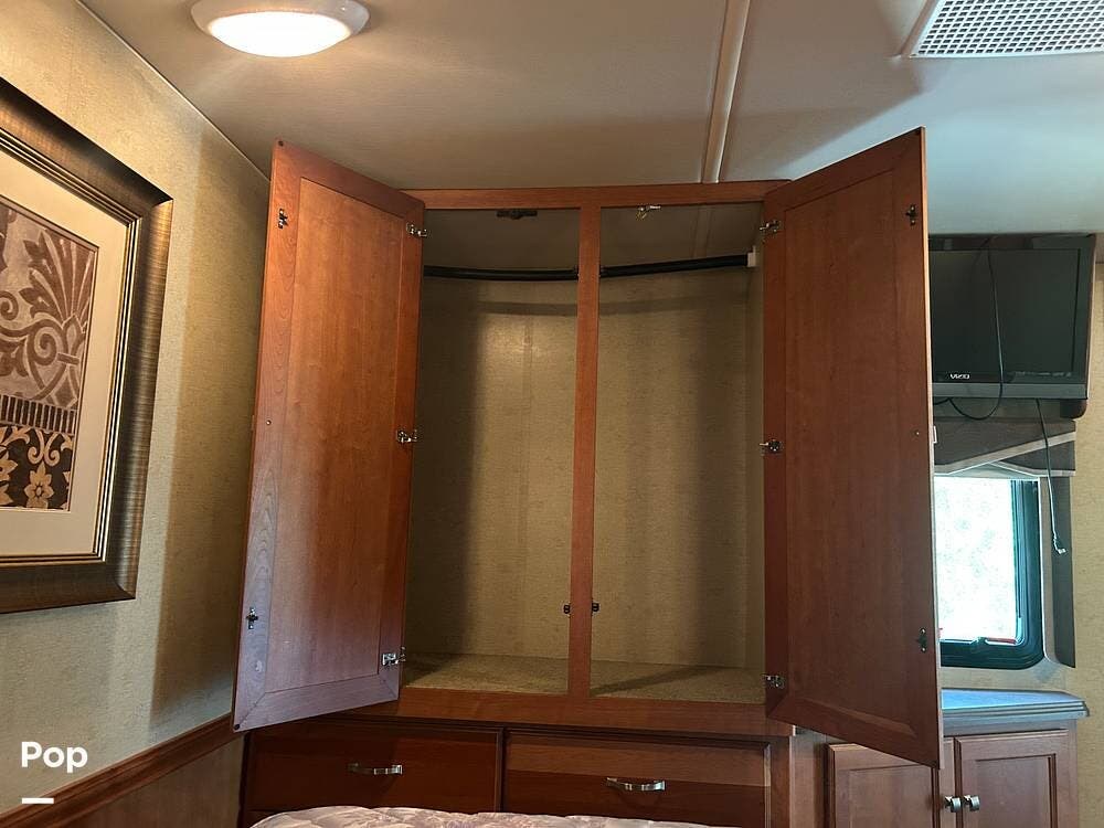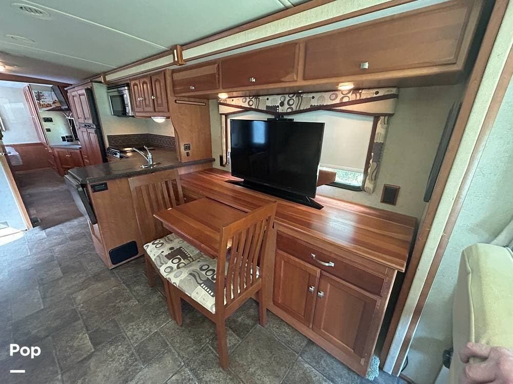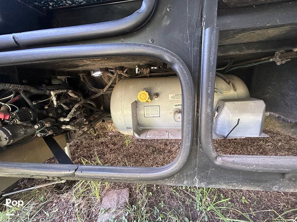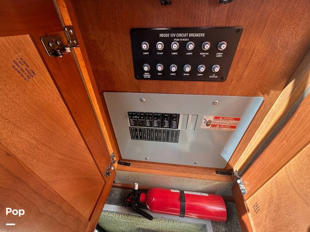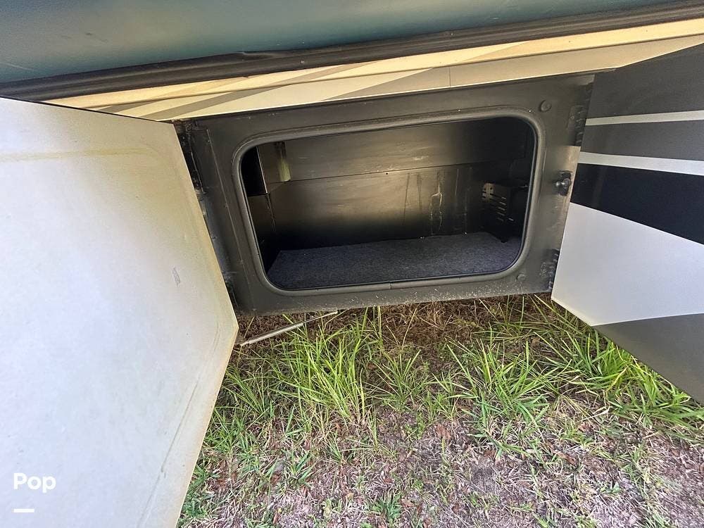 This unit has ample storage inside and outside, and equipped with a 5,500-watt Cummins Onan generator, dual 13,500 BTU air conditioners, a 40,000 BTU furnace, and a 6-gallon water heater.