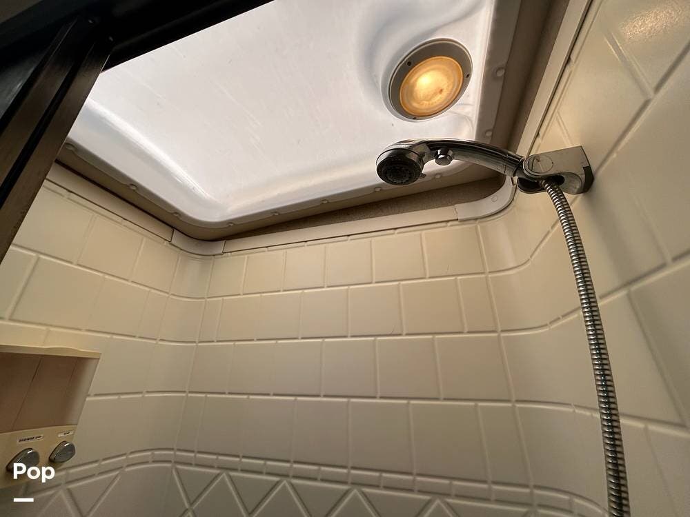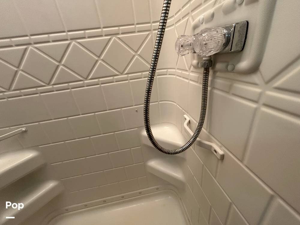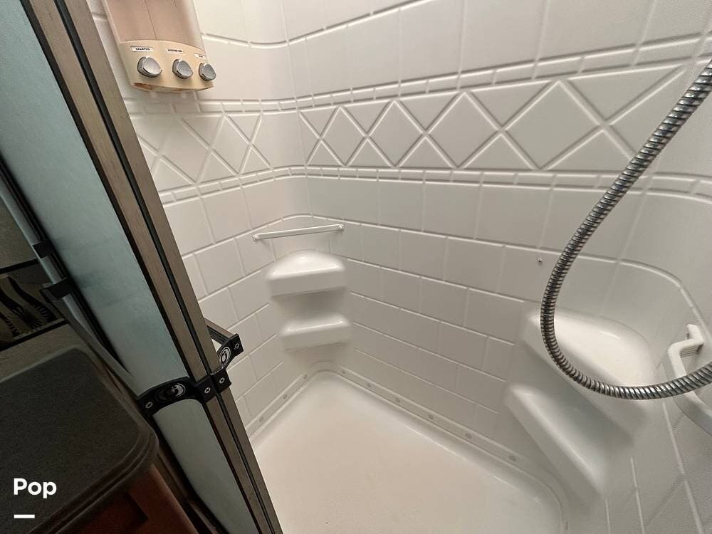 The bathroom comes with a large comfortable shower, skylight, porcelain toilet, and vanity, ensuring comfort and convenience on the road.