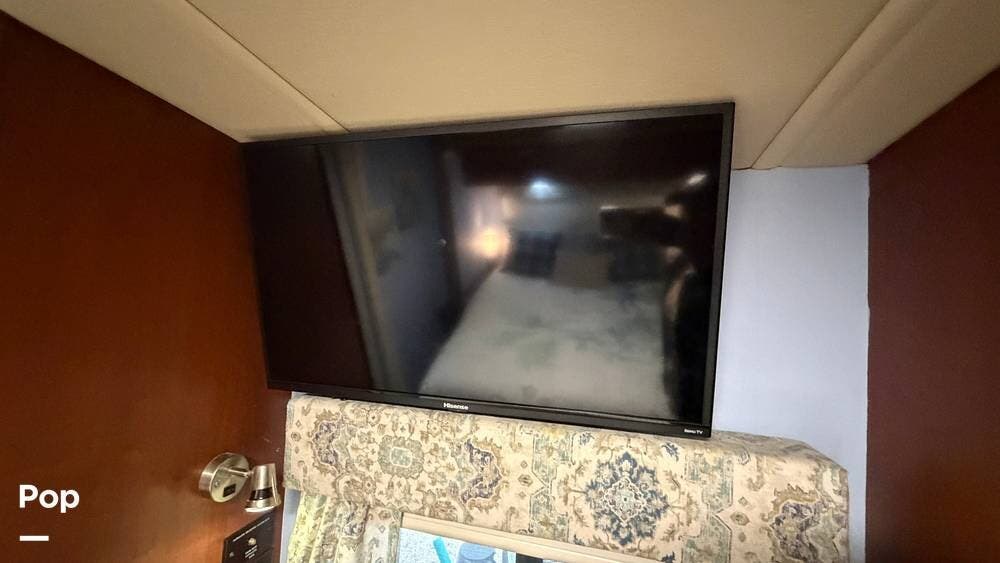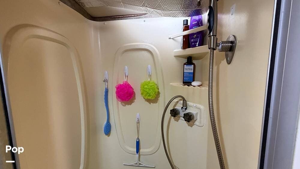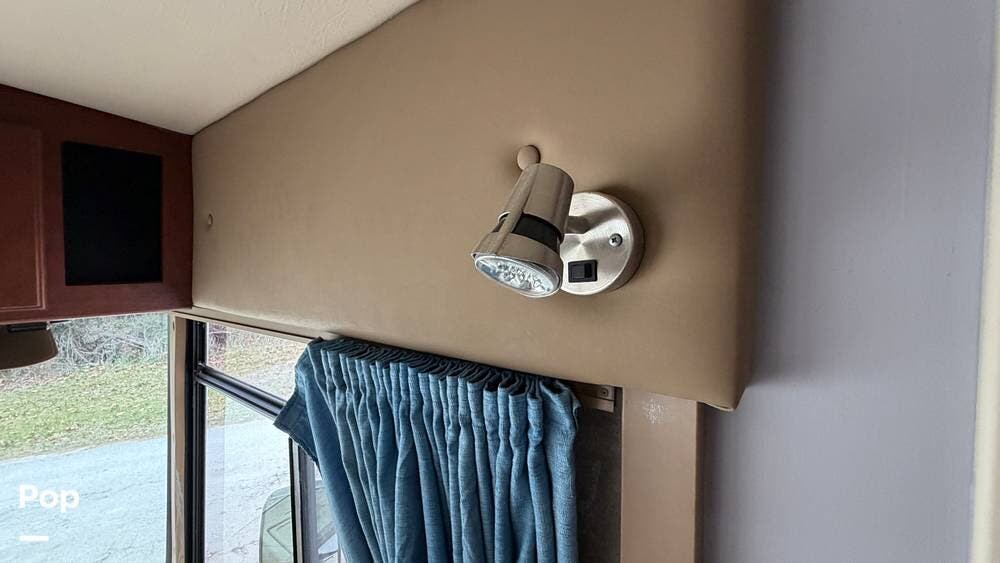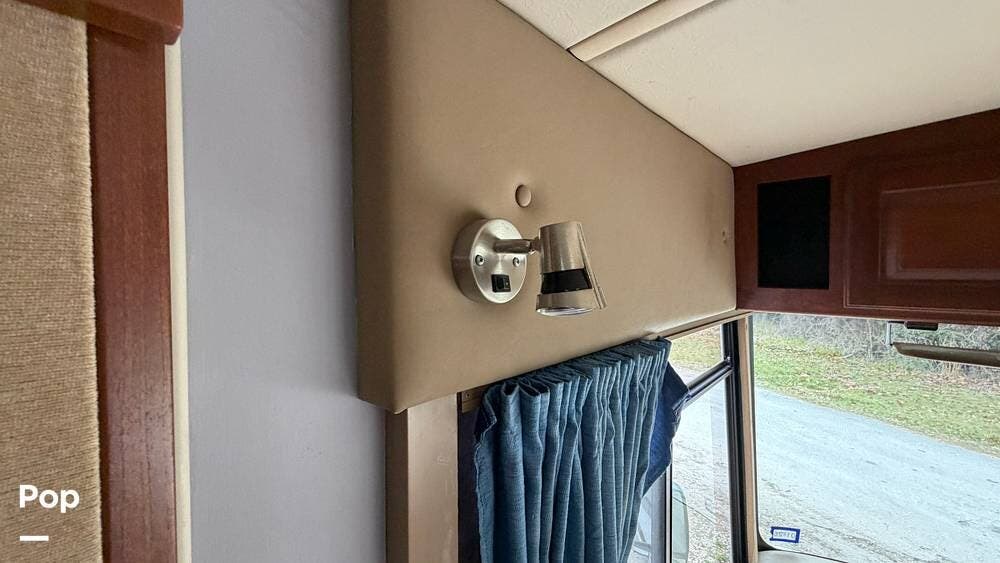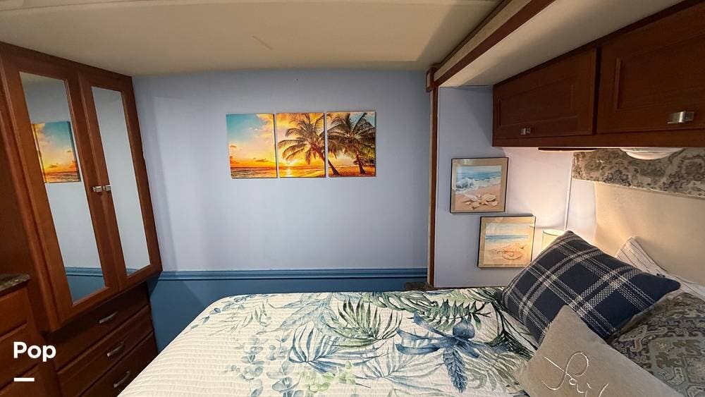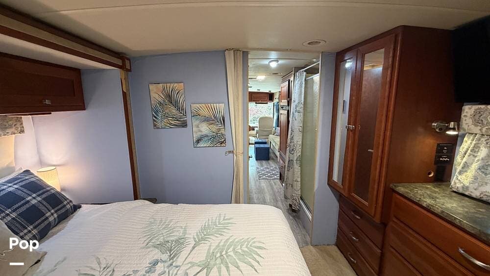 The private bedroom provides a restful retreat with abundant closet storage, while the well-appointed bathroom offers convenience and functionality for extended trips. Large windows bring in plenty of natural light, creating an inviting atmosphere throughout the coach.