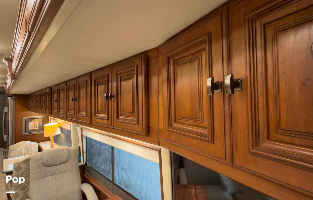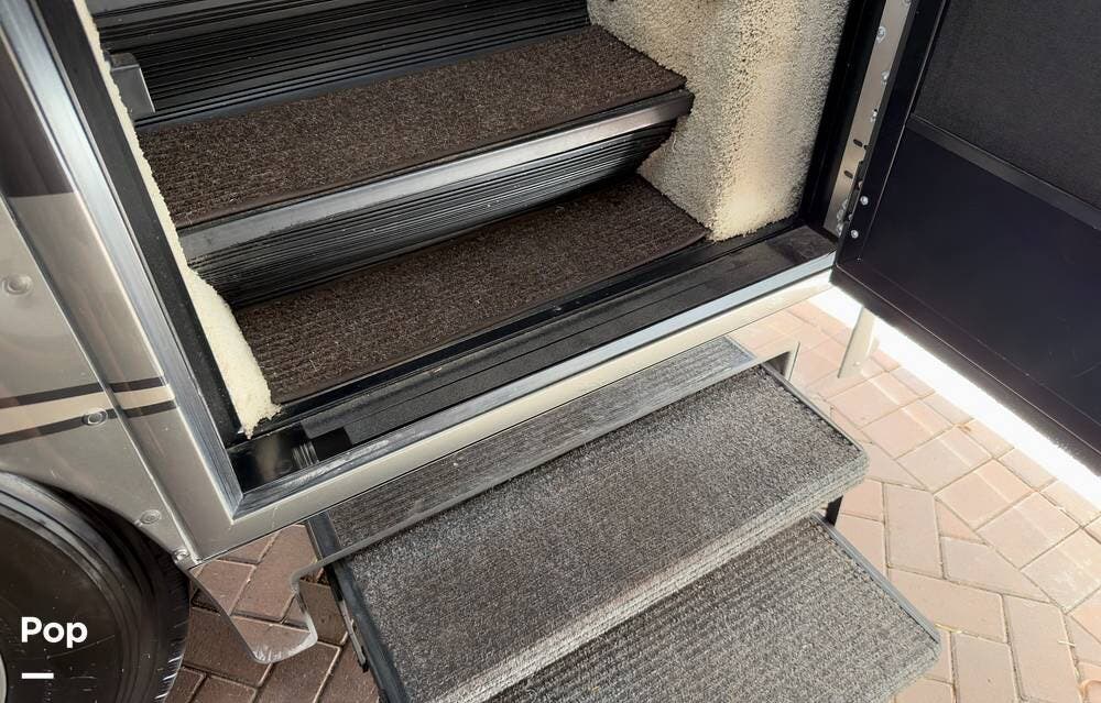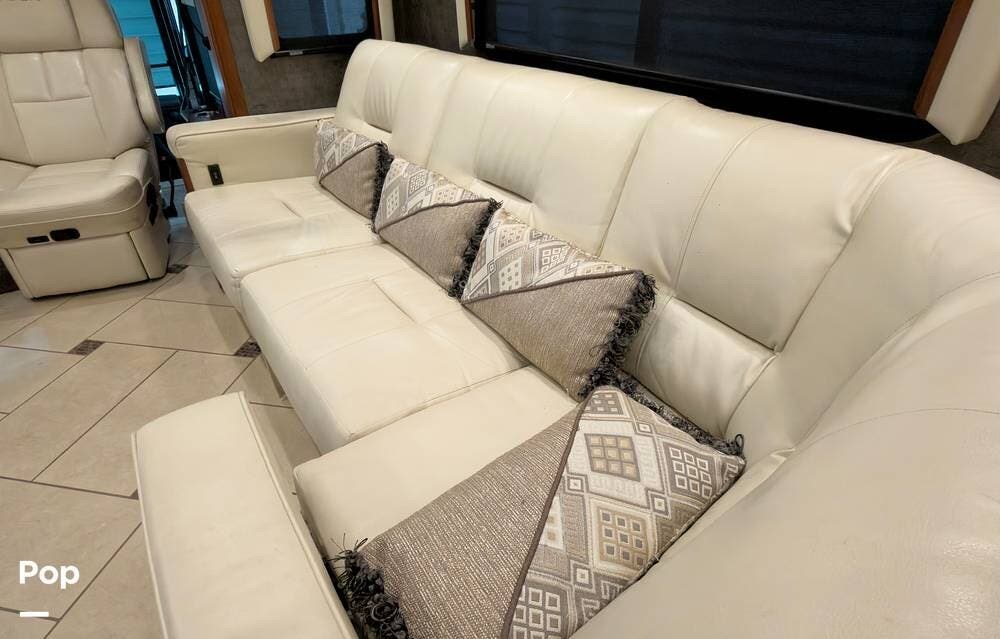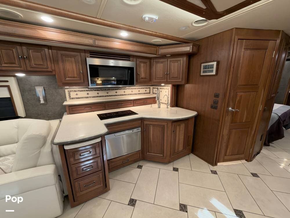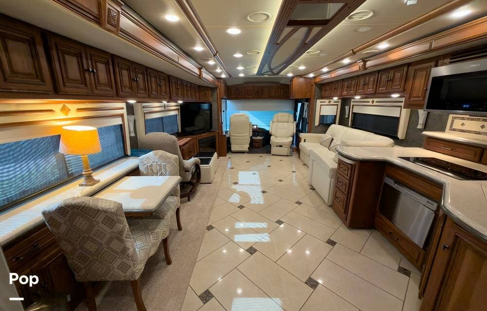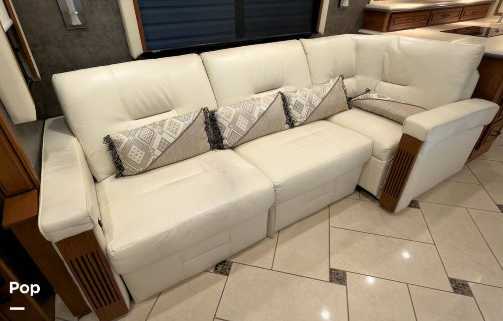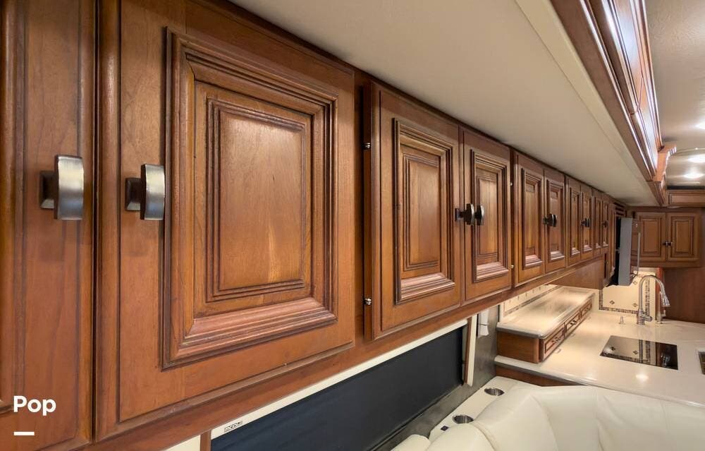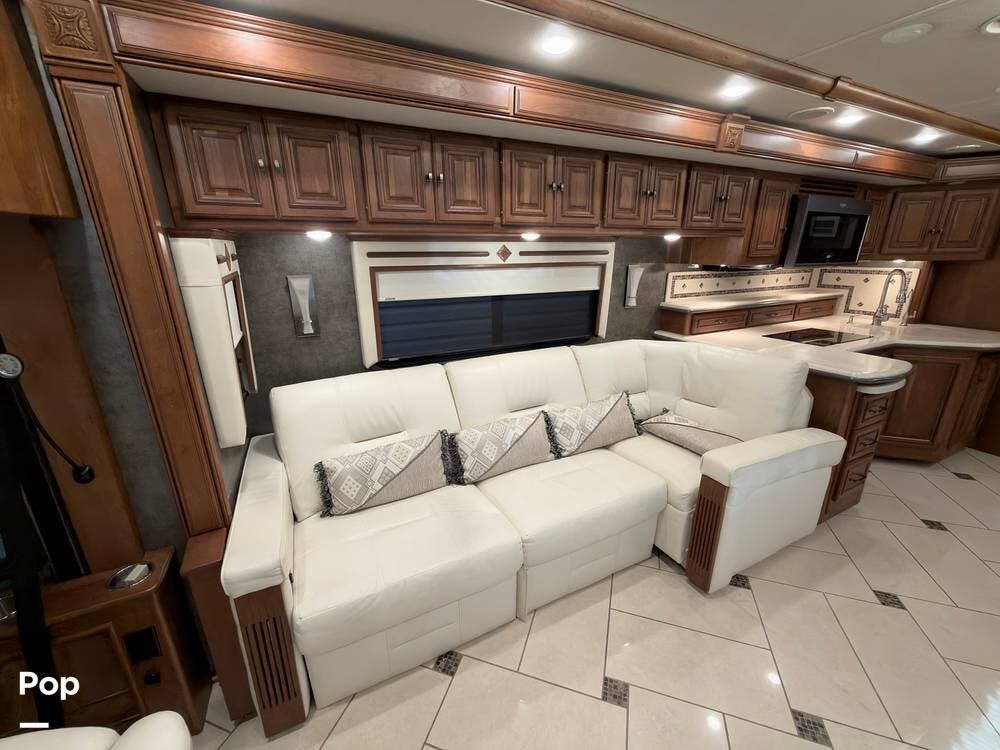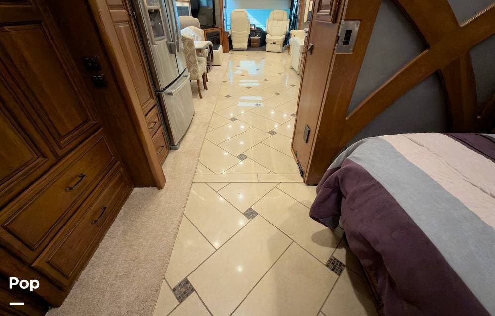 The ride is exceptionally smooth thanks to air suspension, air brakes, a tag axle, and independent front suspension. Inside, you'll find a spacious layout with premium tile flooring, rich hardwood cabinetry, and upscale residential-style furnishings.