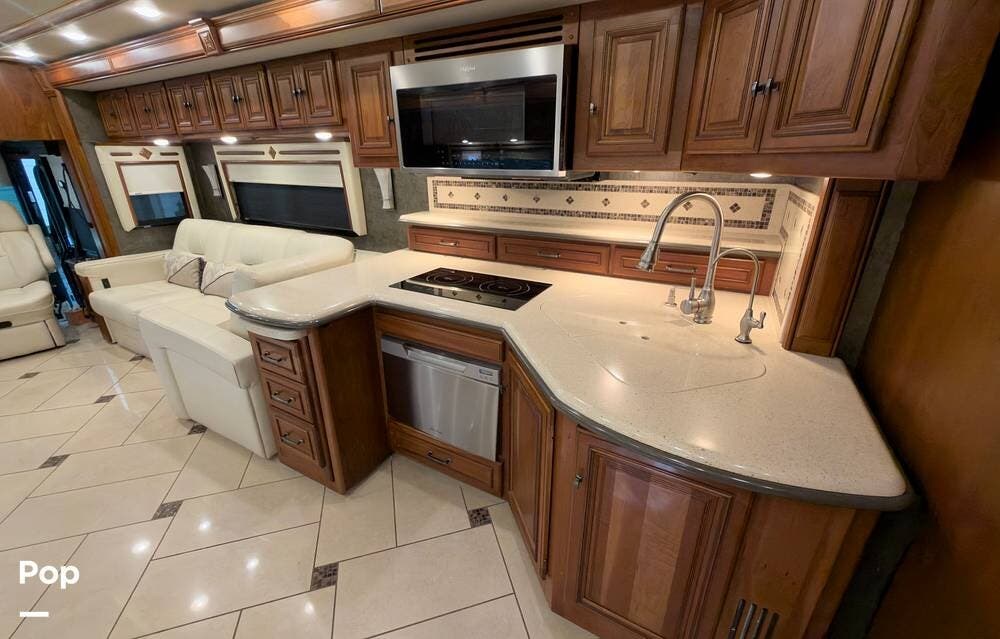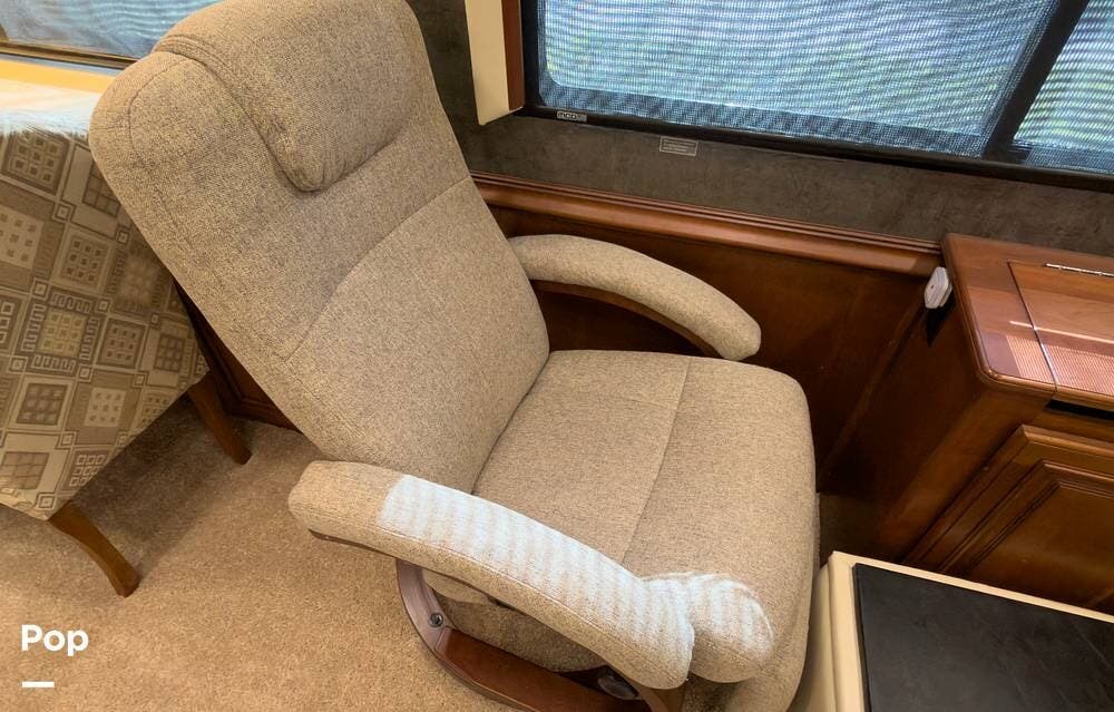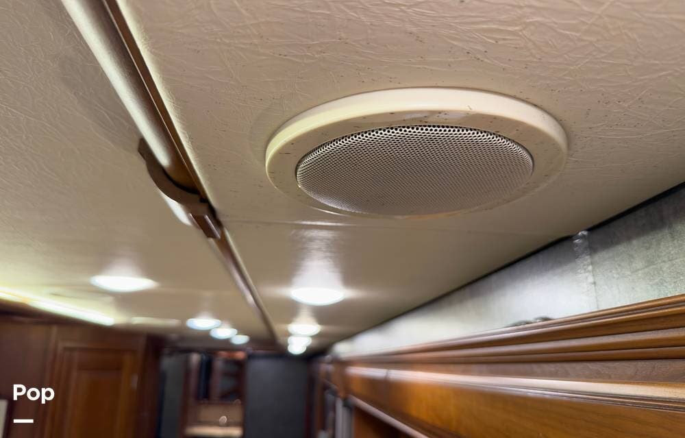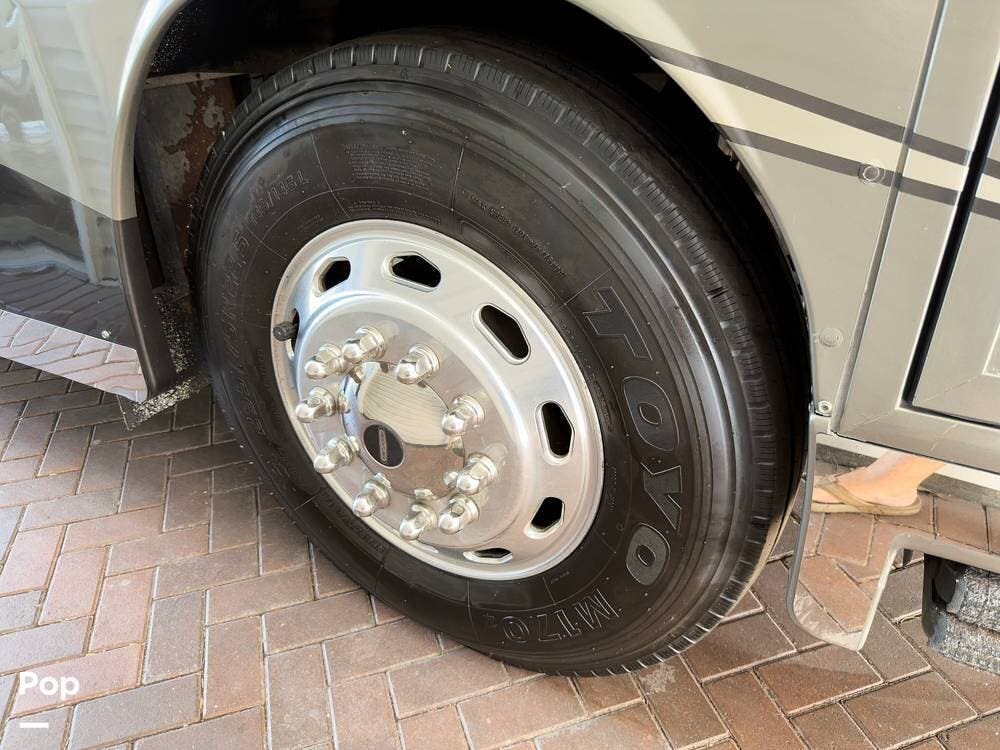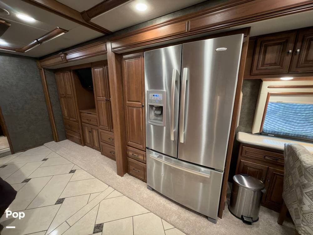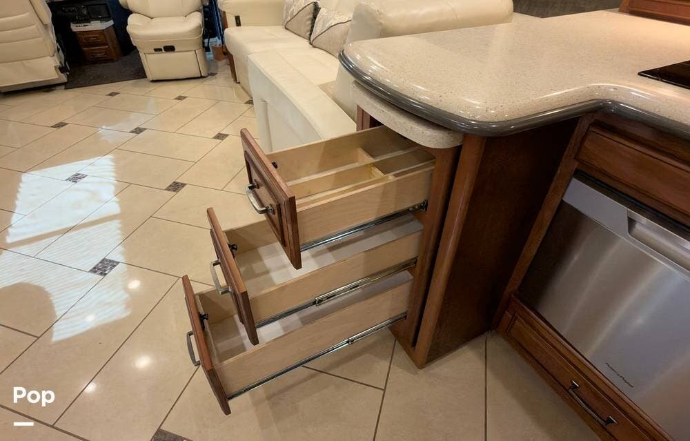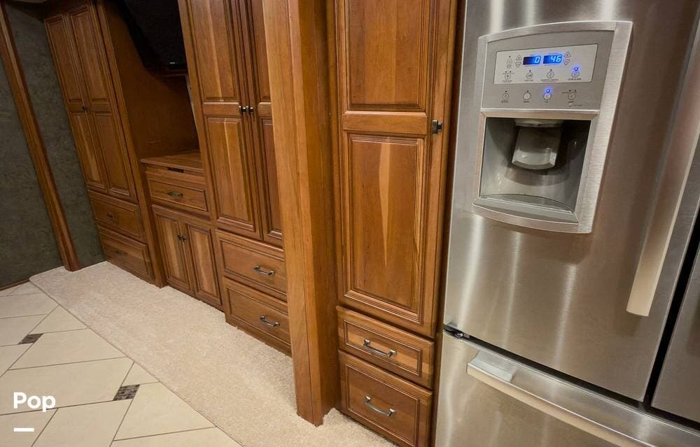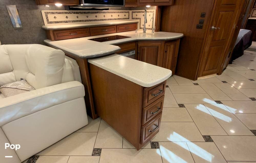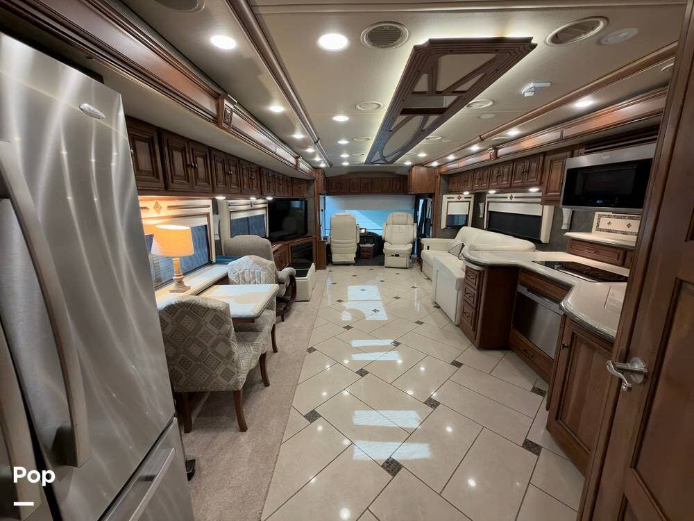The ride is exceptionally smooth thanks to air suspension, air brakes, a tag axle, and independent front suspension. Inside, you'll find a spacious layout with premium tile flooring, rich hardwood cabinetry, and upscale residential-style furnishings.