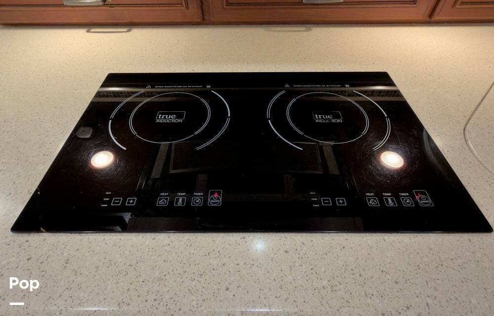 The kitchen is equipped with a residential fridge, induction cooktop, solid-surface Corian countertops, and a dishwasher. Multiplex wiring makes lighting and system controls easy to manage, while three-zone A/C and heat ensure year-round comfort.