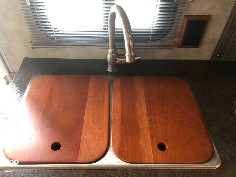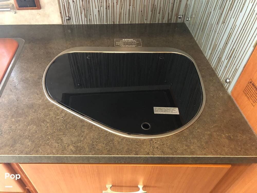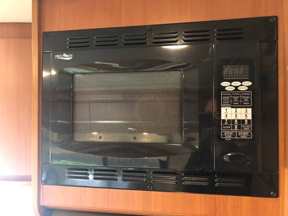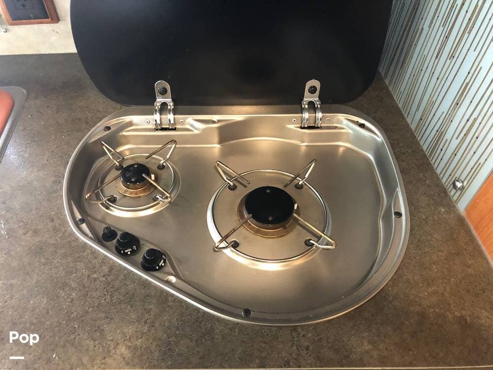 The fully equipped galley showcases Sunset Cherry cabinetry and high-quality appliances, including a convection microwave oven, a two-burner range with a glass cover, and a spacious refrigerator/freezer. The efficient layout and available sink covers provide generous countertop space, making it easy to prepare meals on the go.