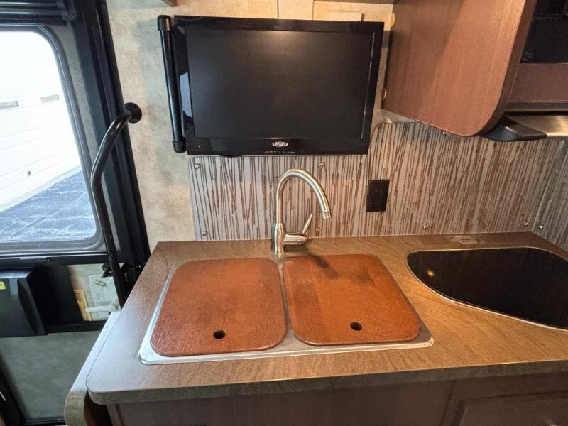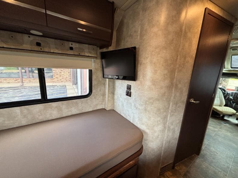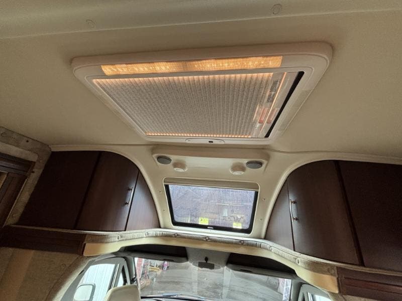Features Include: 188 HP, 180-Amp Alternator, Front Rear Mud Flaps, Sunvisors, Power Windows, 12v Powerpoints, Color Monitor, CD Weather Band MP3, Color Camera Monitor, One-Way Audio, Power Steering, Cruise Control, Power Patio Awning, Porch Light, Stepwell Light, Soft Vinyl Ceiling, Skylight with Shade, Laminate Countertops, Designer Backsplash, Mini Blinds, Systems Center, USB Charger, Cable TV Hookup, 26-inch LCD TV, Foam Mattress (24J), Headboard (24J), Pillows and Shams, Mini Blinds, Skylight, Flexible Showerhead, Porcelain Toilet, LP Tank Remote Fill, 30-Amp Service Cord, GFCI Circuit, 20k Furnace, On Demand Water Pump, 10-foot Sewer Hose, Roof Access Ladder