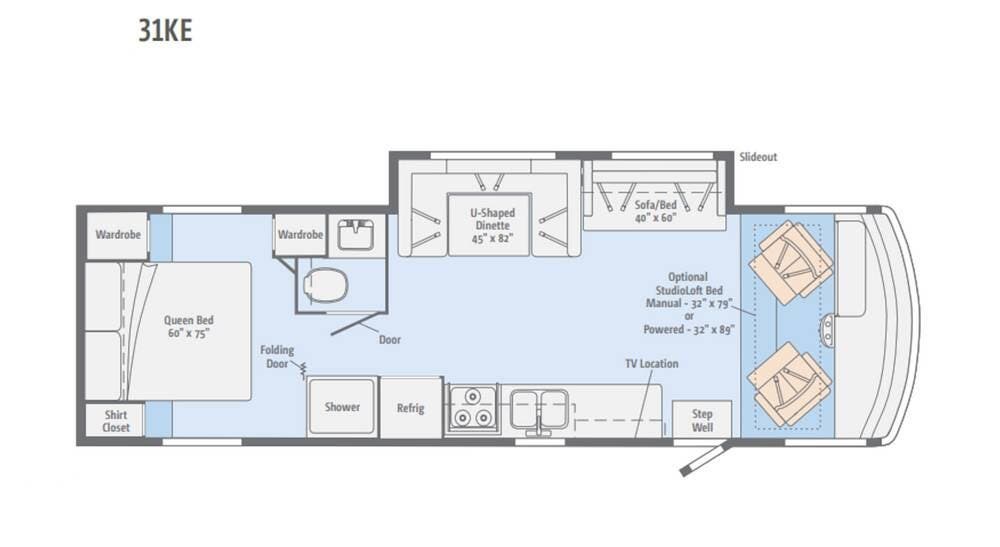 The Vista 31KE's versatile sleeping arrangements are perfect for travel. A drop‑down cab bed, a fold‑out couch, a convertible U‑shaped dinette, and a rear queen bed can comfortably host up to seven people--a true home‑on‑wheels for family vacations or group getaways.