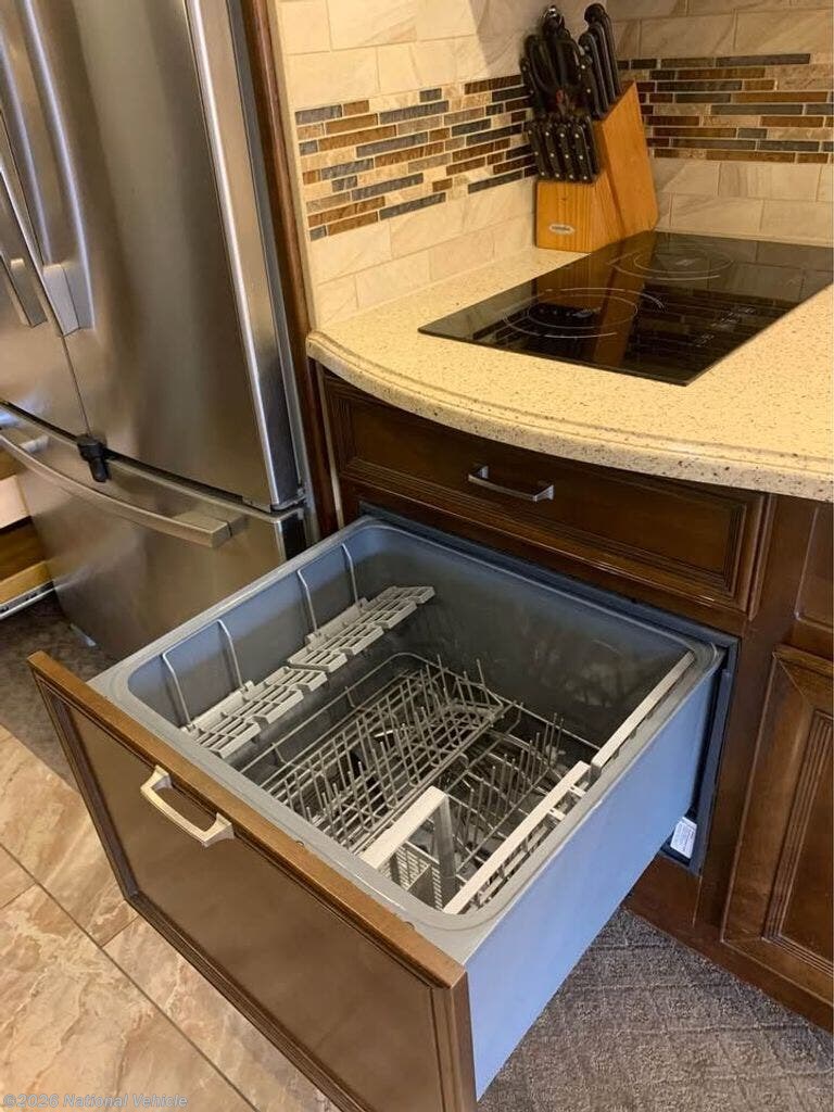 The all-electric kitchen is designed for true residential living on the road. It features a stainless steel residential refrigerator, induction cooktop, convection microwave, solid-surface countertops, and a convenient dishwasher drawer. Ample storage makes extended travel easy and comfortable.