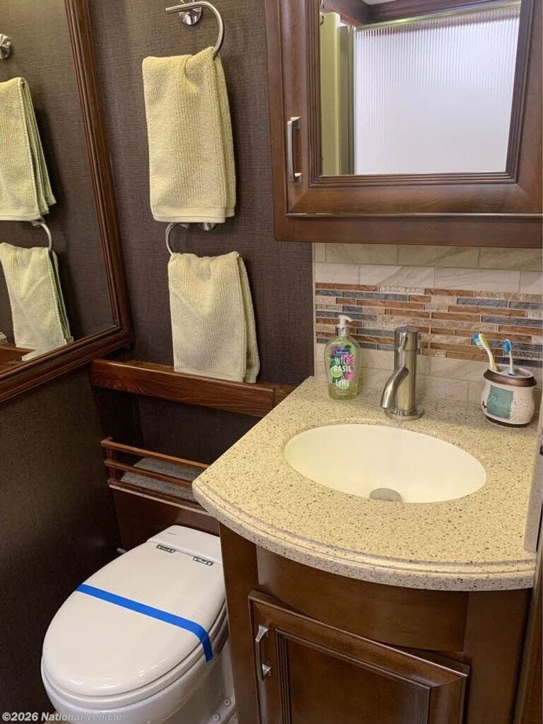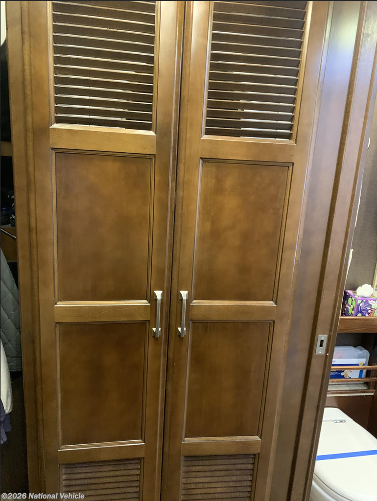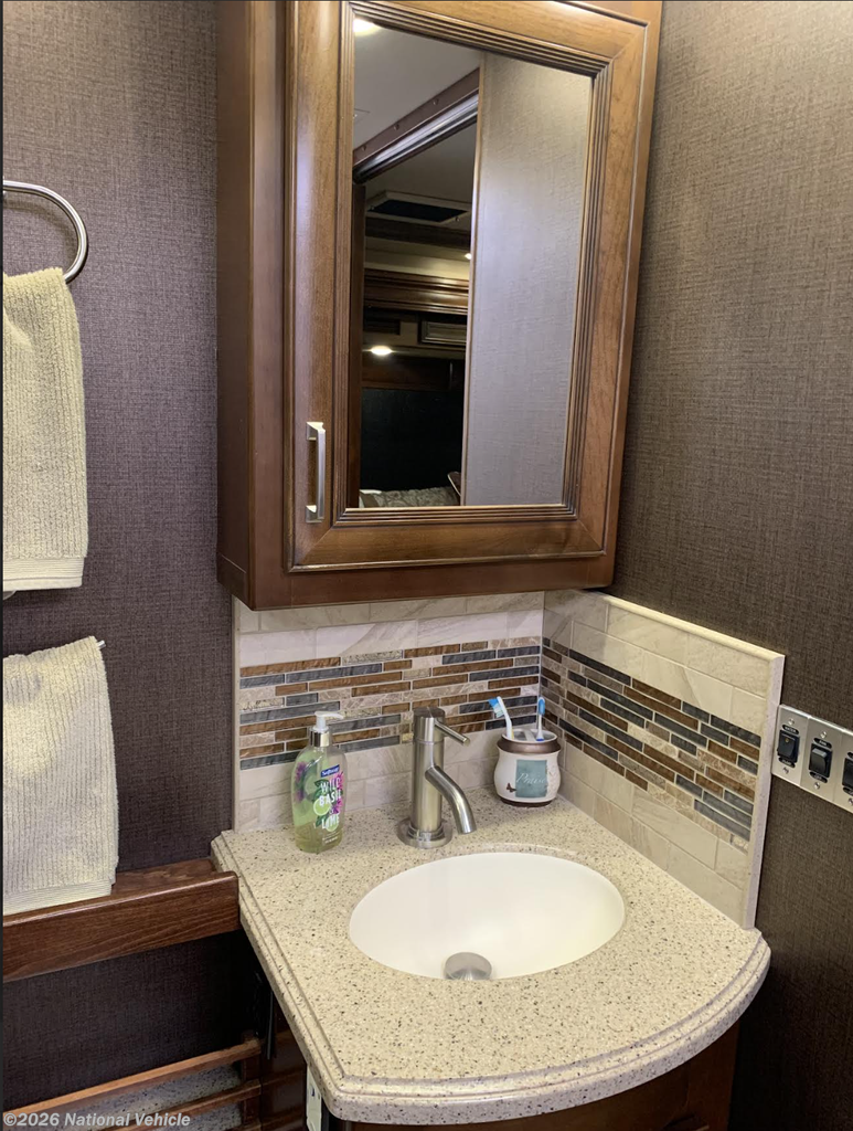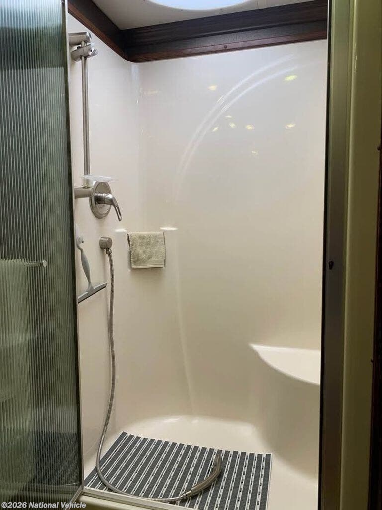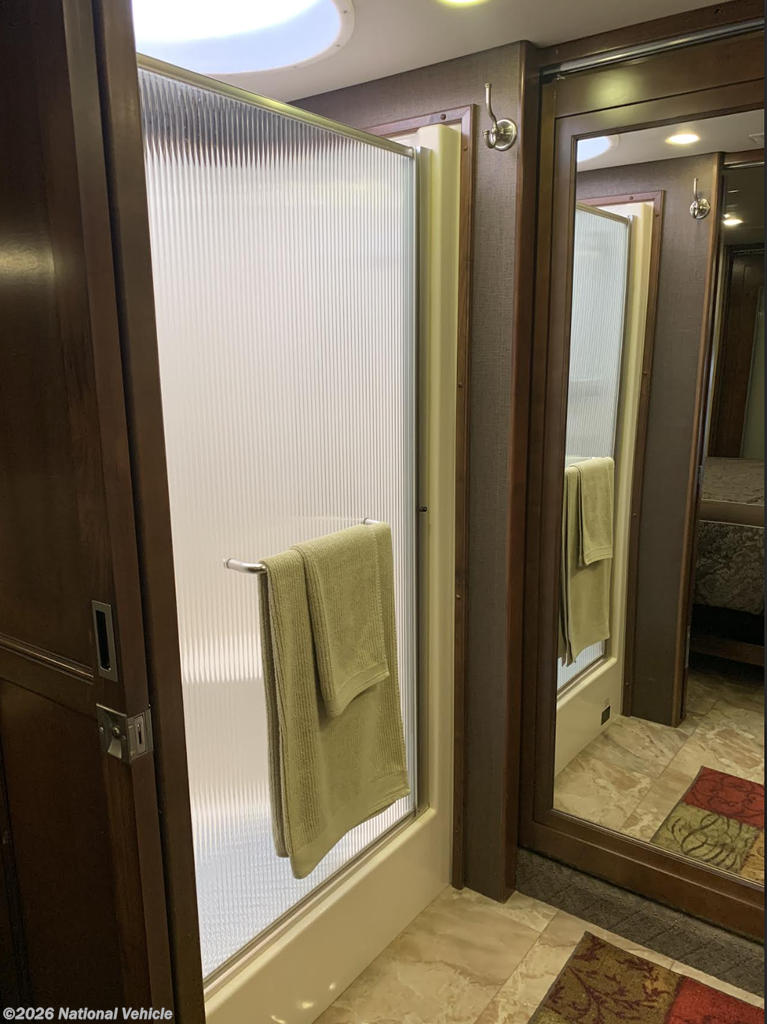 In the rear, the master suite delivers a private retreat with a king-size bed, generous wardrobe space, and a washer/dryer combo. The full bath features a spacious shower and quality finishes expected from American Coach.