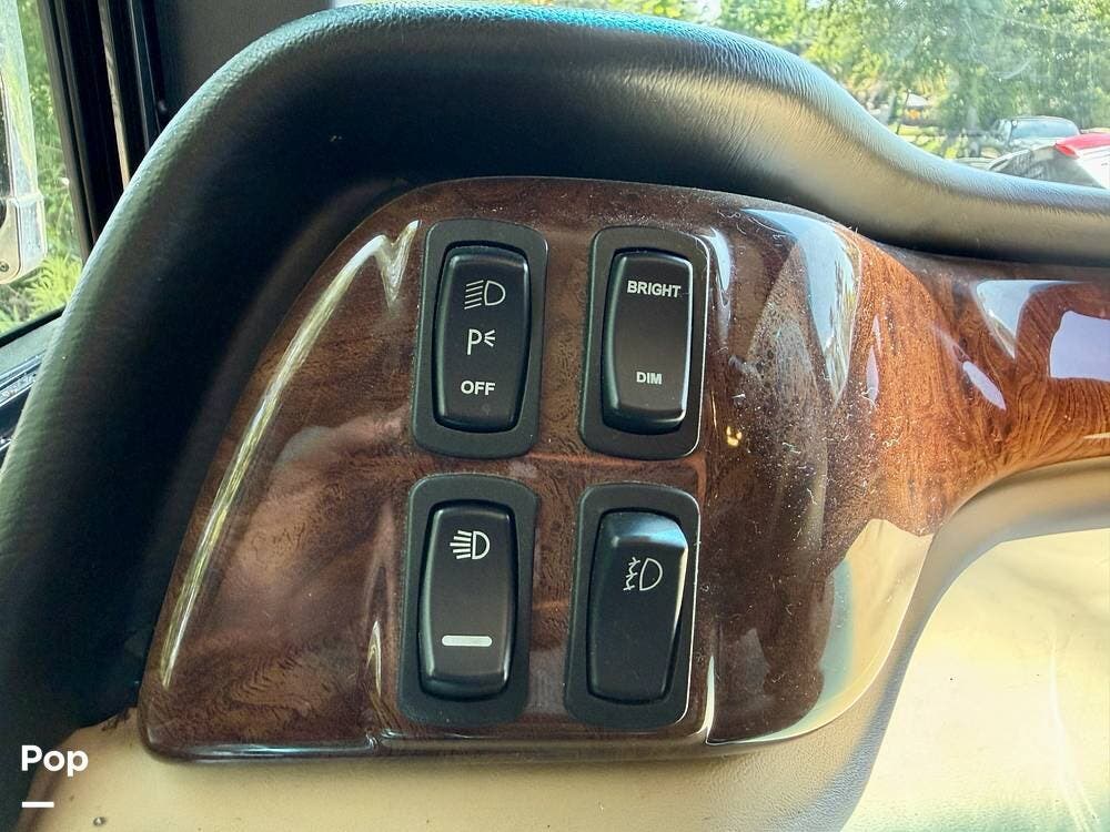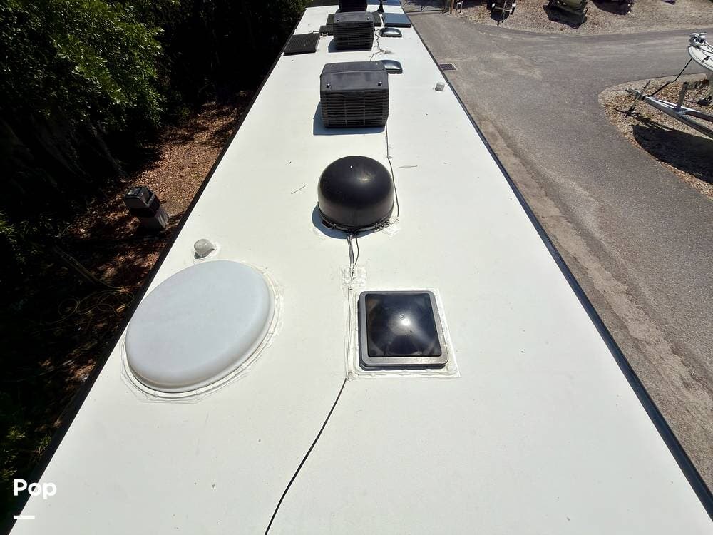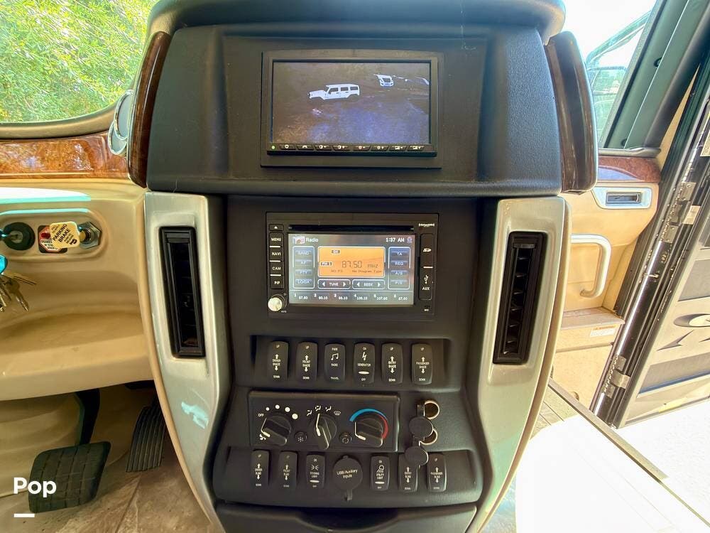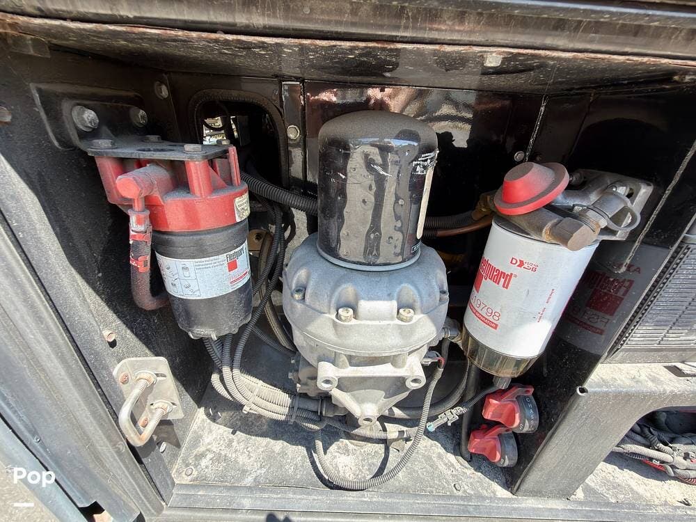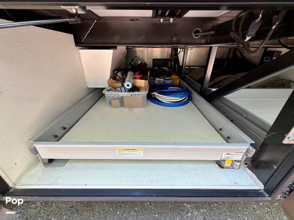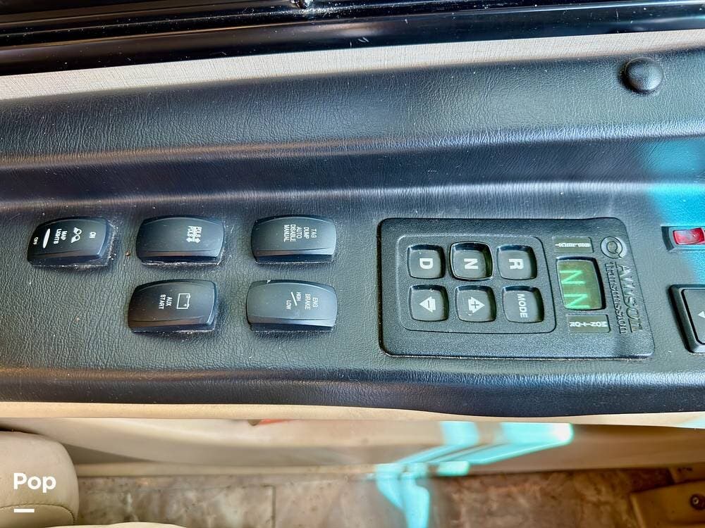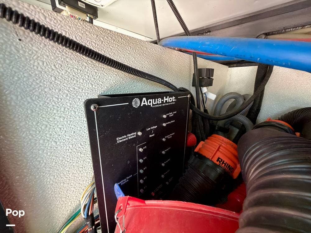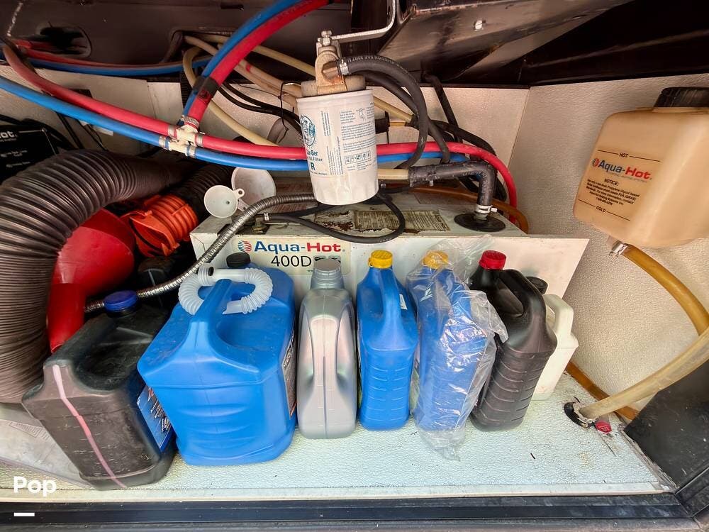 Comfort systems include Aqua-Hot hydronic heating for continuous hot water and efficient interior climate control, along with multiple roof-mounted A/C units. The coach is also equipped with an automatic leveling system that is currently operated manually, a central vacuum system, and an upgraded water filtration setup.