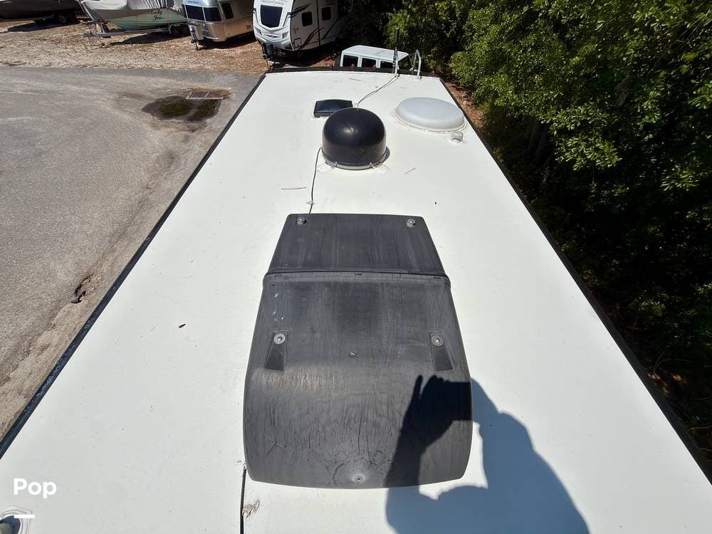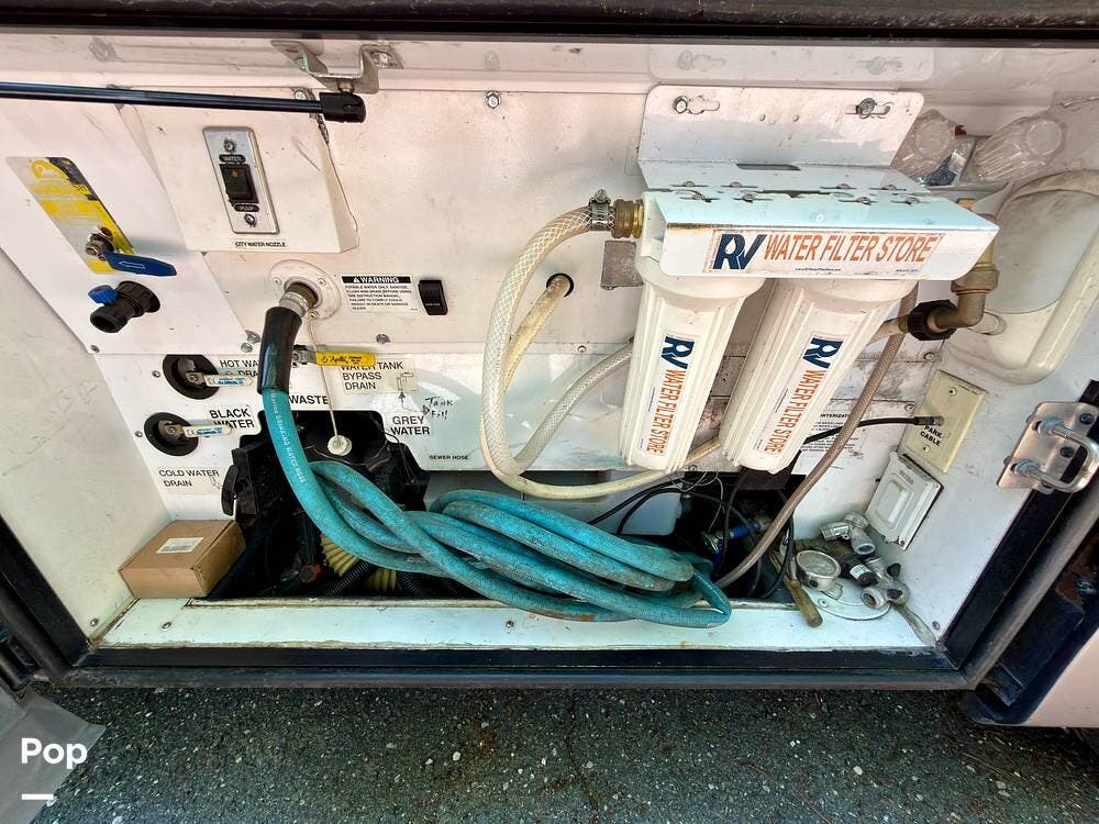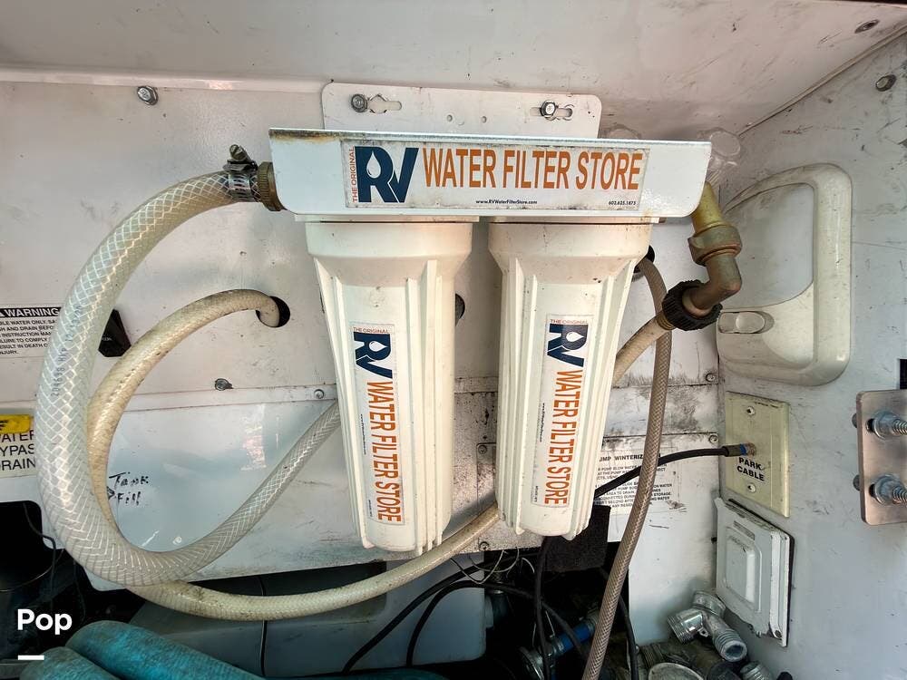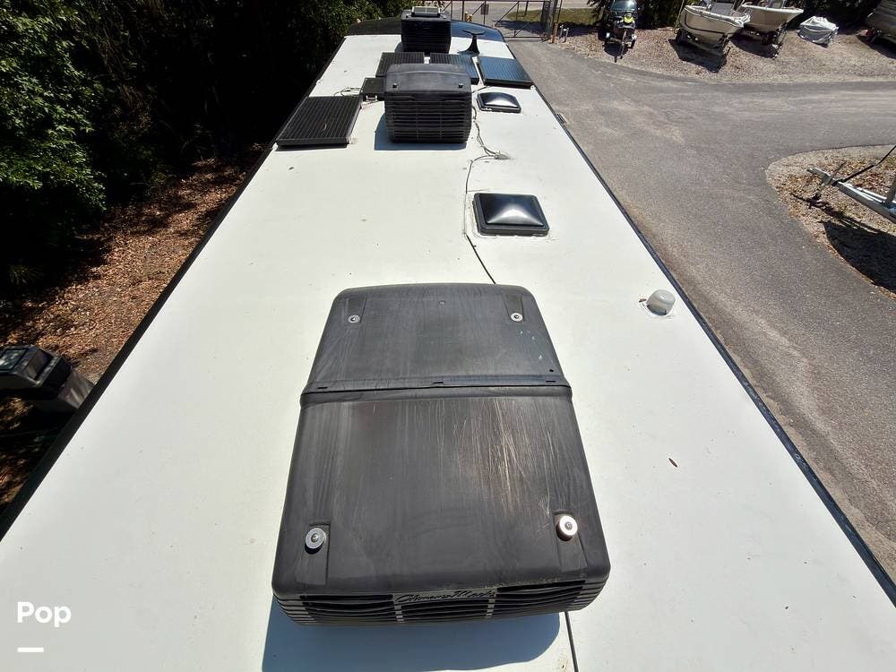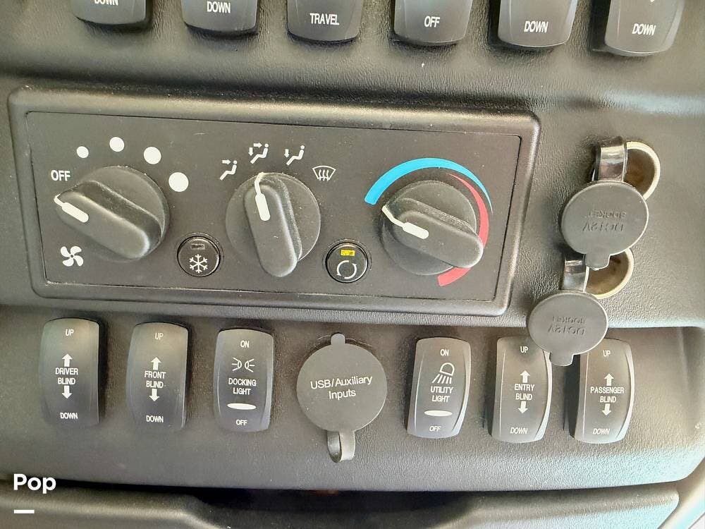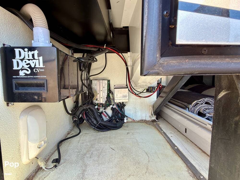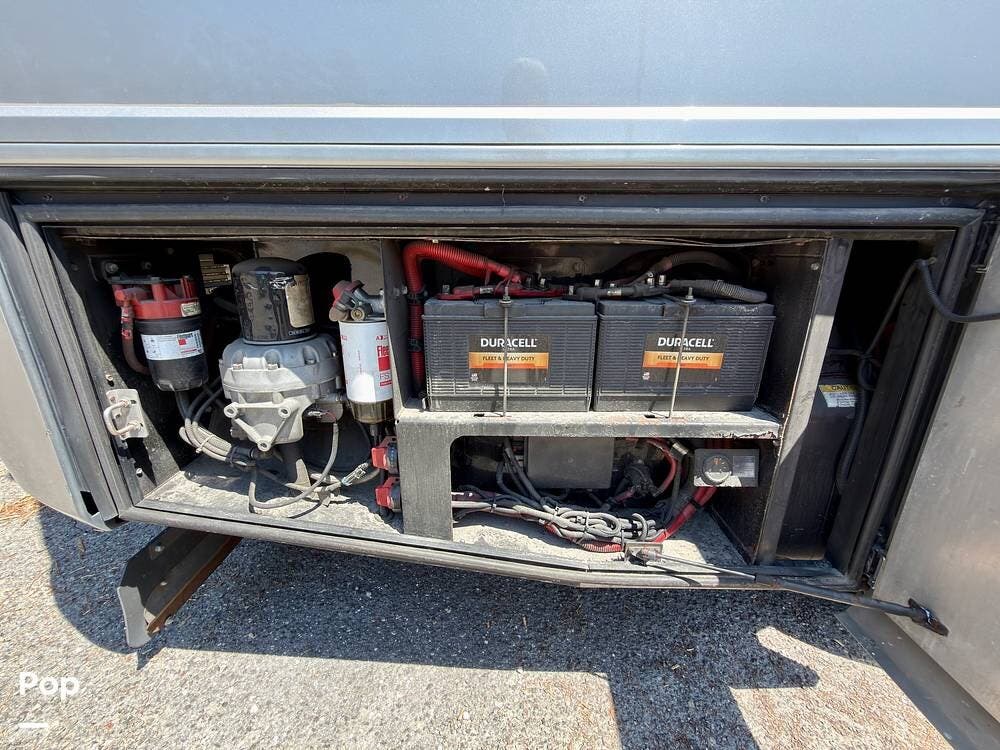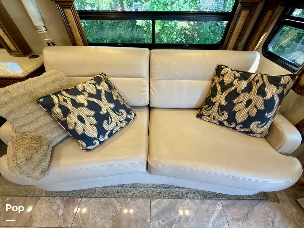 Comfort systems include Aqua-Hot hydronic heating for continuous hot water and efficient interior climate control, along with multiple roof-mounted A/C units. The coach is also equipped with an automatic leveling system that is currently operated manually, a central vacuum system, and an upgraded water filtration setup.