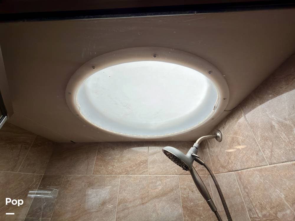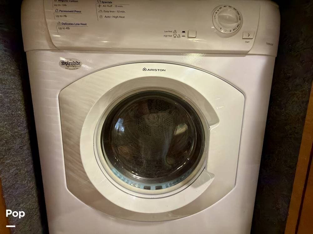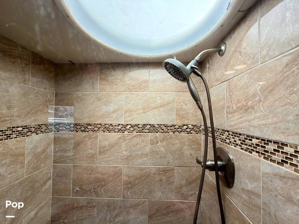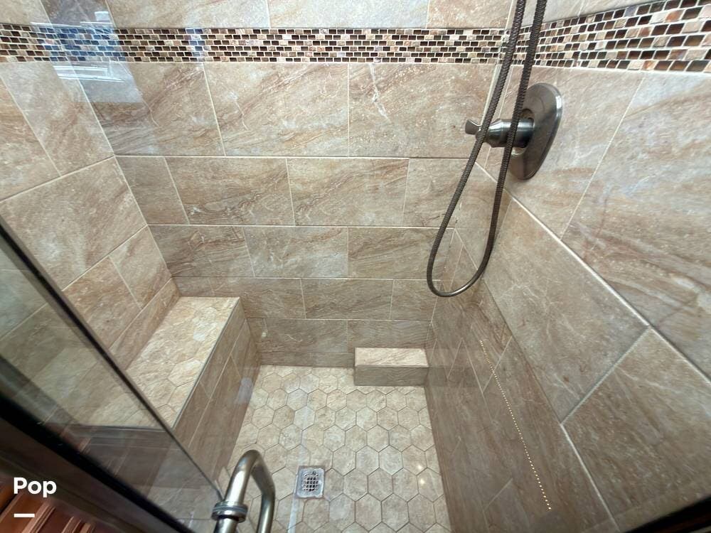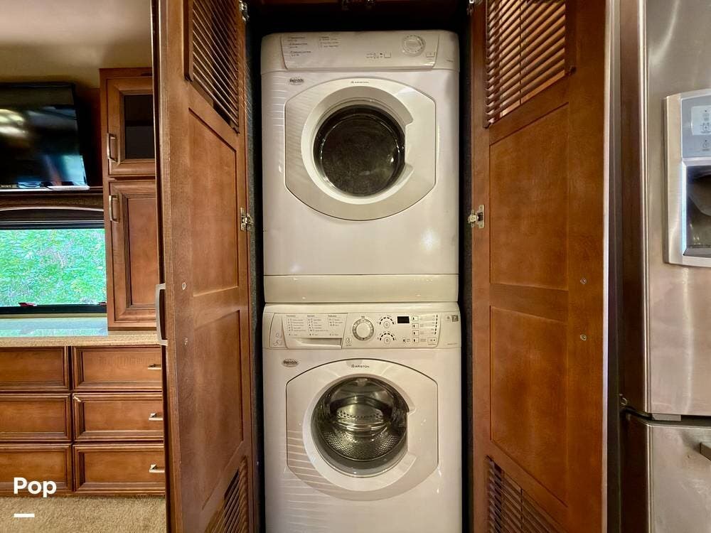 The rear master suite features a king bed and connects to a full rear bathroom with a large shower and residential-style finishes. A stackable washer and dryer are also included, making this coach well-suited for extended stays or full-time use.
