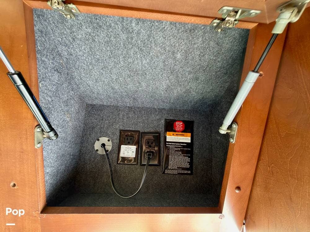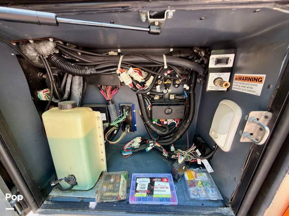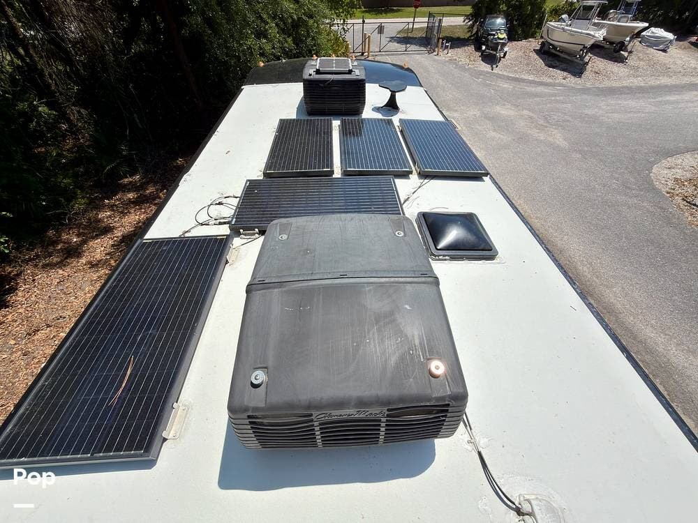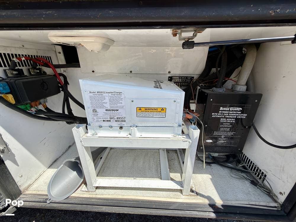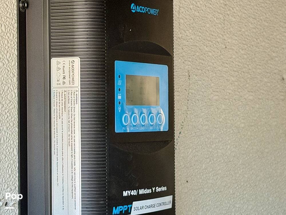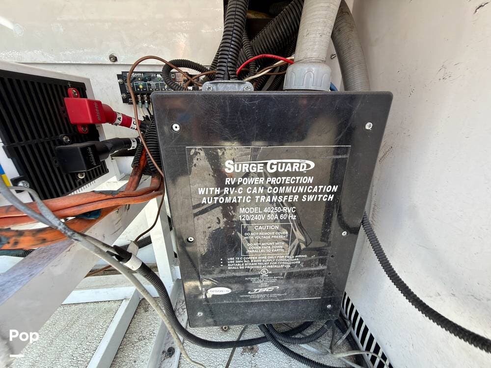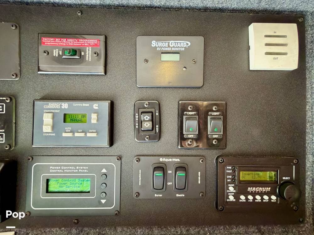One of the standout aspects of this coach is the upgraded all-electric power system. It is equipped with a solar array, lithium (LiFePO4) battery bank, and a Magnum inverter/charger replaced in 2024, along with a Surge Guard automatic transfer switch for added protection. This setup provides strong off-grid capability and modern energy efficiency. A WeBoost cell signal booster system is also installed and fully functional, improving connectivity while traveling or working remotely.