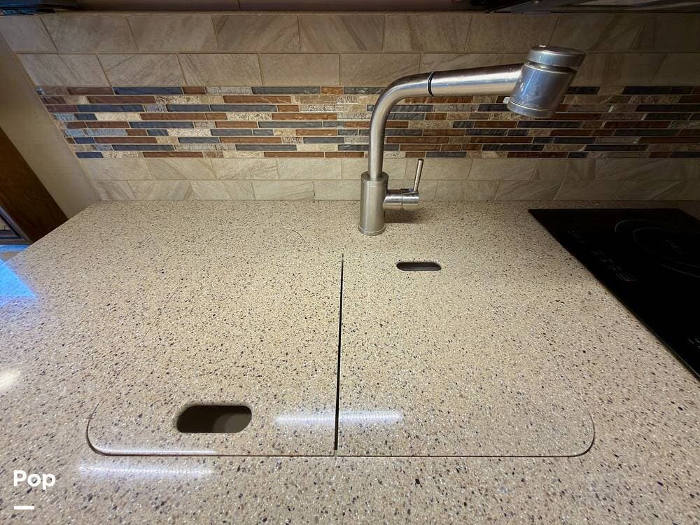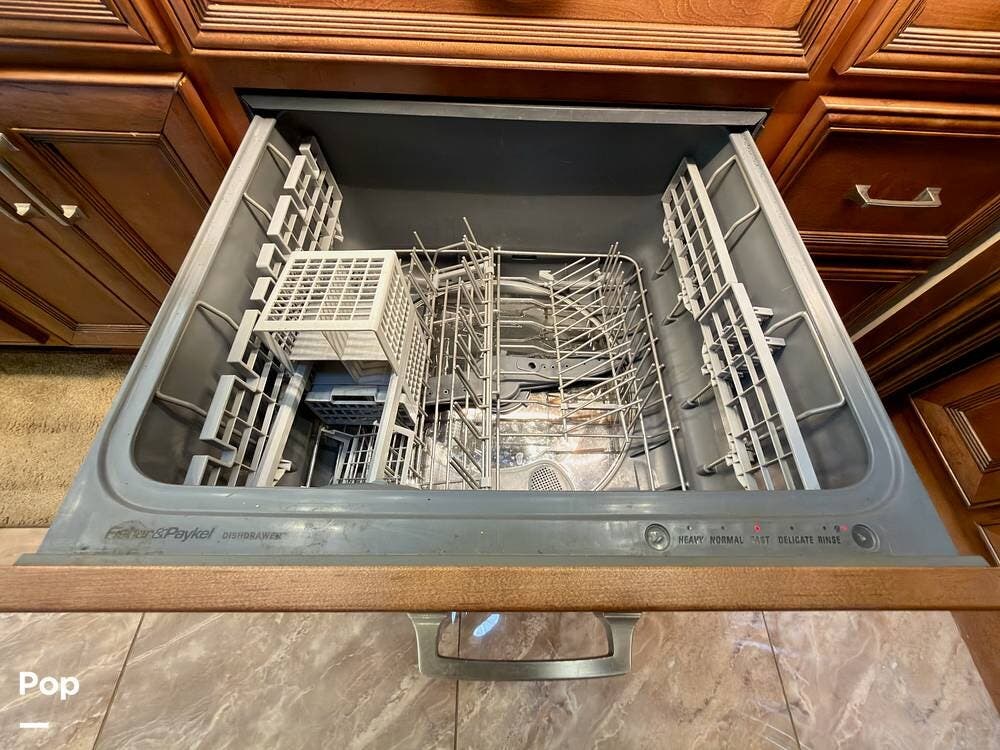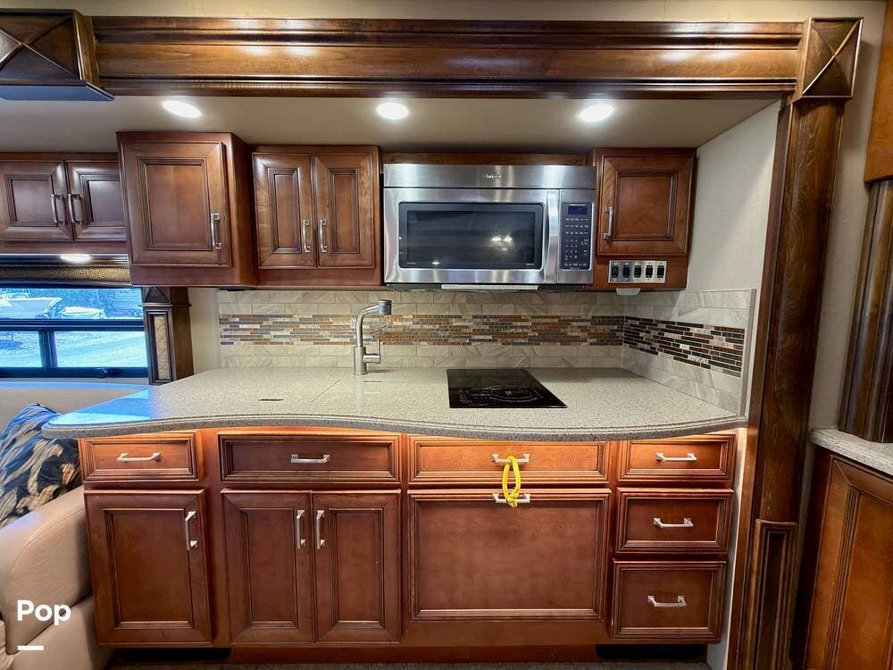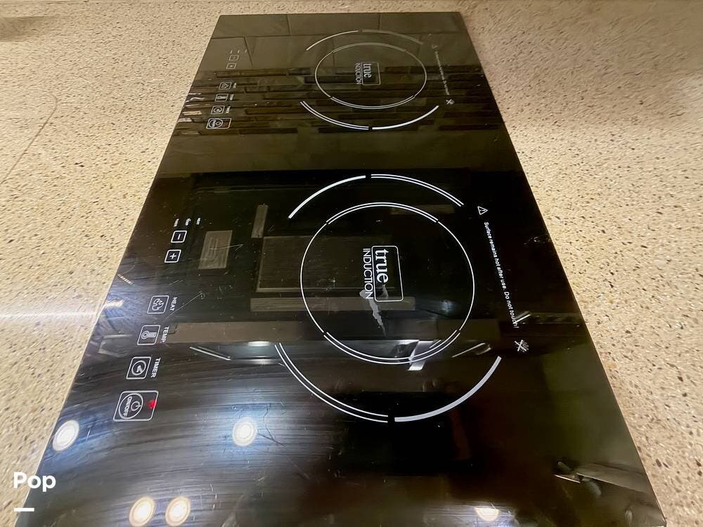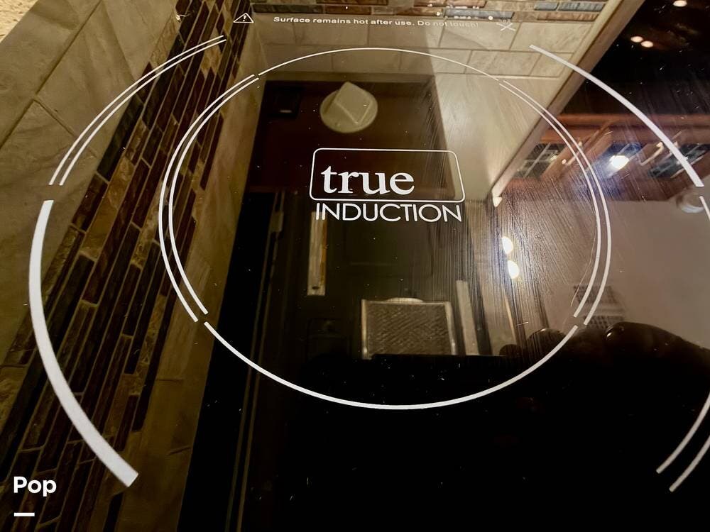 The kitchen is fully equipped with a residential refrigerator, convection microwave, induction cooktop, dishwasher, and generous storage, supporting the coach's all-electric design with no onboard propane system to maintain.