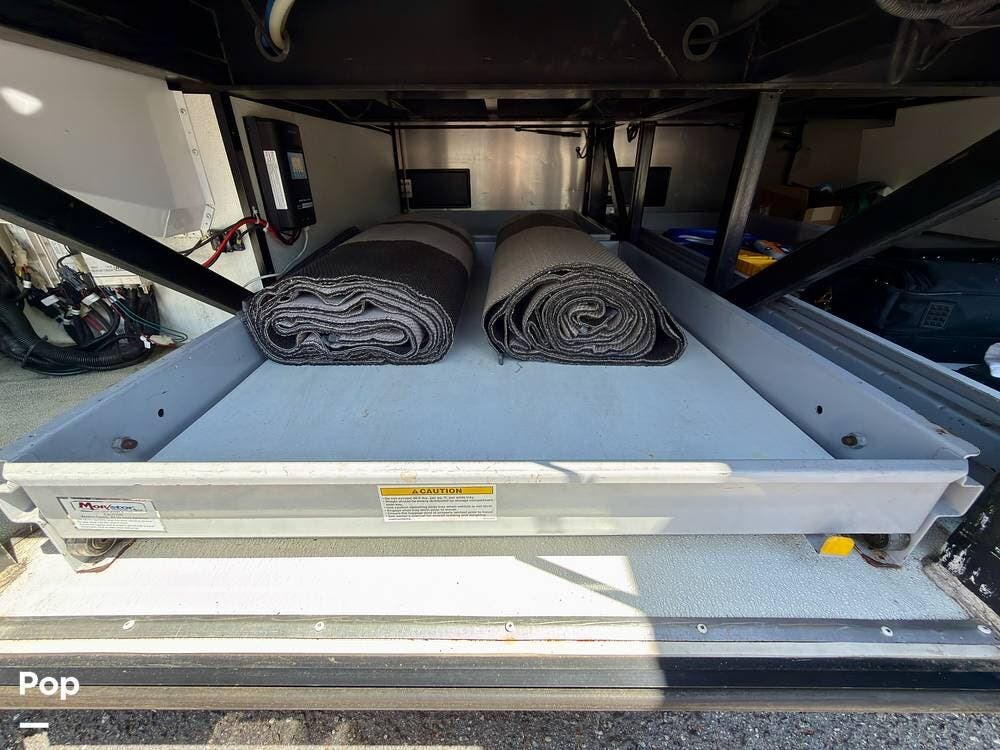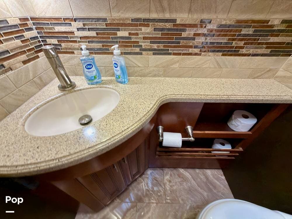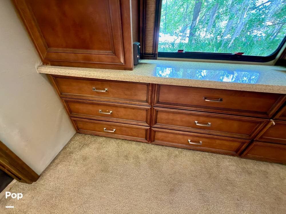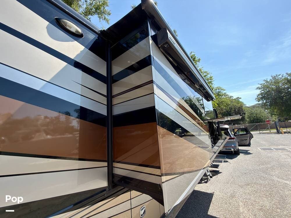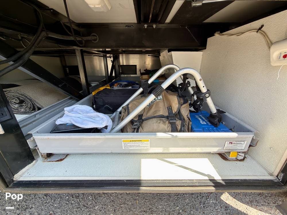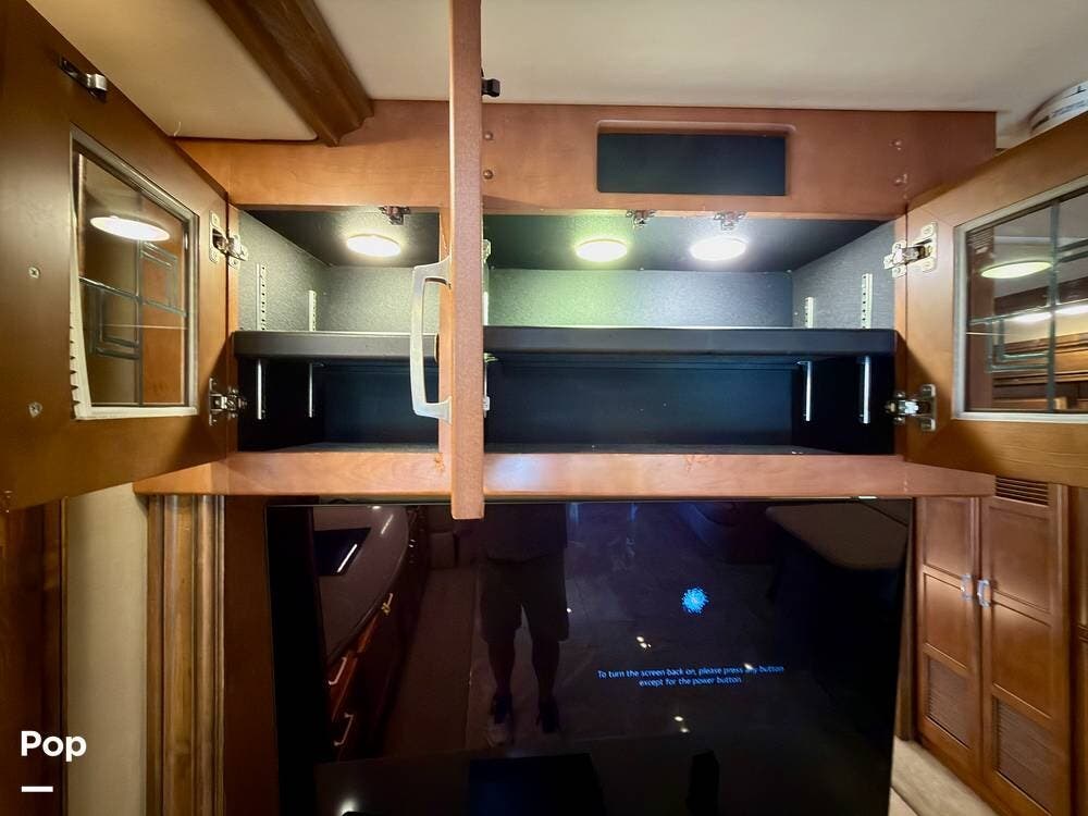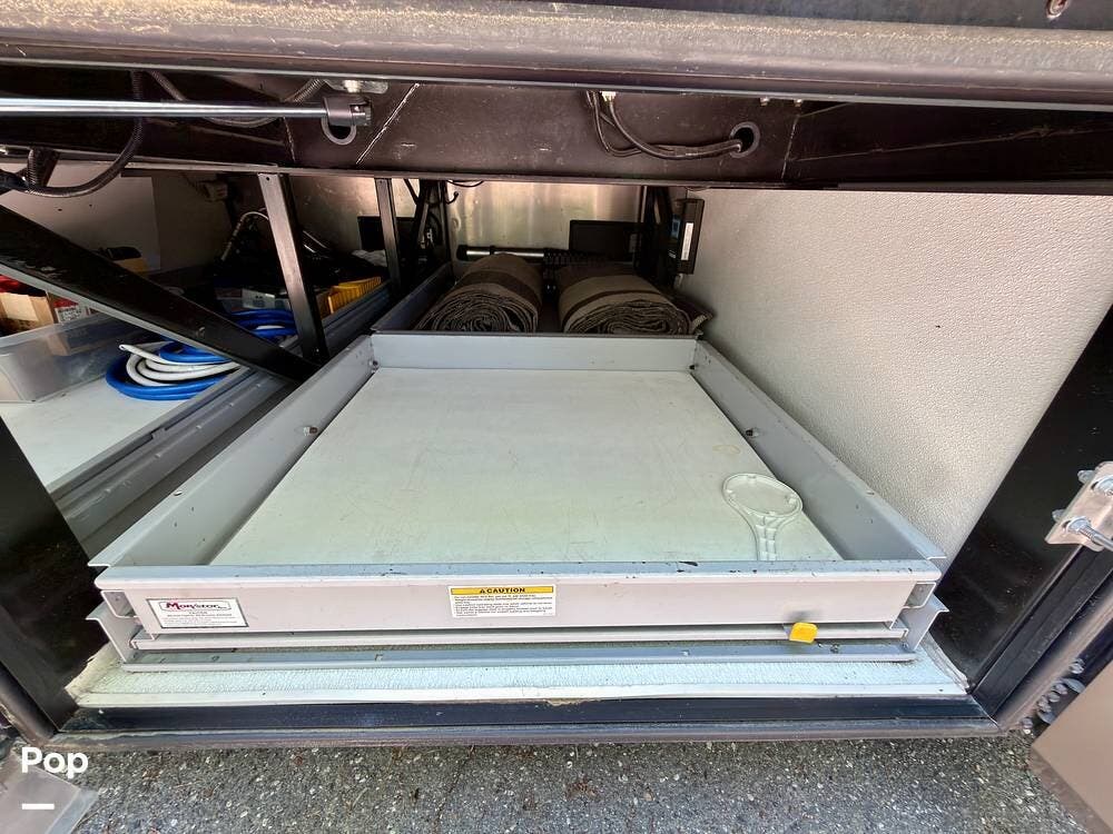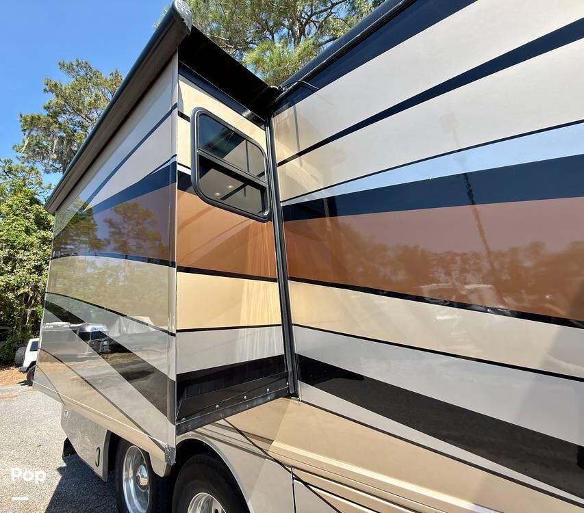 Outside, the coach features full-body paint, tag axle stability, large pass-through basement storage compartments, multiple awnings including slide toppers, and a power entry system. The coach is stored at a secure facility with showings available by appointment.