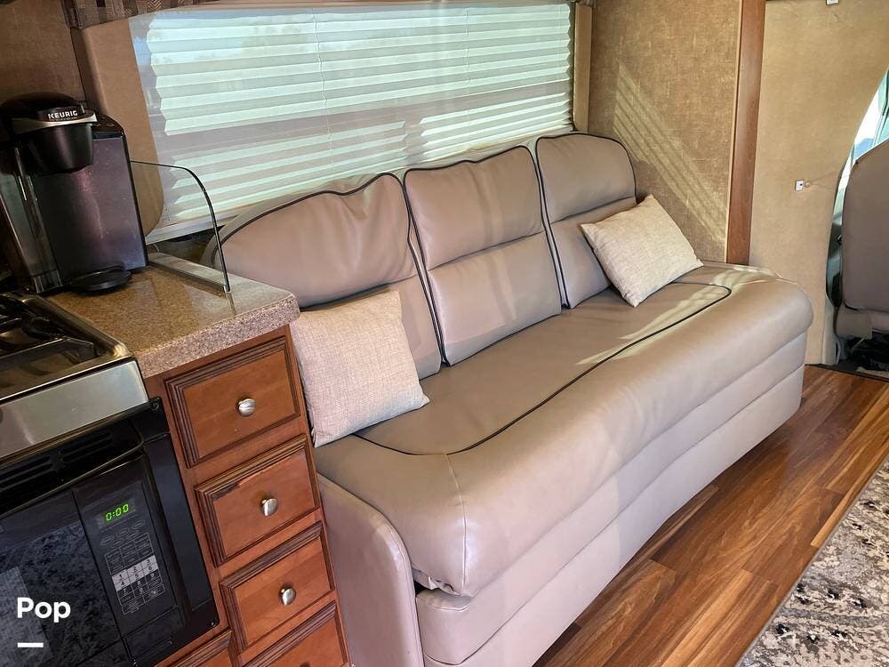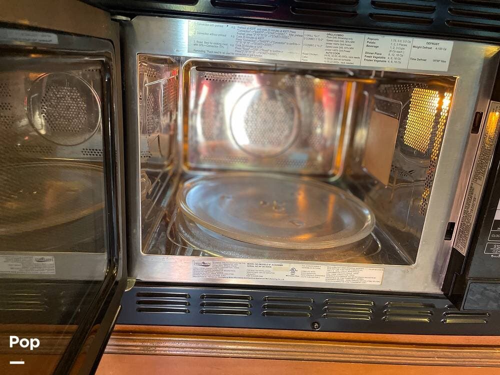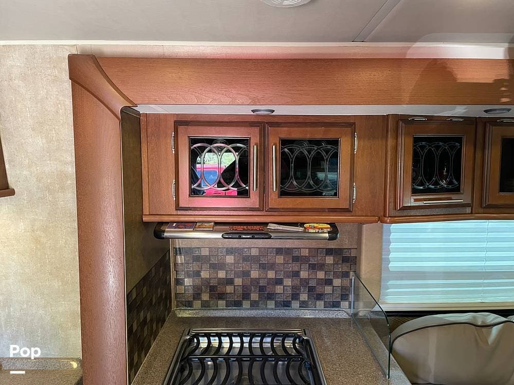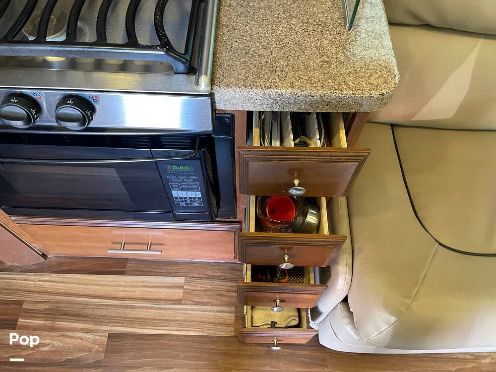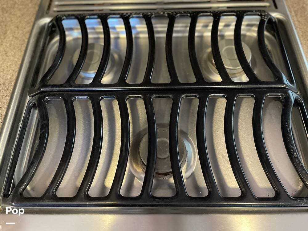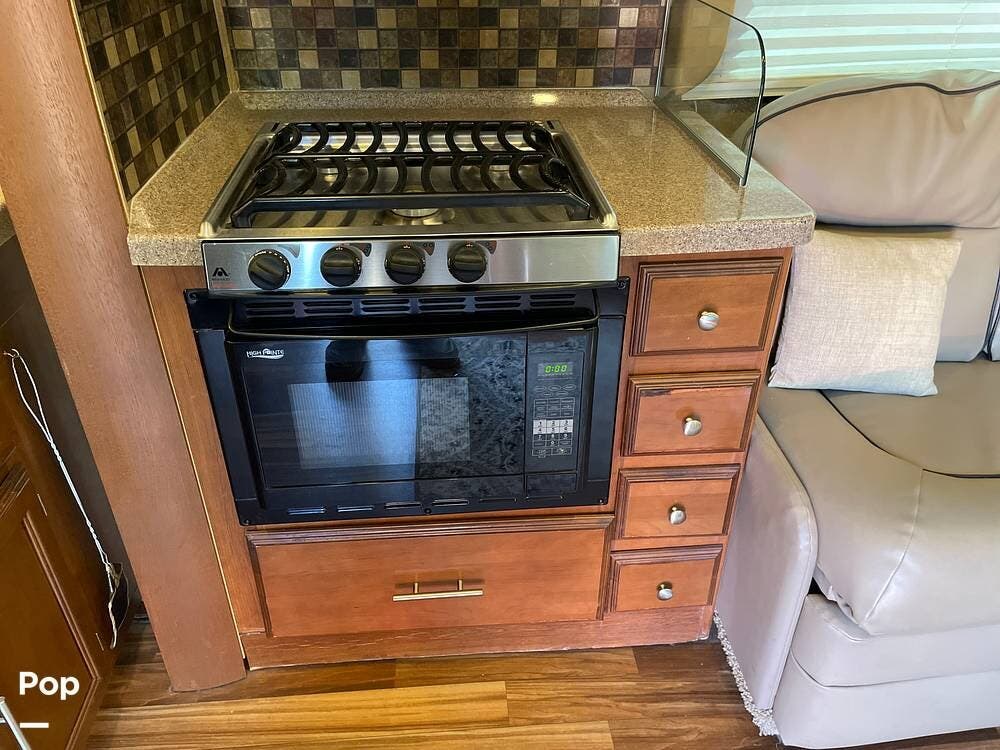 You'll also find leatherette seating, a convertible dinette, a flat-screen TV, a DVD player, and a surround sound system. The kitchen features a three-burner stove, convection microwave, and double-door refrigerator -- perfect for preparing meals on the go.