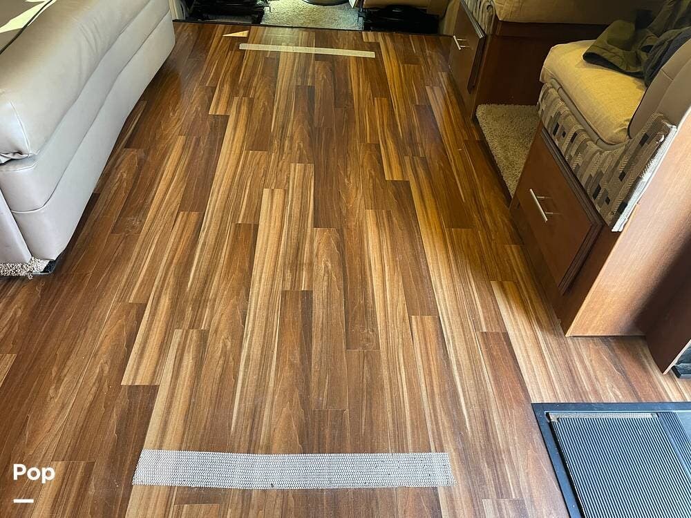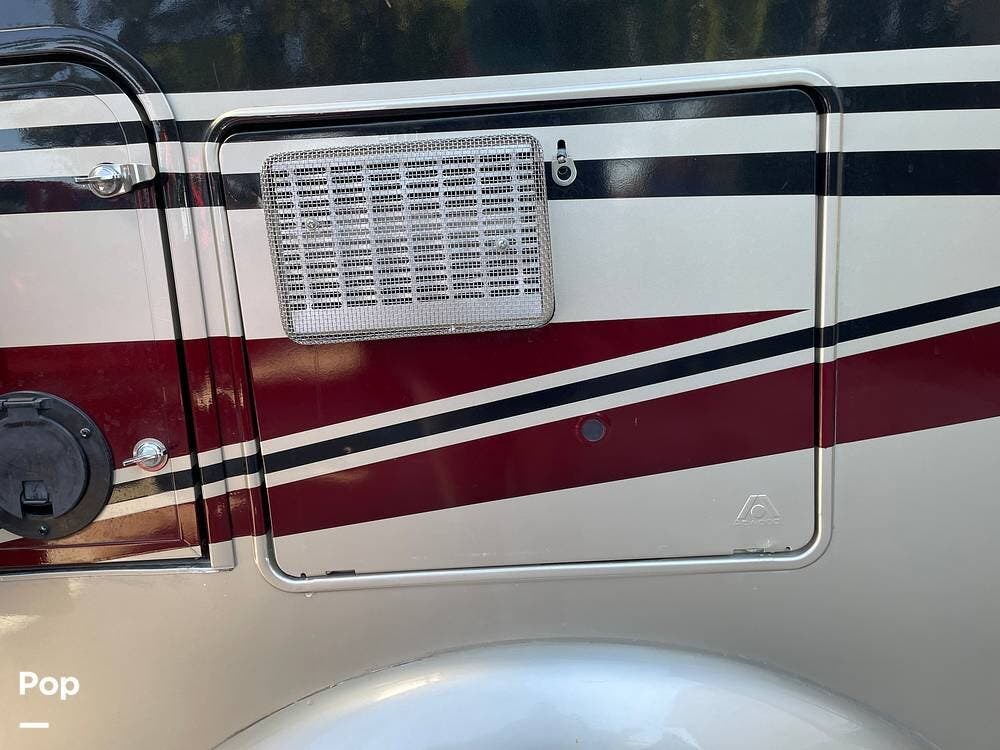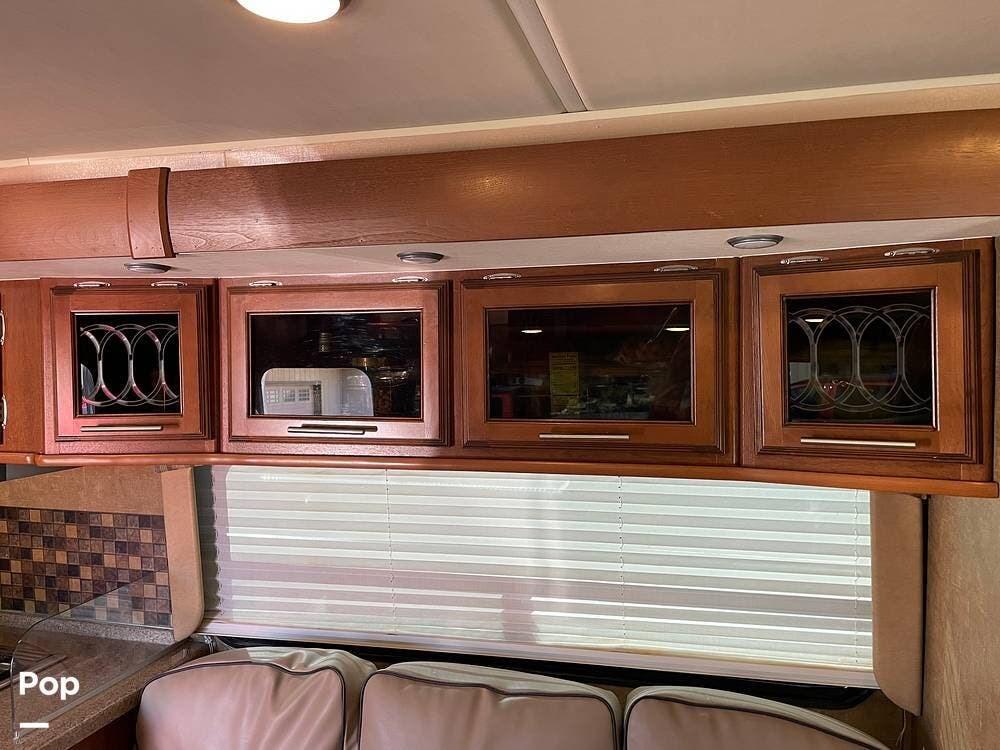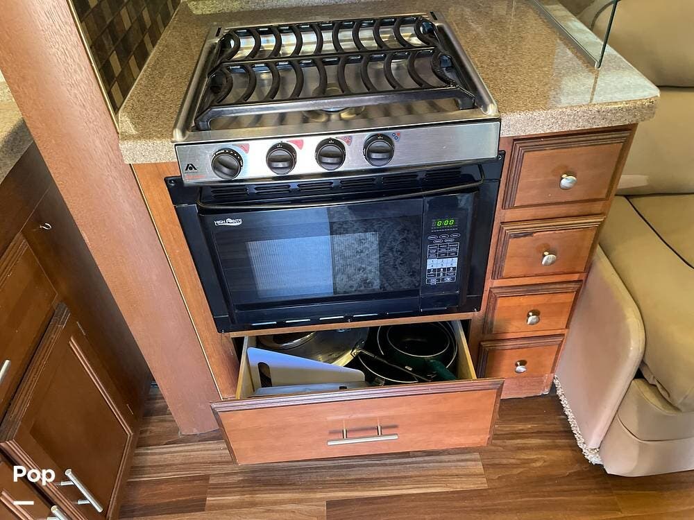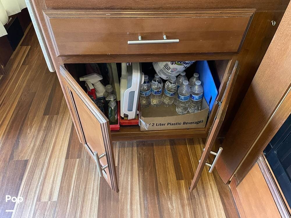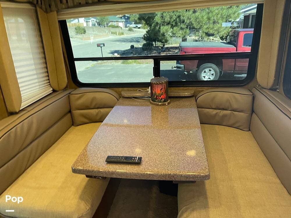 You'll also find leatherette seating, a convertible dinette, a flat-screen TV, a DVD player, and a surround sound system. The kitchen features a three-burner stove, convection microwave, and double-door refrigerator -- perfect for preparing meals on the go.
