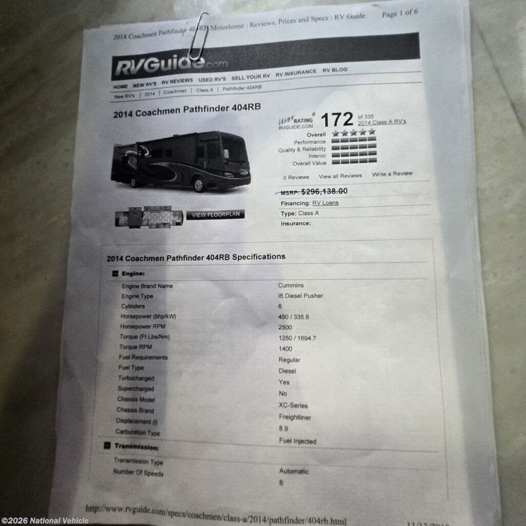 Request More Info on this 2014 Coachmen Cross Country 404RB Offered for sale by National Vehicle