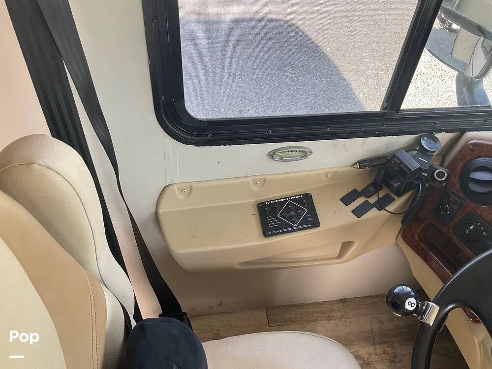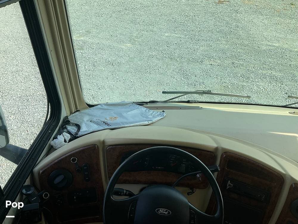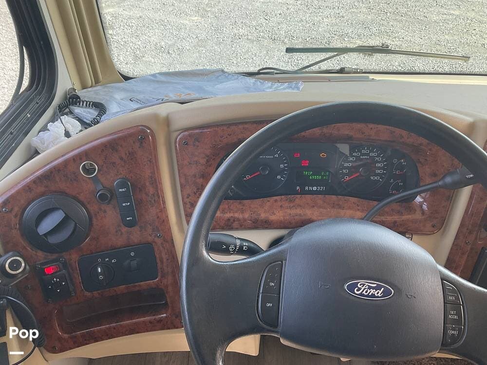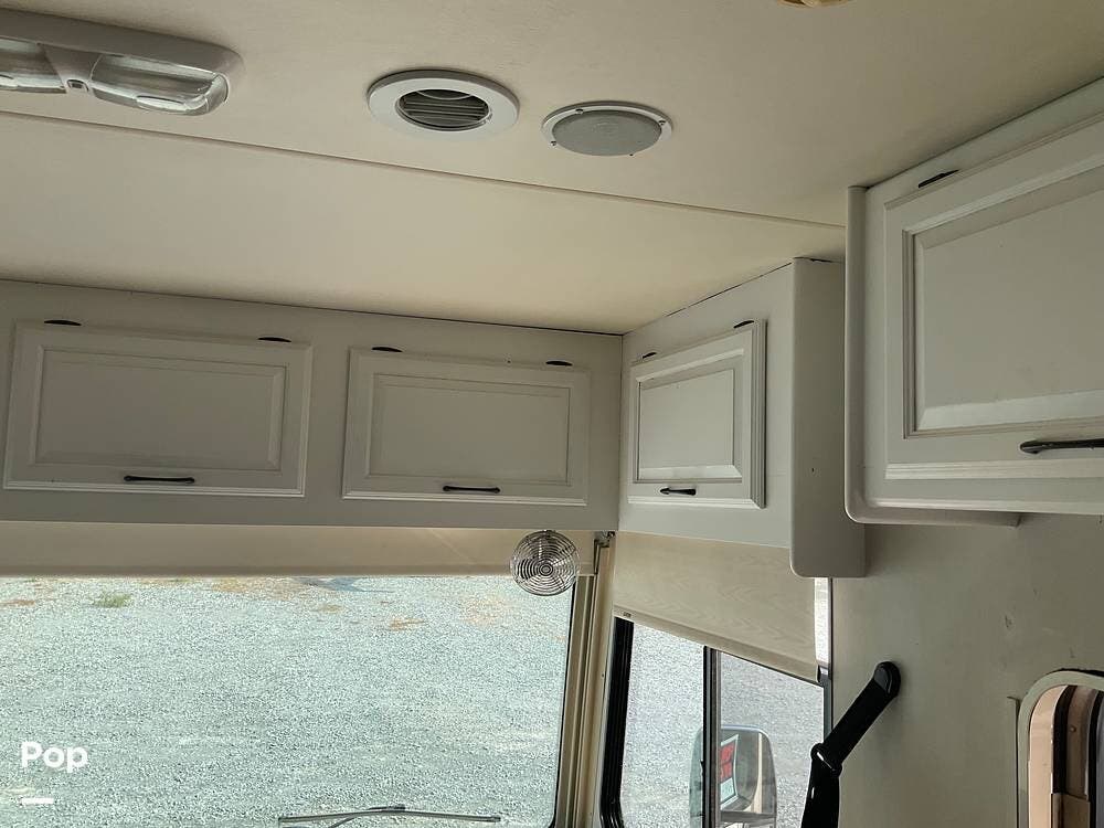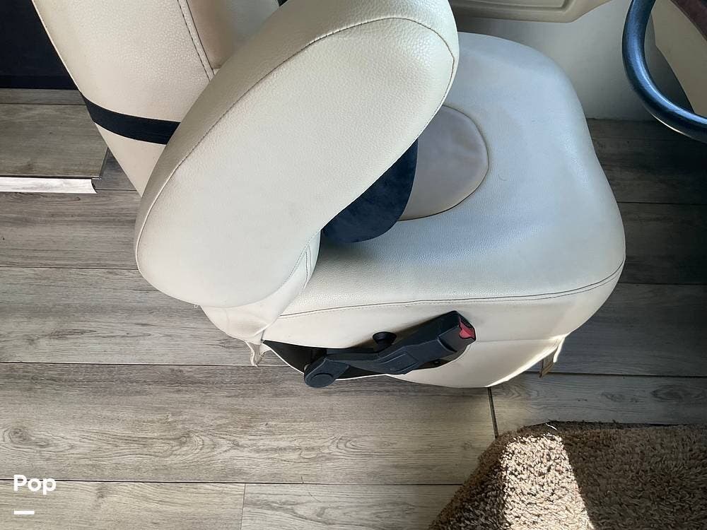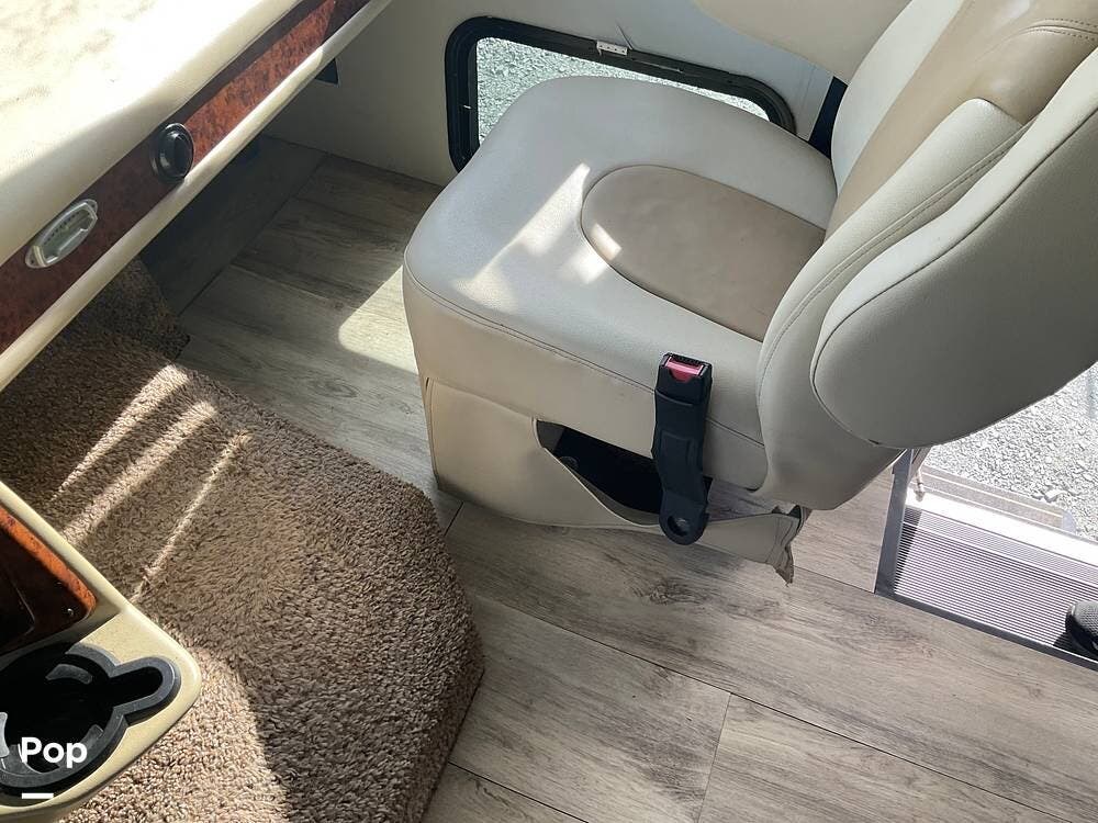 Walking around the RV, you will see the cockpit with dual captain chairs, cruise control, intermittent wipers, and dash A/C.
