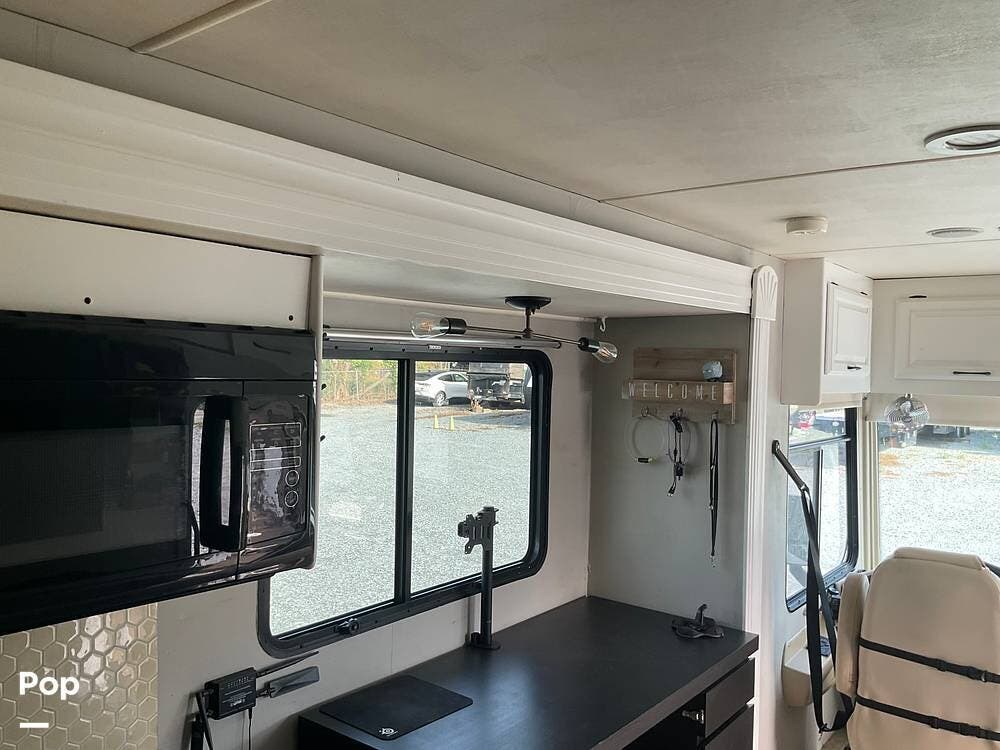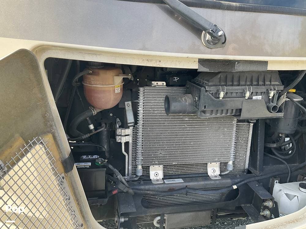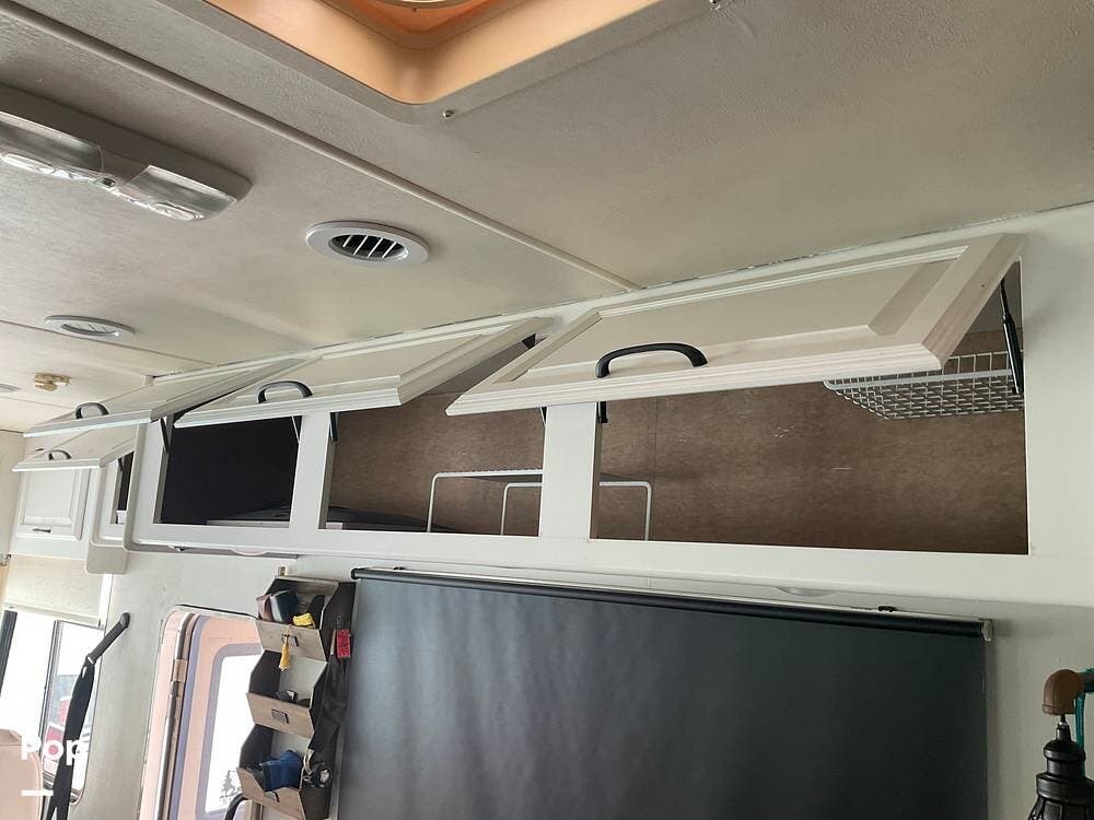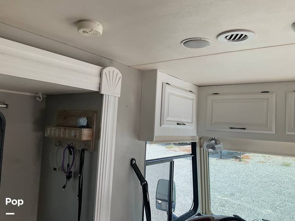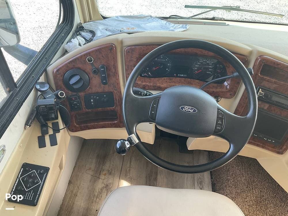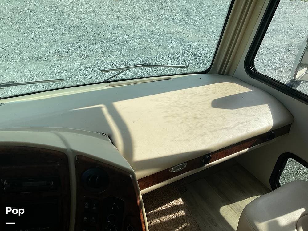 Walking around the RV, you will see the cockpit with dual captain chairs, cruise control, intermittent wipers, and dash A/C.