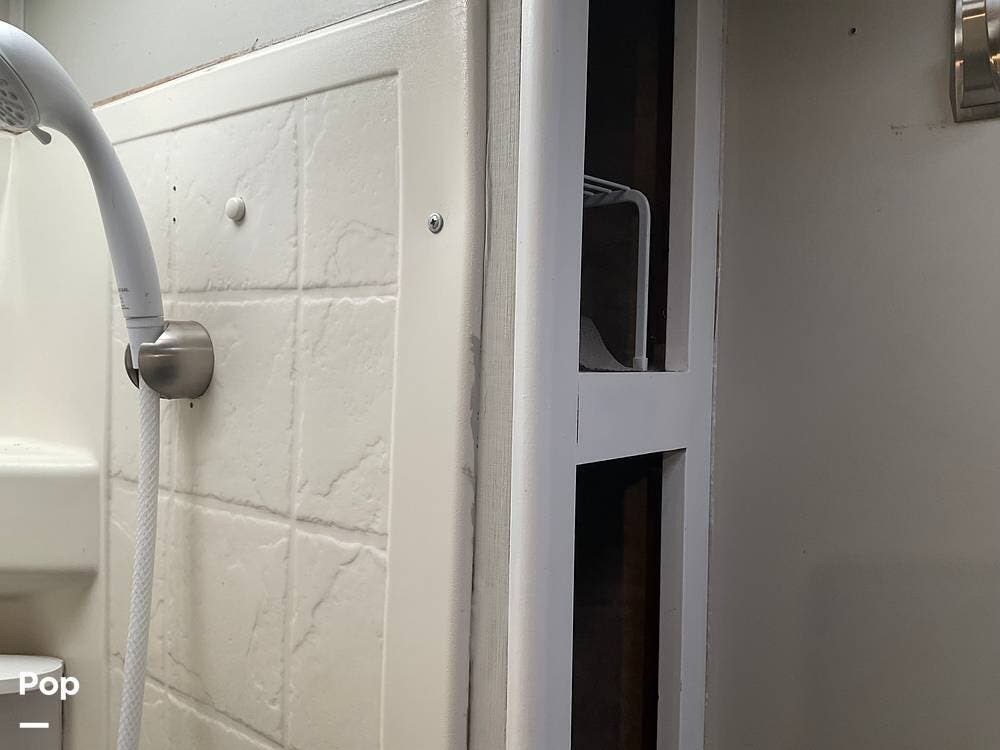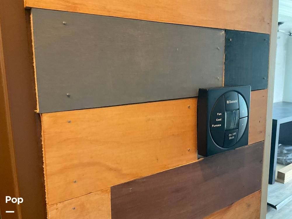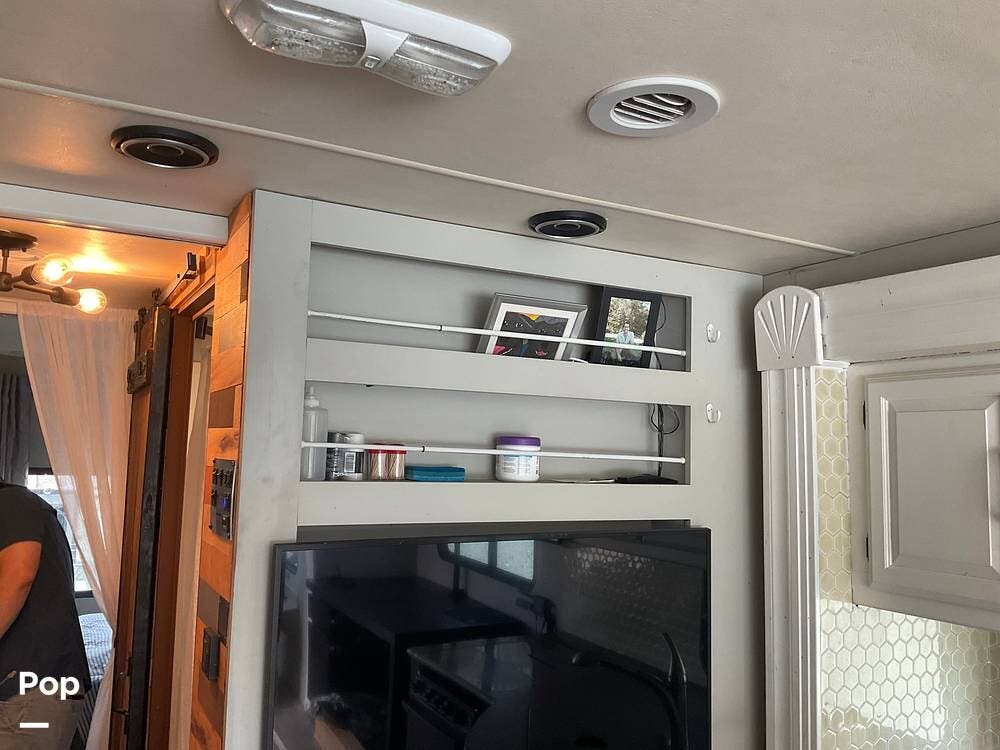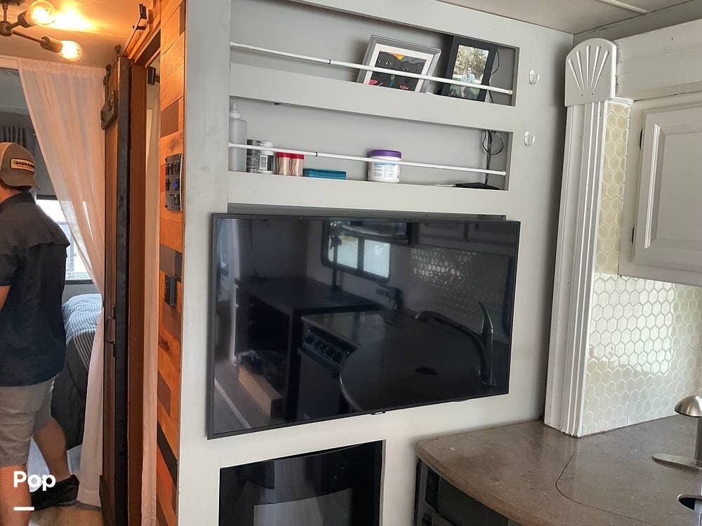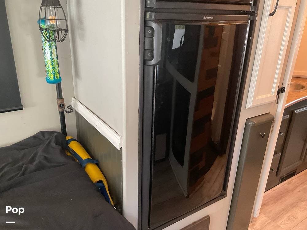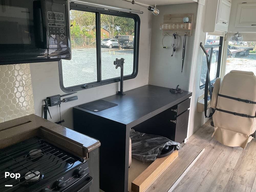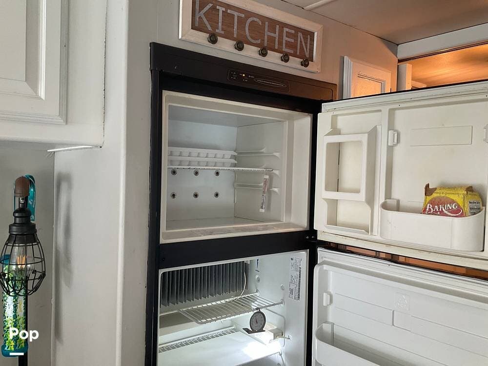Walking through the front door, you'll find a desk where the dinette used to be. This leads into a kitchen equipped with a three-burner gas stovetop. Midway through the RV, you'll find a midsize refrigerator.