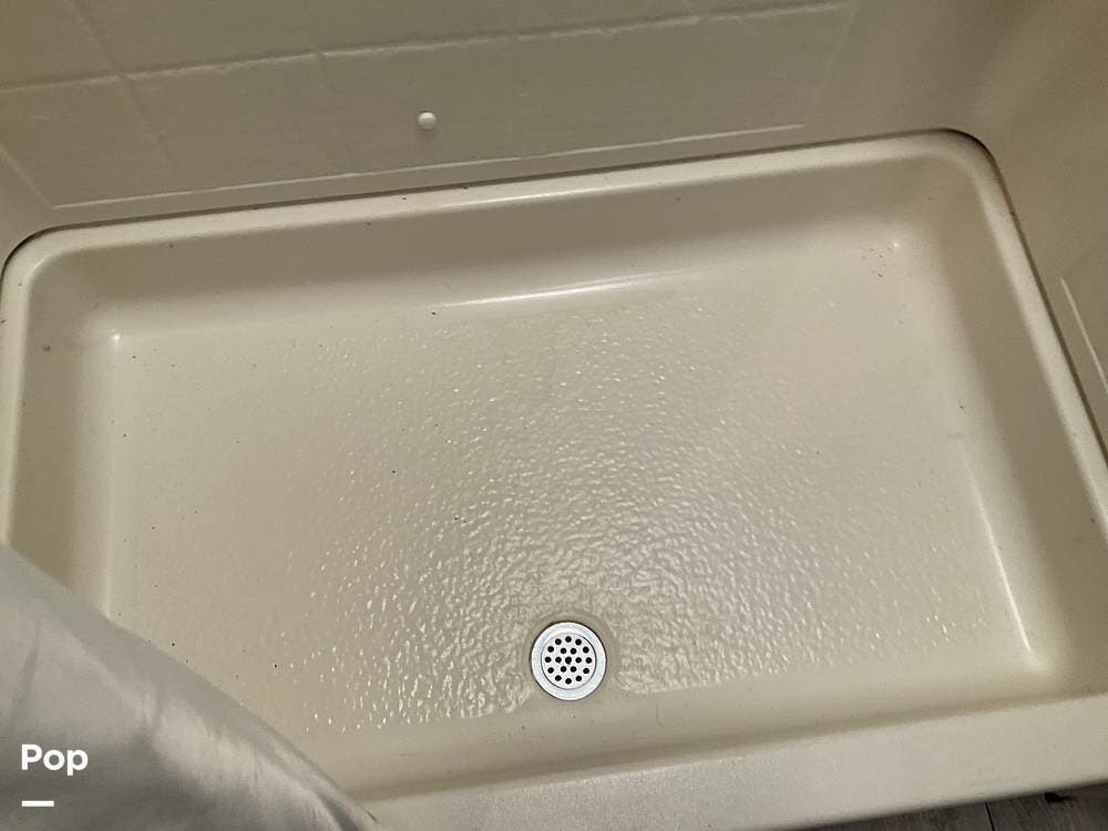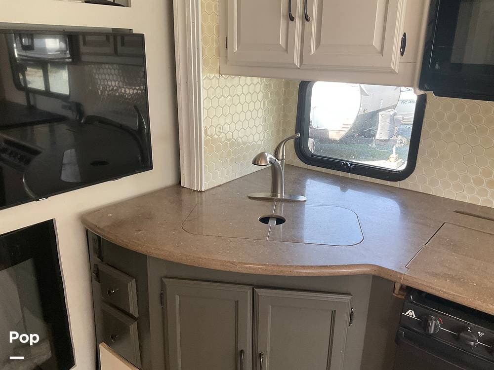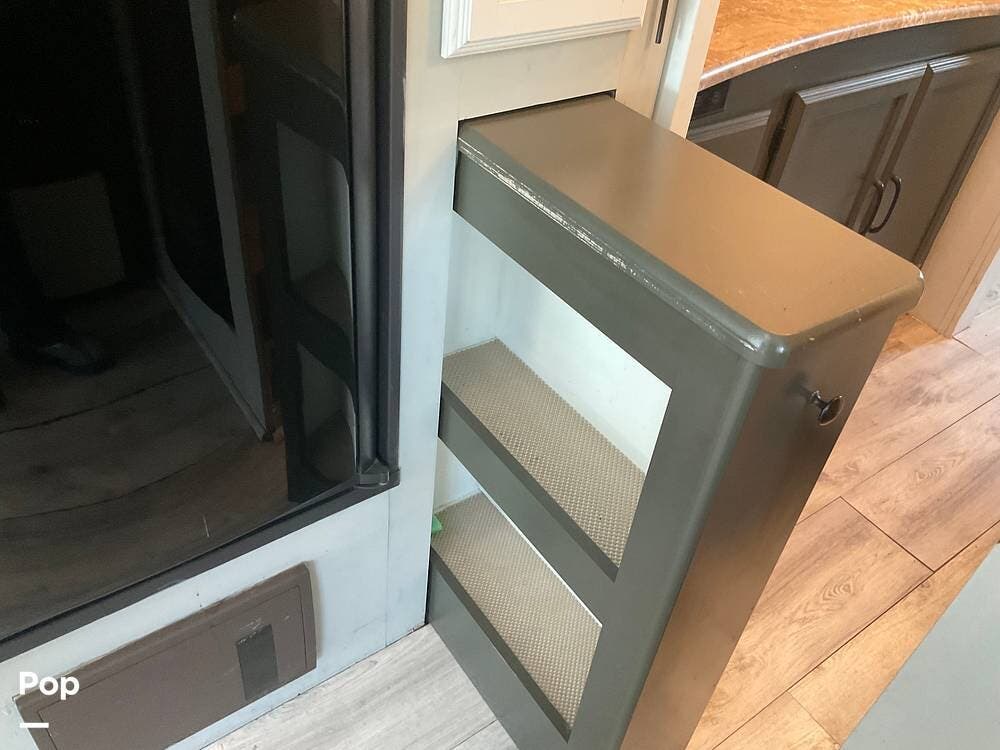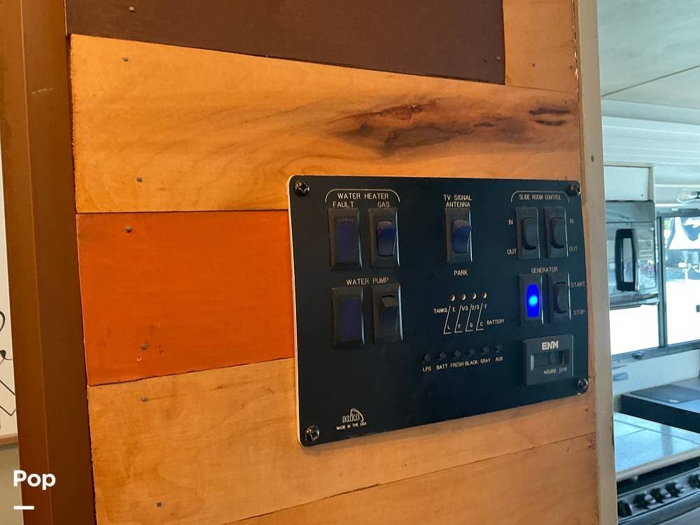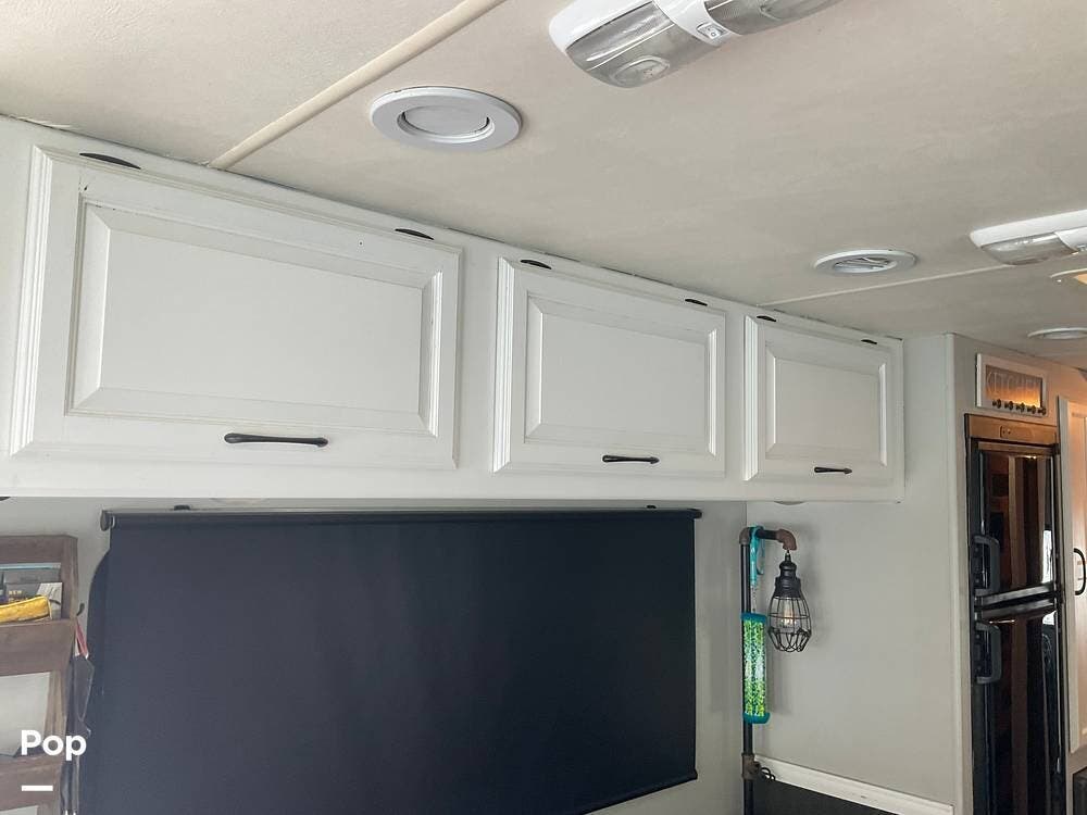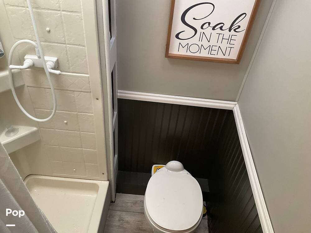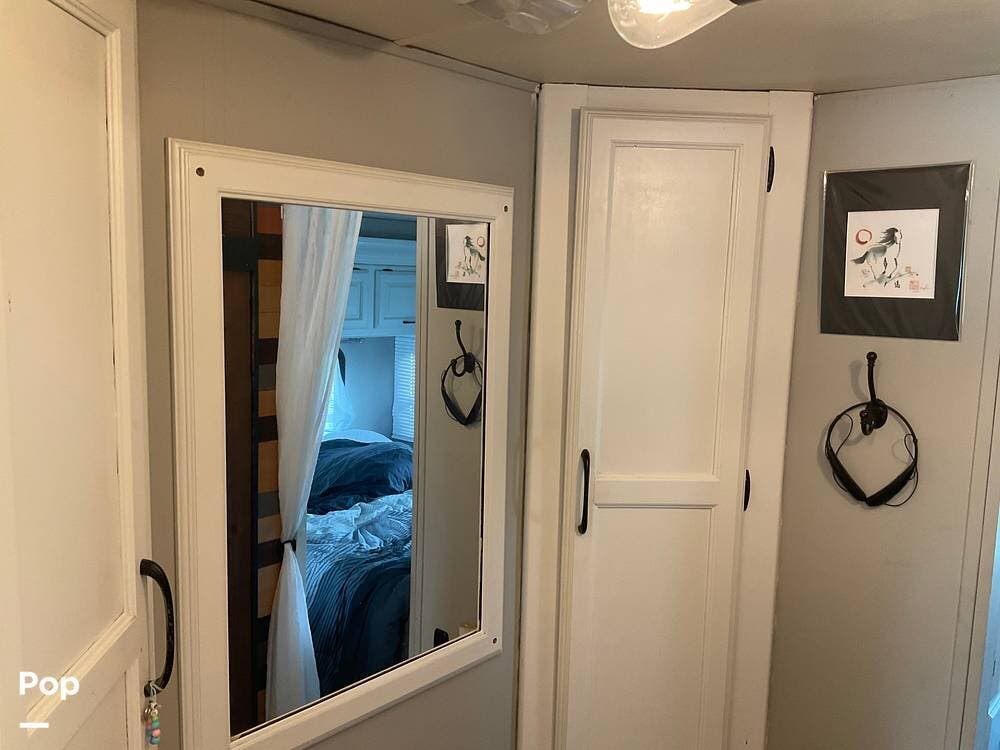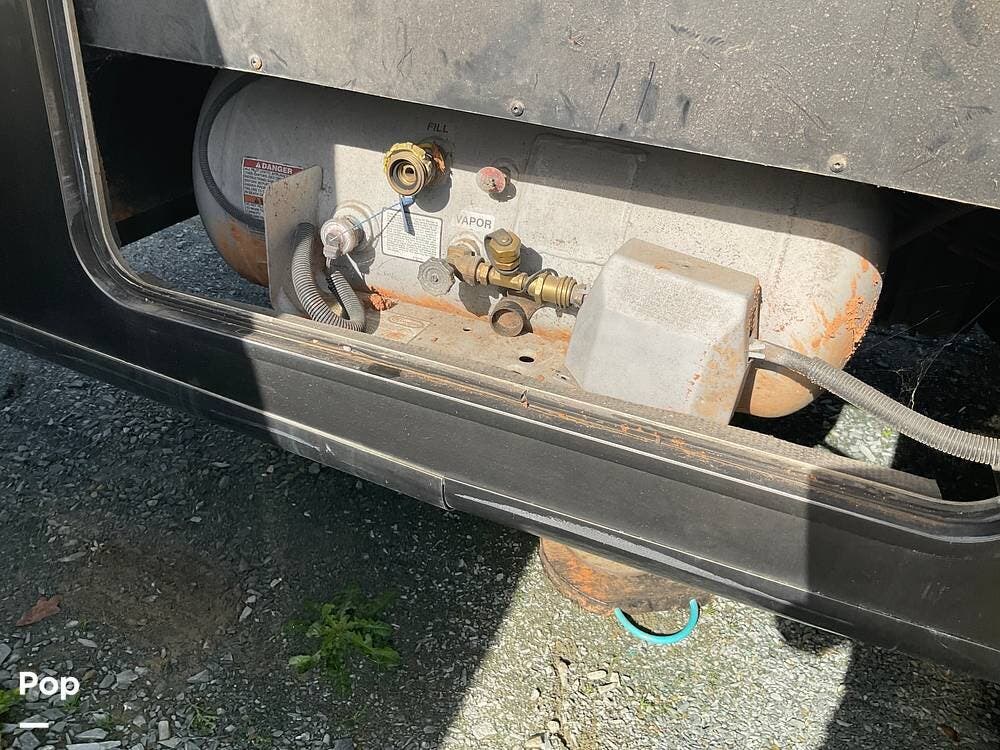 Walking through the front door, you'll find a desk where the dinette used to be. This leads into a kitchen equipped with a three-burner gas stovetop. Midway through the RV, you'll find a midsize refrigerator.