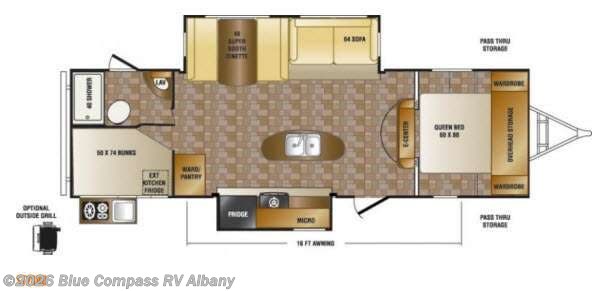 To the left of the entrance there is a slide with a microwave, three burner range, and refrigerator. Next to the slide you will find a large wardrobe/pantry. The opposite side of the travel trailer has a super booth dinette and a sofa slide. The kitchen island provides additional counter space and a double kitchen sink. Along the front wall in the main living area you will find an entertainment center.